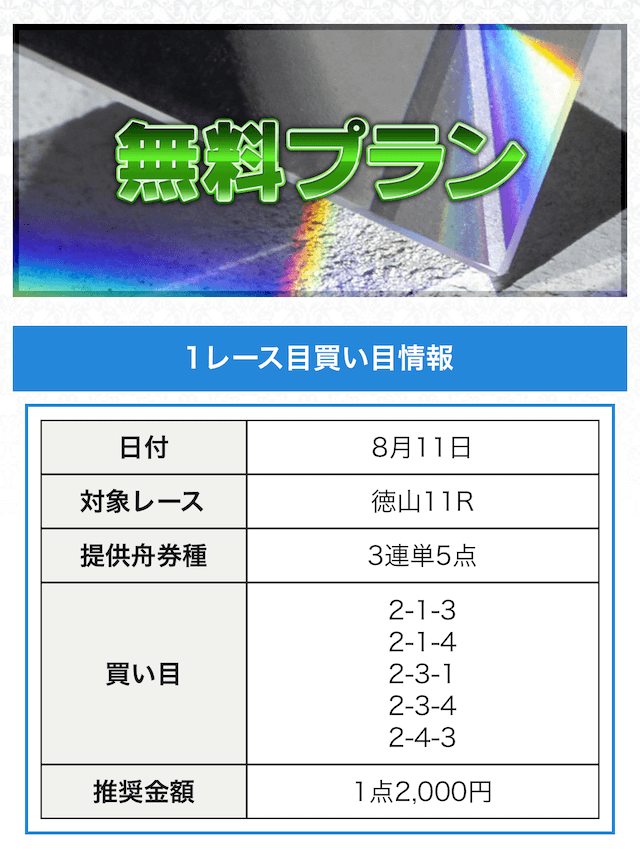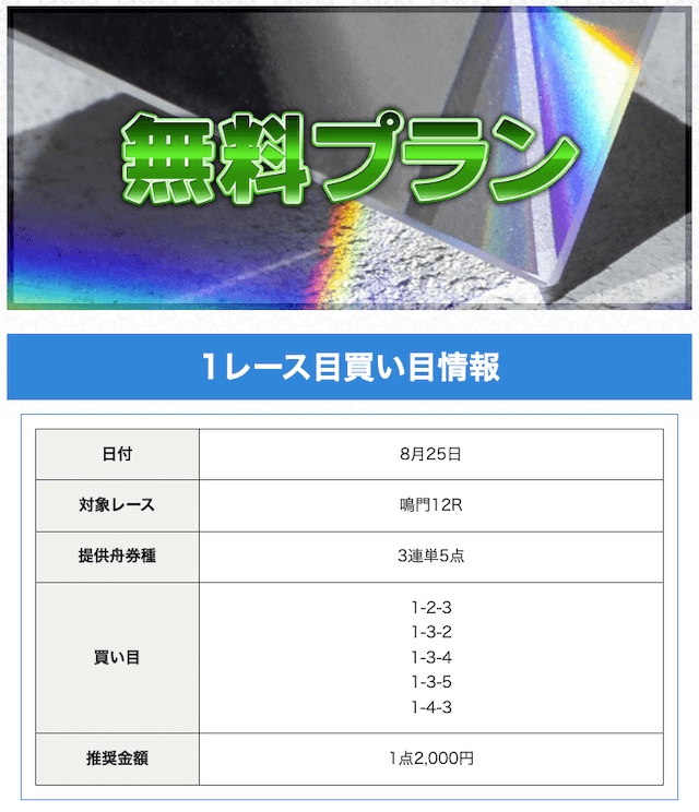 無料予想が1日1レースだけって物足りない…せっかく登録したのに、たった1Rだけは少なすぎる。他サイトだと2〜3レースは出してるところもあるのに。投稿日:2025/03/11