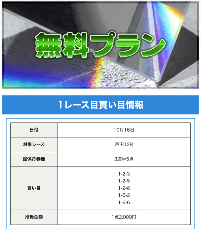 - 無料予想が当たる競艇予想サイトの有料予想はやっぱり凄いね!爆発力が凄くて払い戻しに満足しています。個人的にオススメなのはゴールドかな!ここまで2戦2勝ときていて、総額150万円以上は稼ぐことができています。皆さんがオススメするプランがあれば教えてください〜。投稿日:2023/10/04