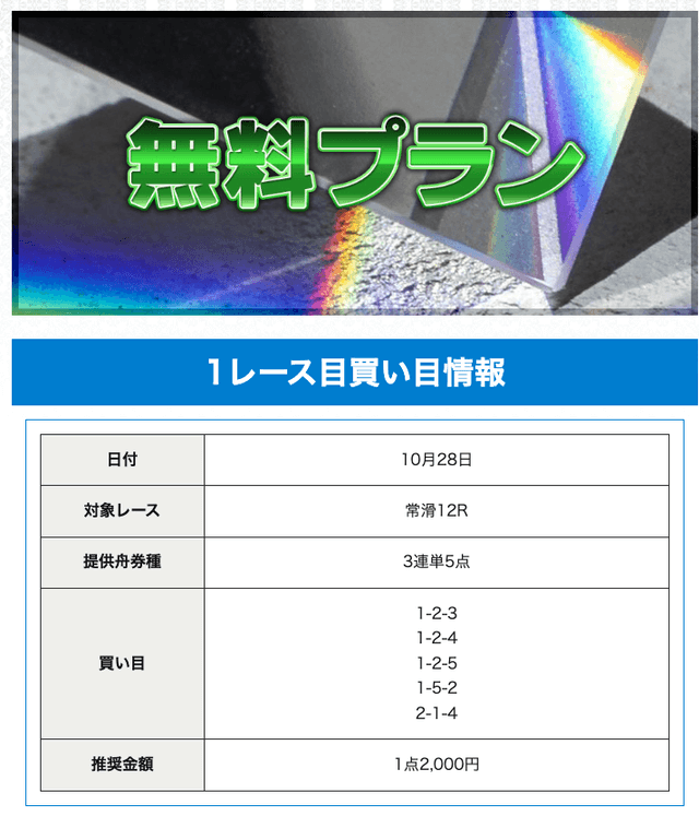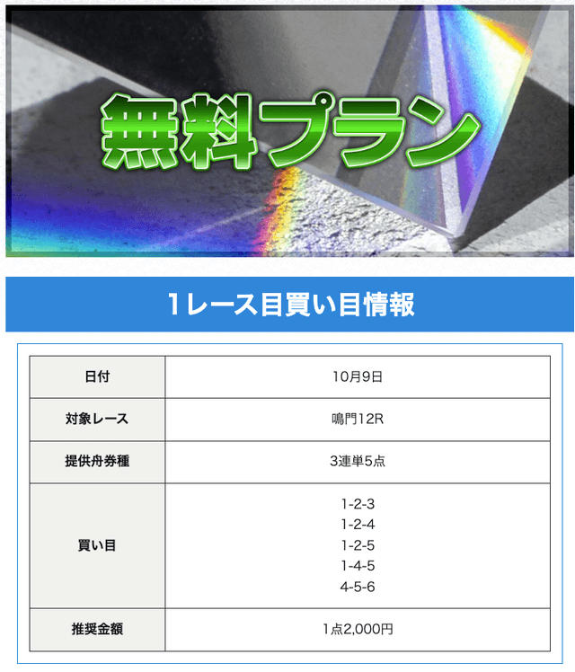 - 無料予想は5点で参加できるね。今まで使ったサイトの中でも少ないほうかなー。その分コストは他とあんまり変わらないのに、1点の値段は高いから払い戻しが大きい。予想精度高くないとこんなことはできないよね。投稿日:2023/10/04