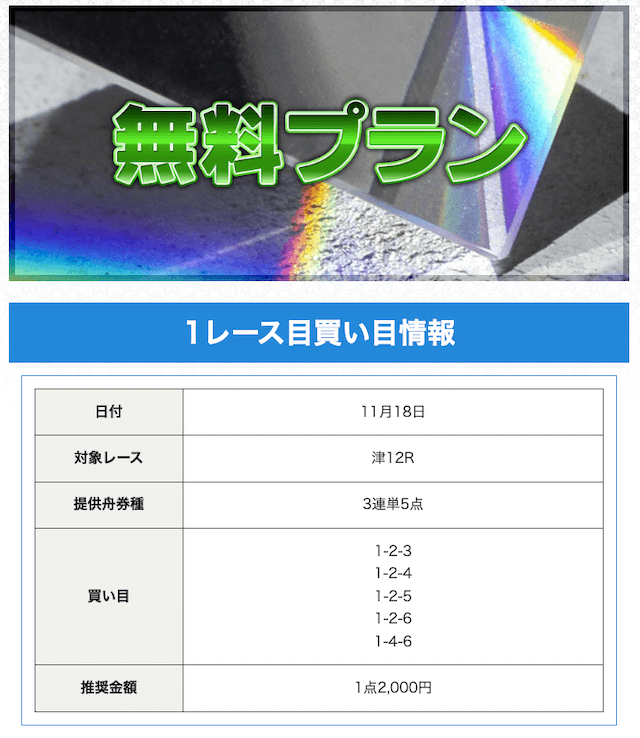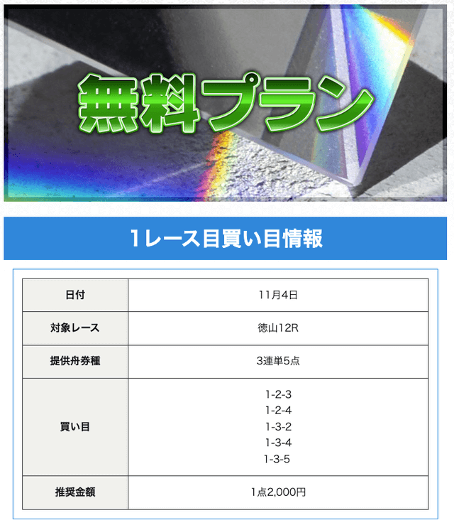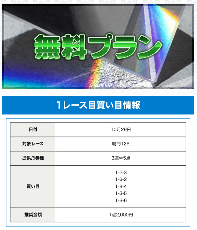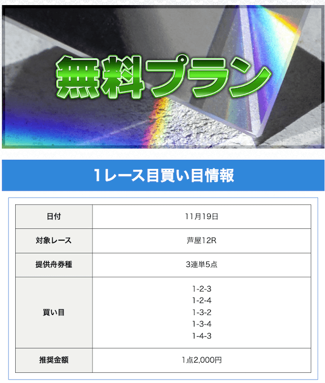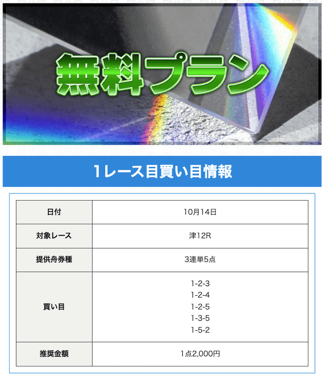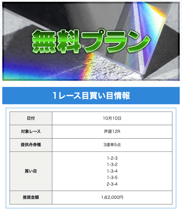 | プラン名 | 的中率 | 回収率 | 戦績 | 収支 | 情報料金+舟券代 | 合計払戻金 |
