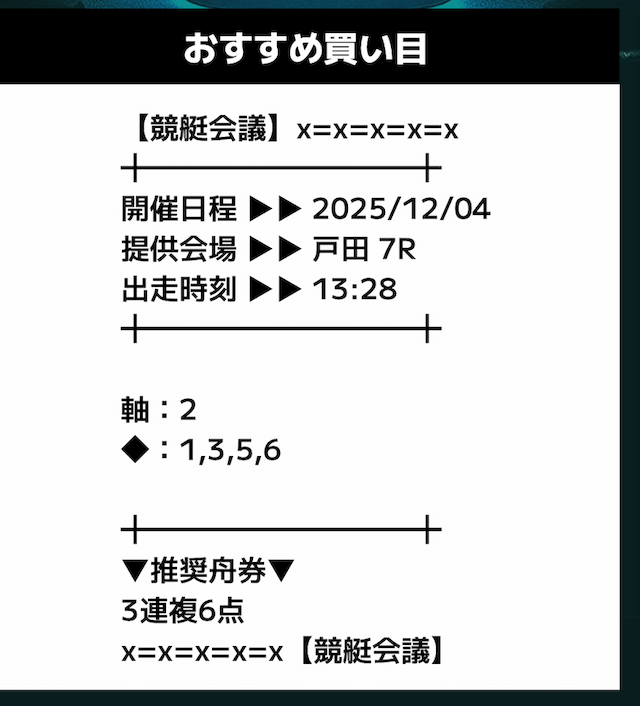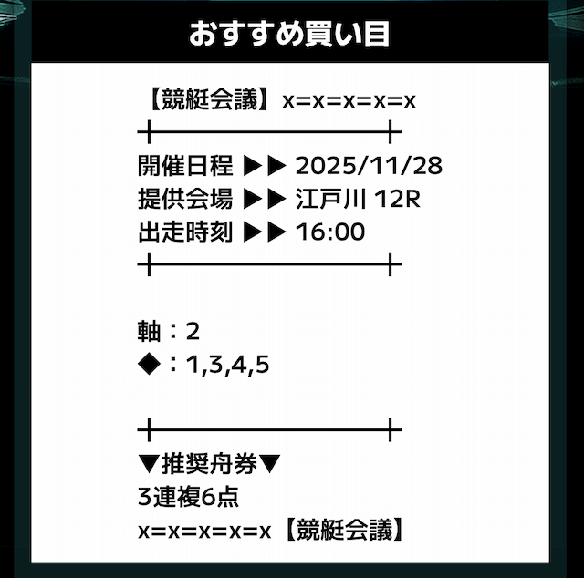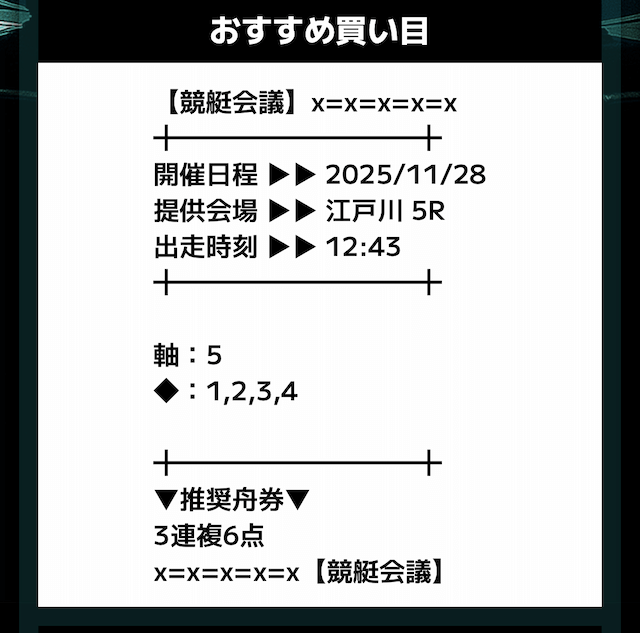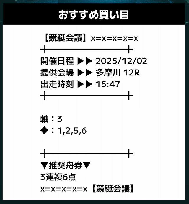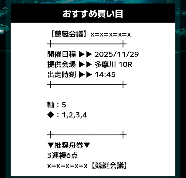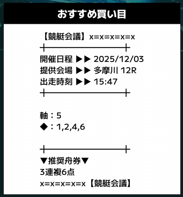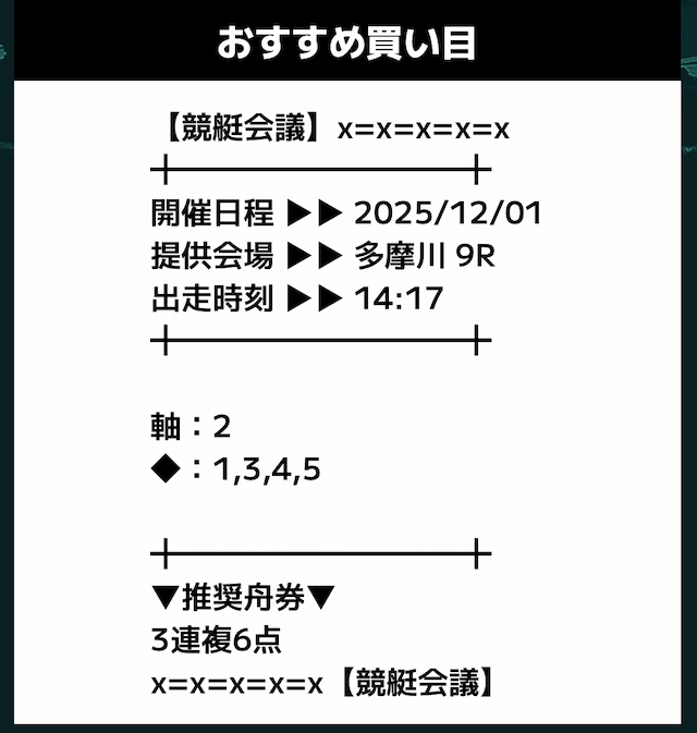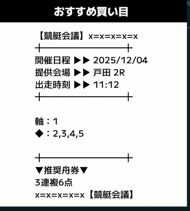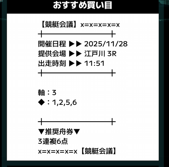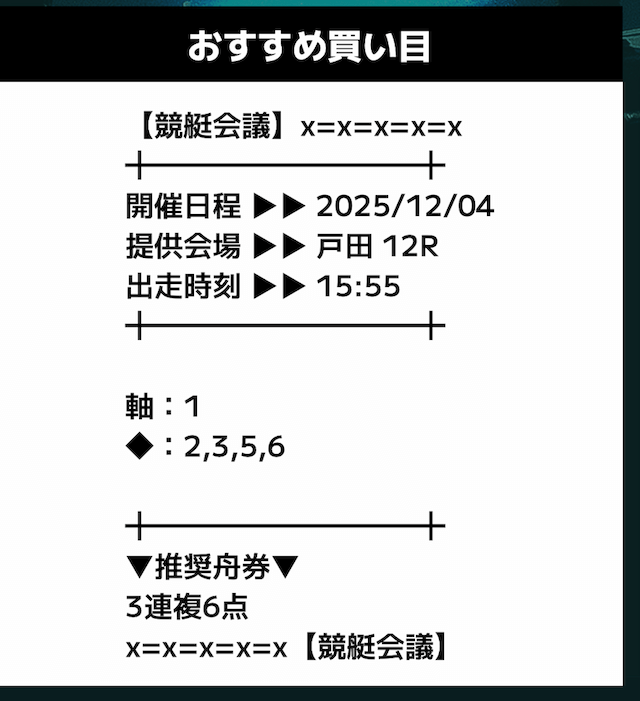 競艇会議の無料予想は、毎日“1つの会場”が指定されて、その日の1〜12Rまで全ての予想が公開される感じだ。その中から選んで買ってもいいし、参考程度に眺めるのもアリだな。
