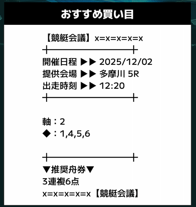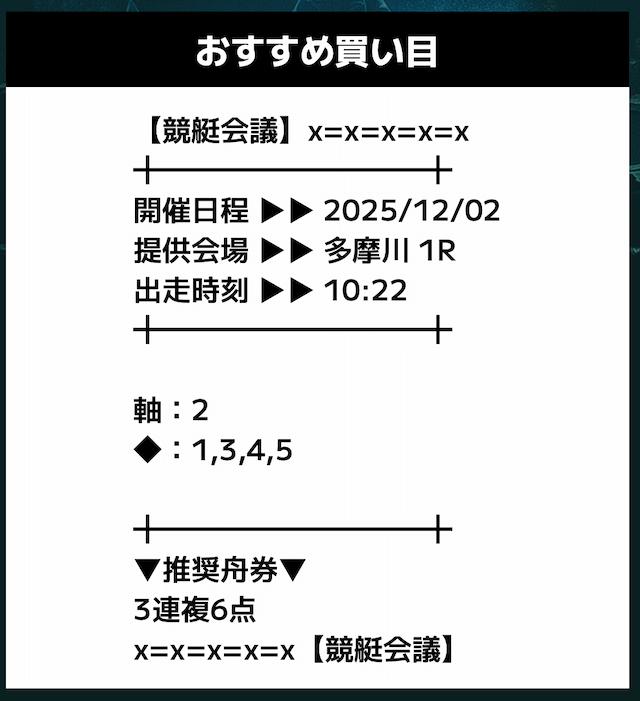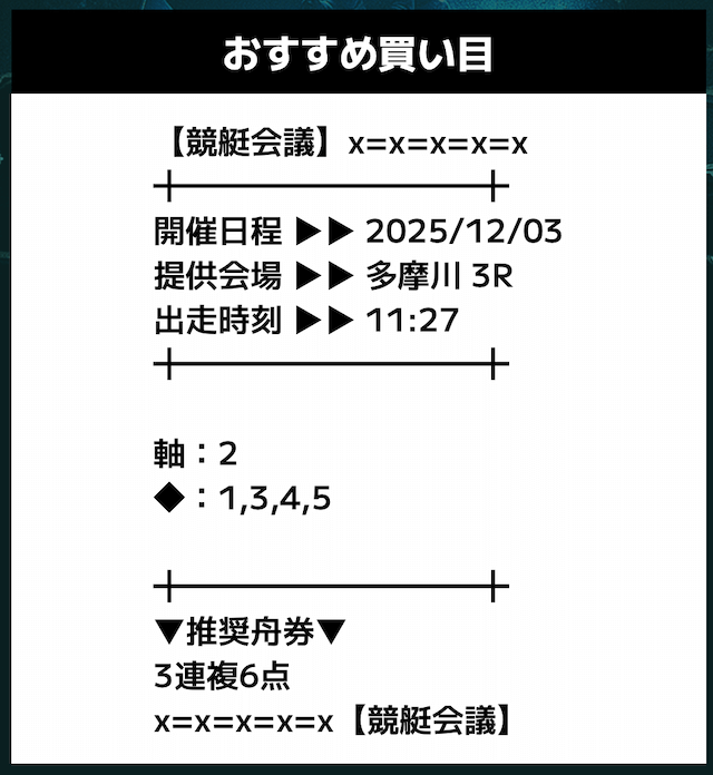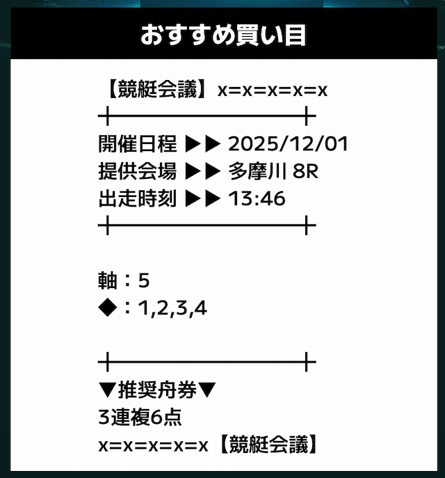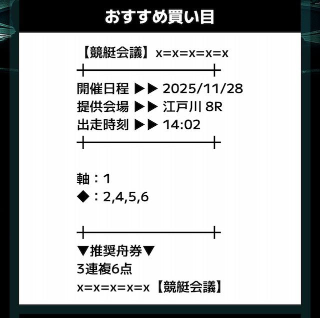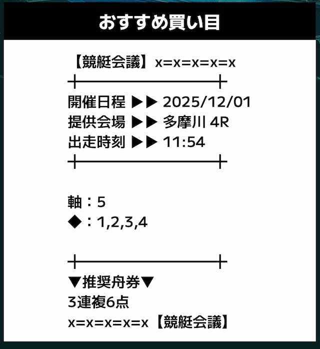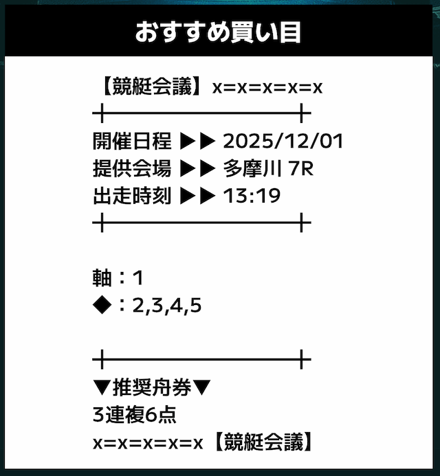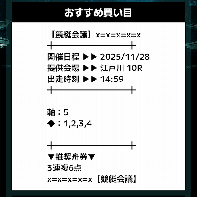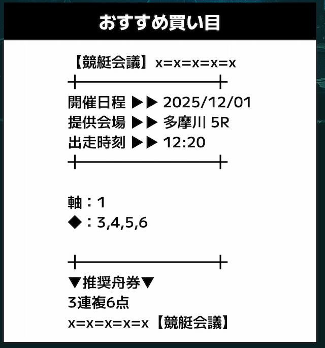 競艇会議の無料予想は、毎日“1つの会場”が指定されて、その日の1〜12Rまで全ての予想が公開される感じだ。その中から選んで買ってもいいし、参考程度に眺めるのもアリだな。