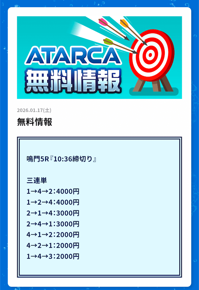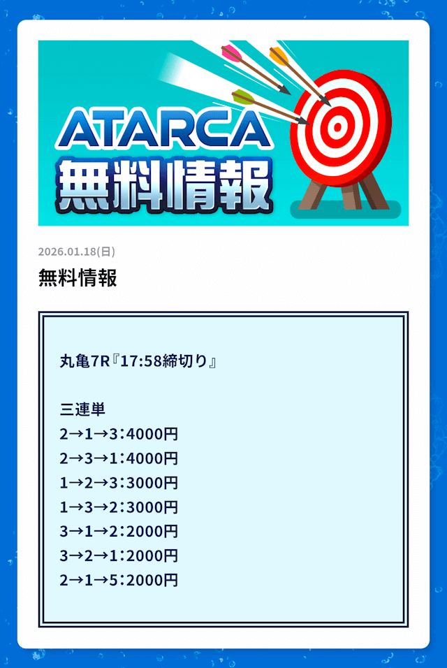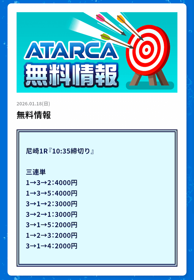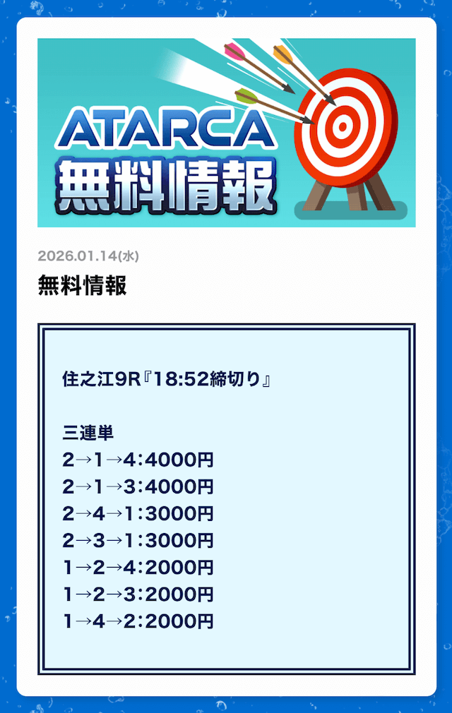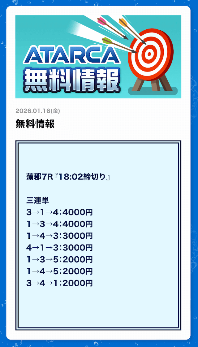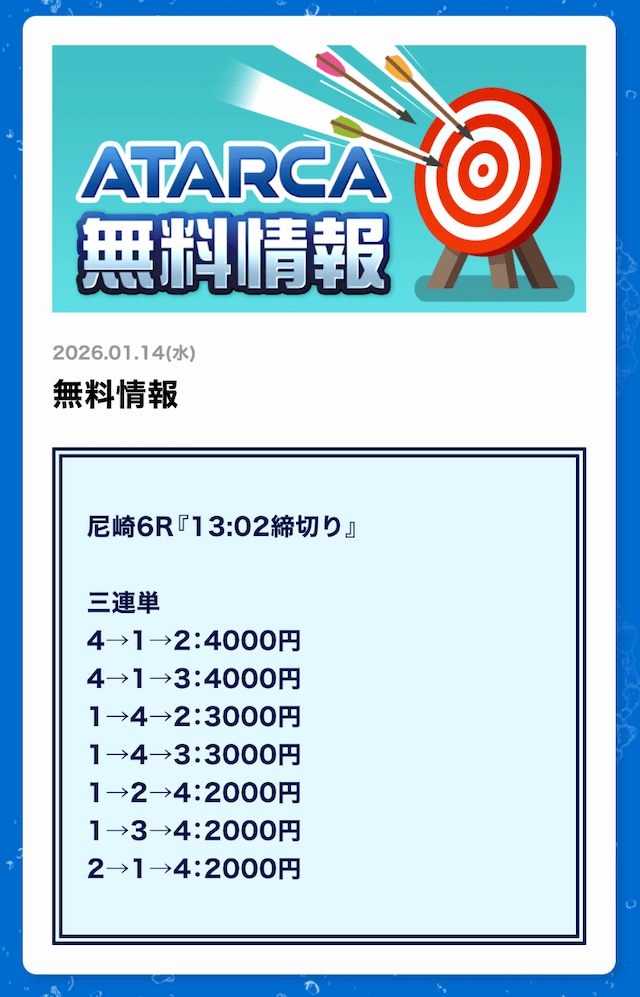 ATARCAは直近の無料予想で連戦連勝を記録したサイト。