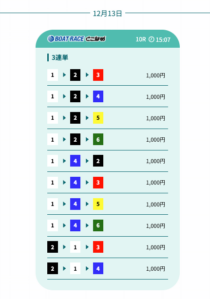 一見すると、内枠重視した簡易的な予想に見えますが、実際には各選手の仕掛けや決まり手を踏まえ、展開が向く艇を的確に選択することで、紐抜けをしっかり回避。