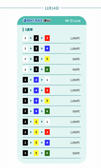 | 2025/12/14 スタンダード保証アシスト 情報料金+舟券代 25,000円+15,000円 |