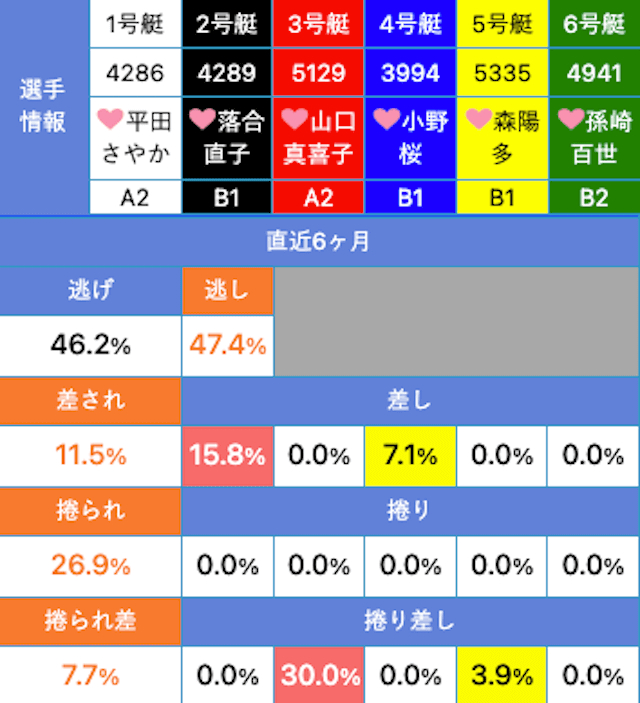 選手のクセや傾向はしっかり掴めてるみてぇだ。各艇の決まり手率を見りゃ一目瞭然だ。②落合は2コースから差し狙いだから「②-①」。③山口は捲り主体だから「①-③-外」。④小野は差し狙いで「①-④-内」と筋は通ってるし、理屈で組み立ててるのが分かる。