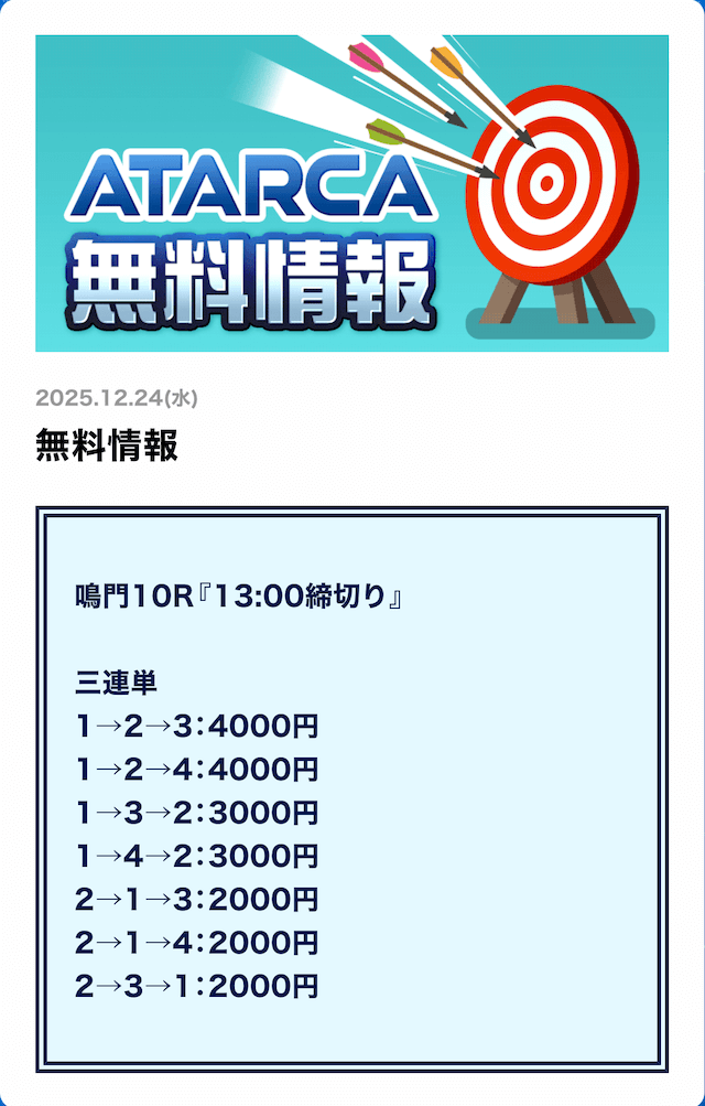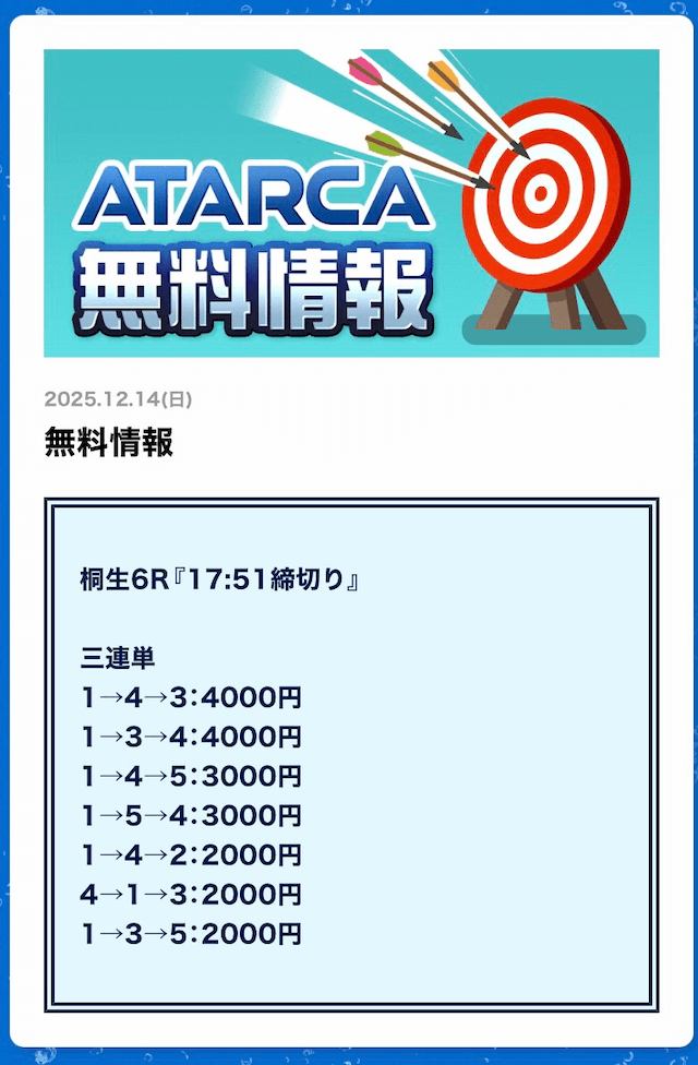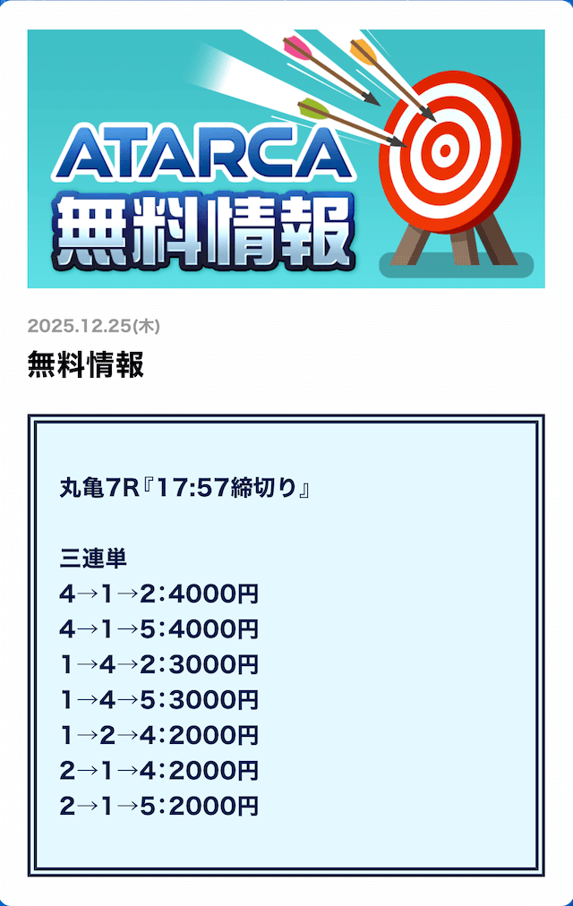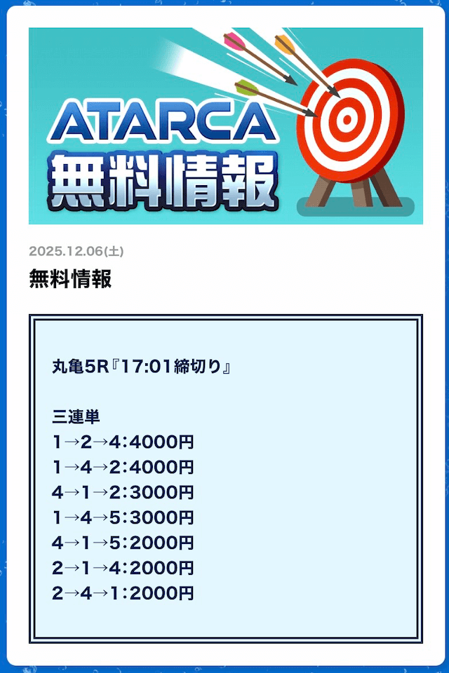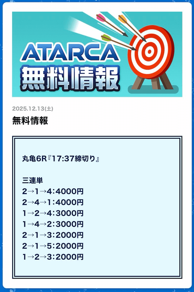 匿名無料予想12月に入っても絶好調ですね。年末最後までアタルカを使い続けようと思います!運営の方々よろしくお願いいたします!投稿日:2025/12/04
