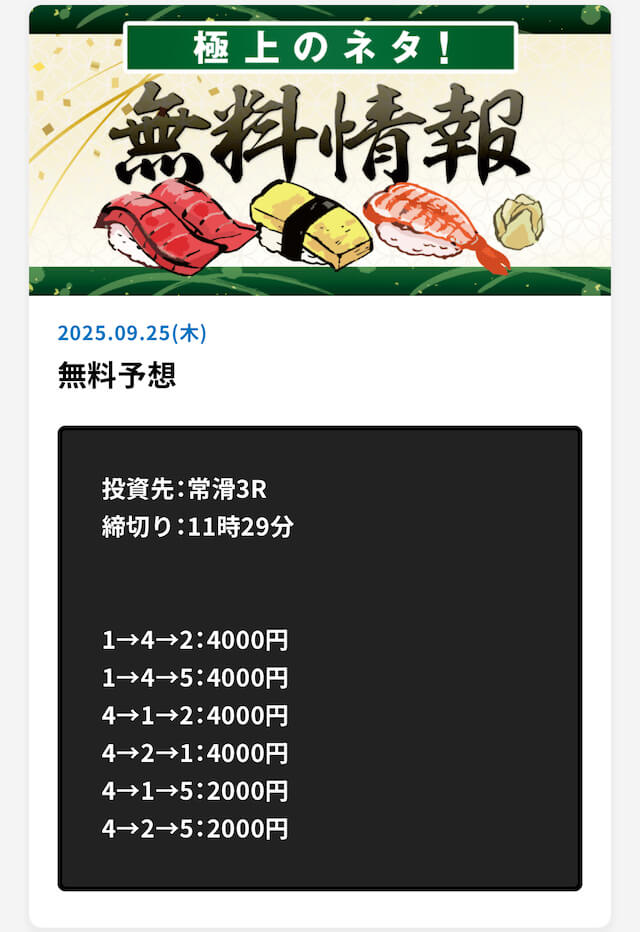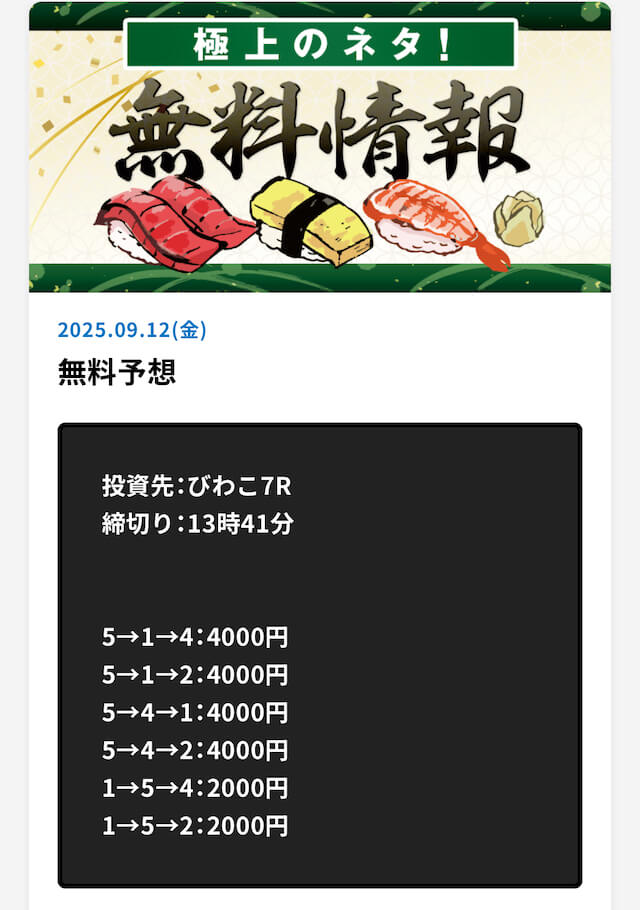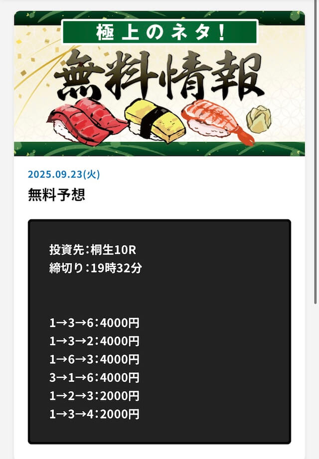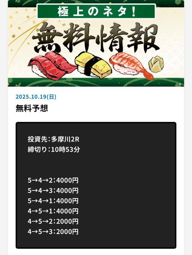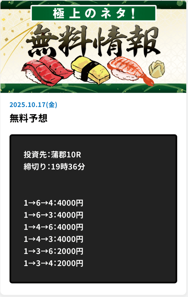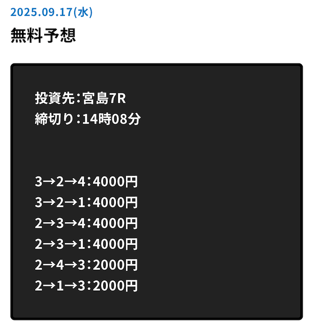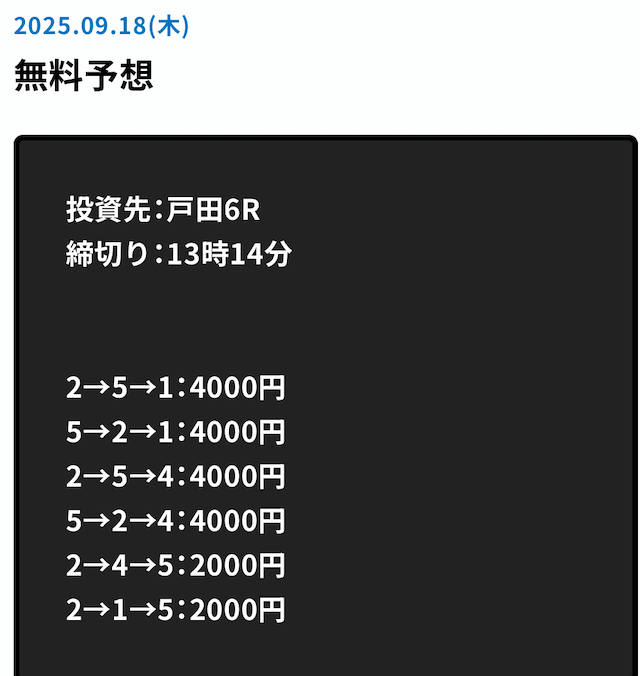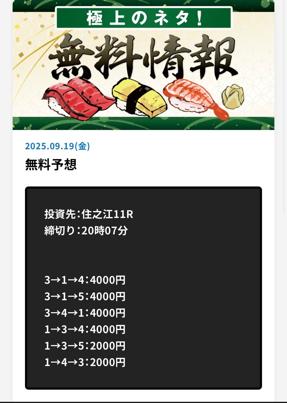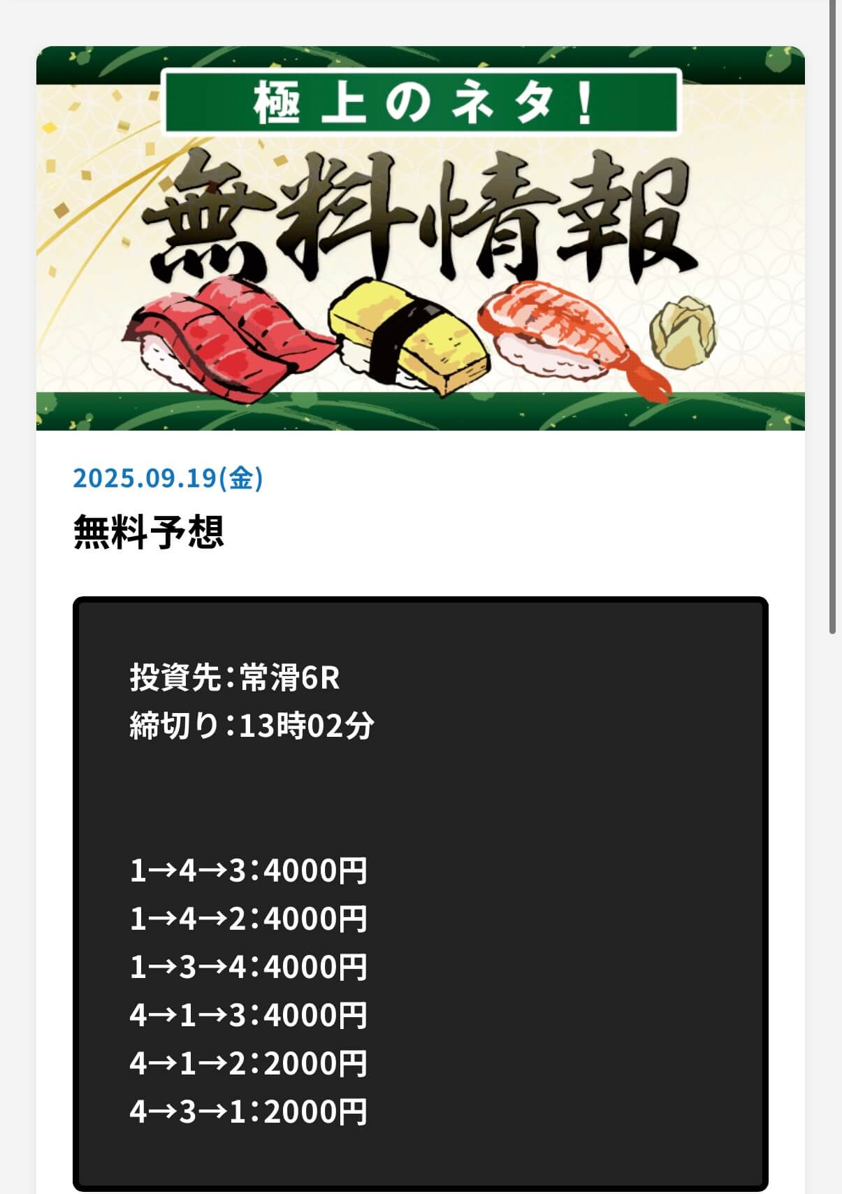 - 言うほど無料予想の的中率は高いか?普通に外れる日もあるし、タイミング次第だと思うけど、長期的に参加するべきだと思います。投稿日:2025/09/23