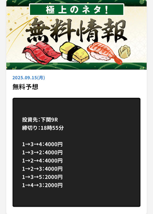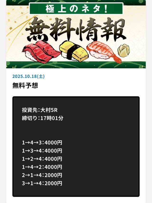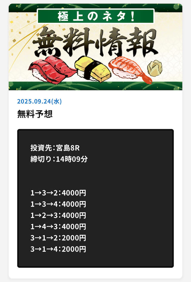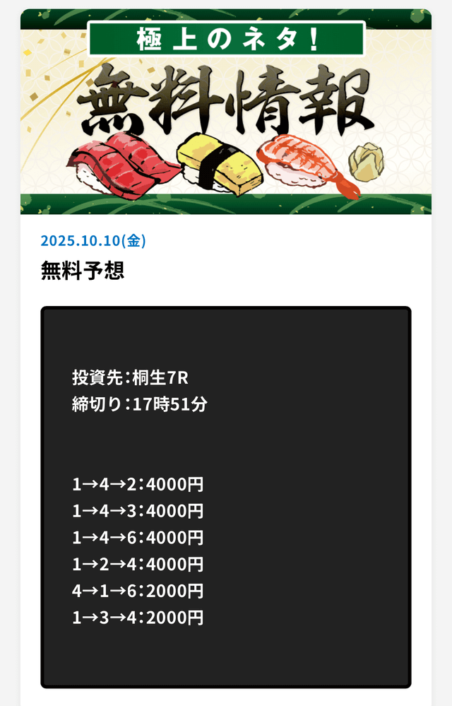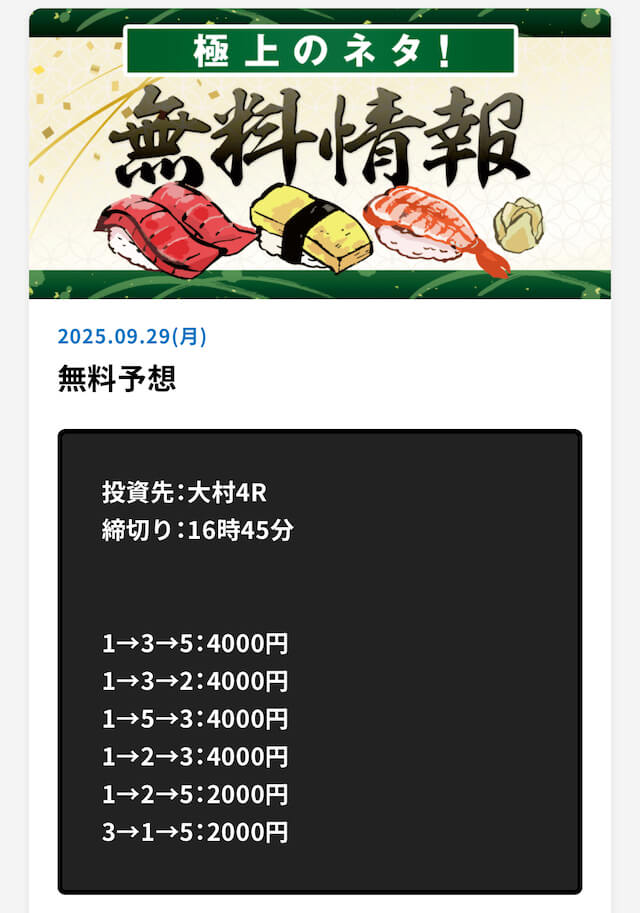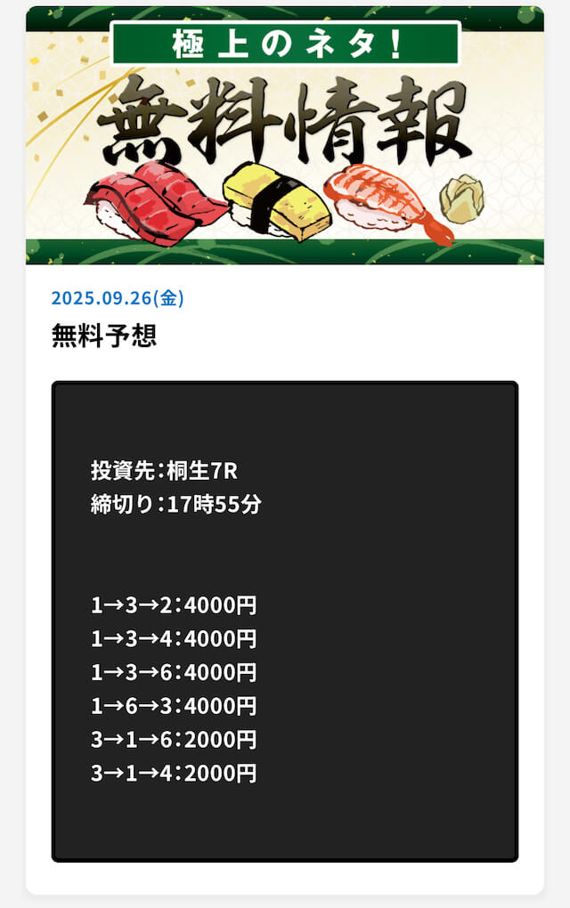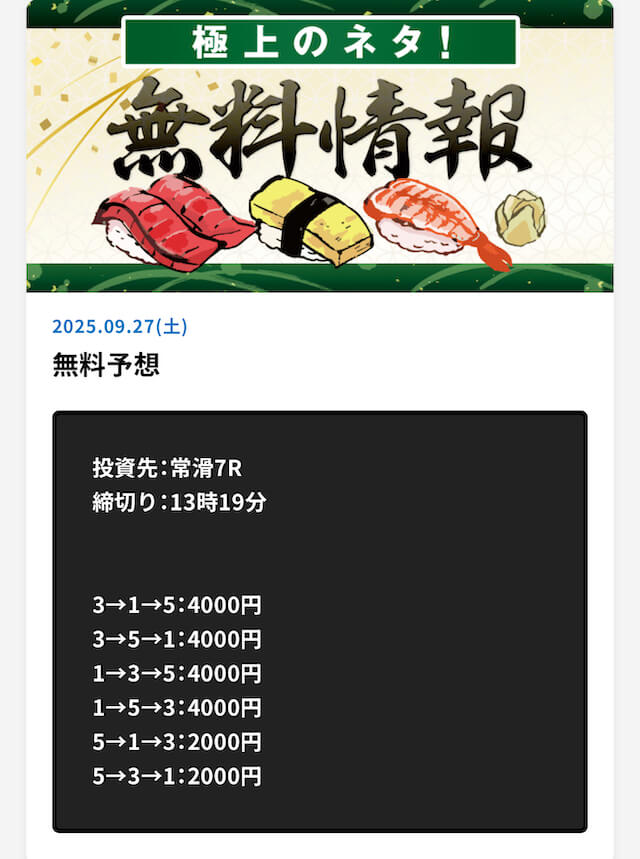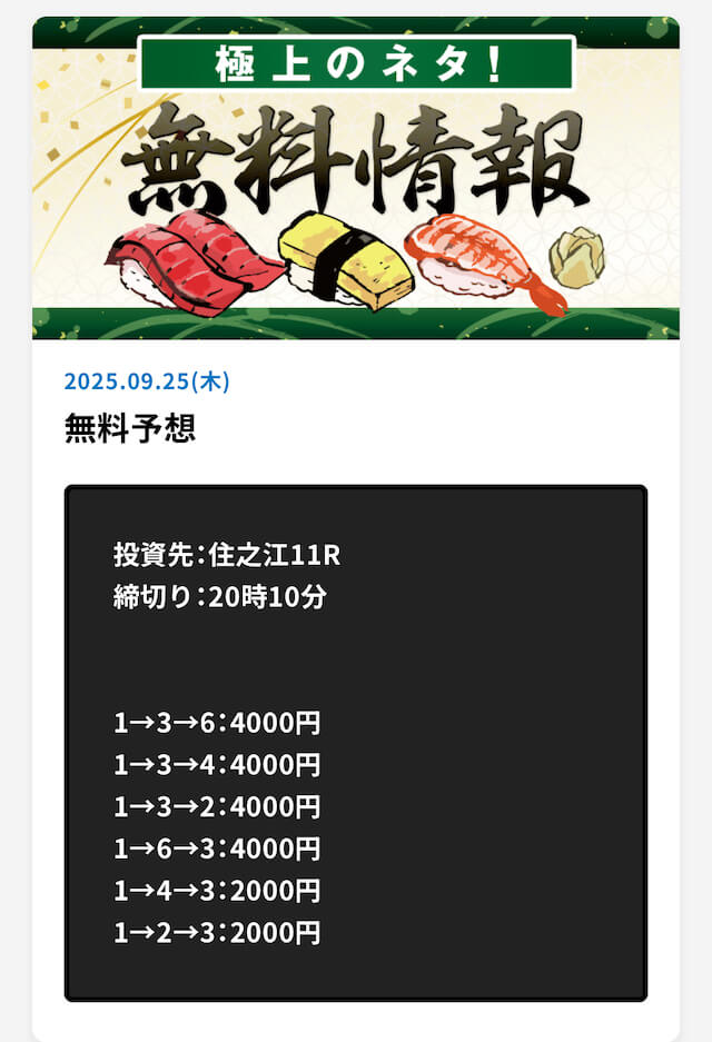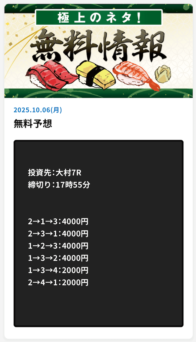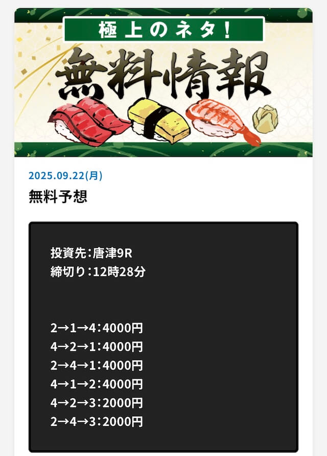 - 言うほど無料予想の的中率は高いか?普通に外れる日もあるし、タイミング次第だと思うけど、長期的に参加するべきだと思います。投稿日:2025/09/23