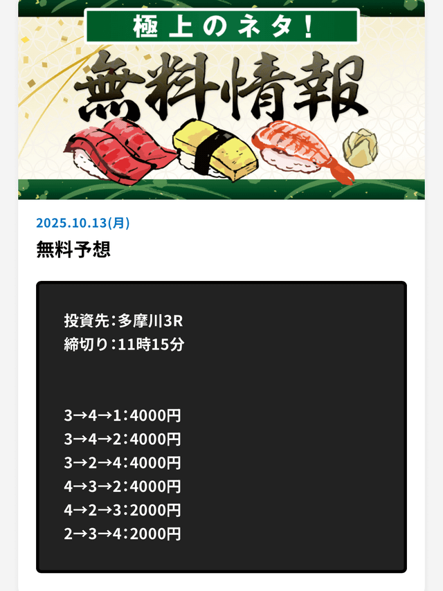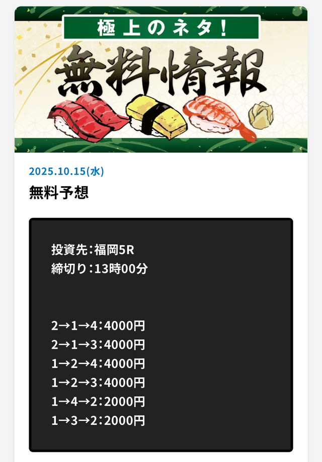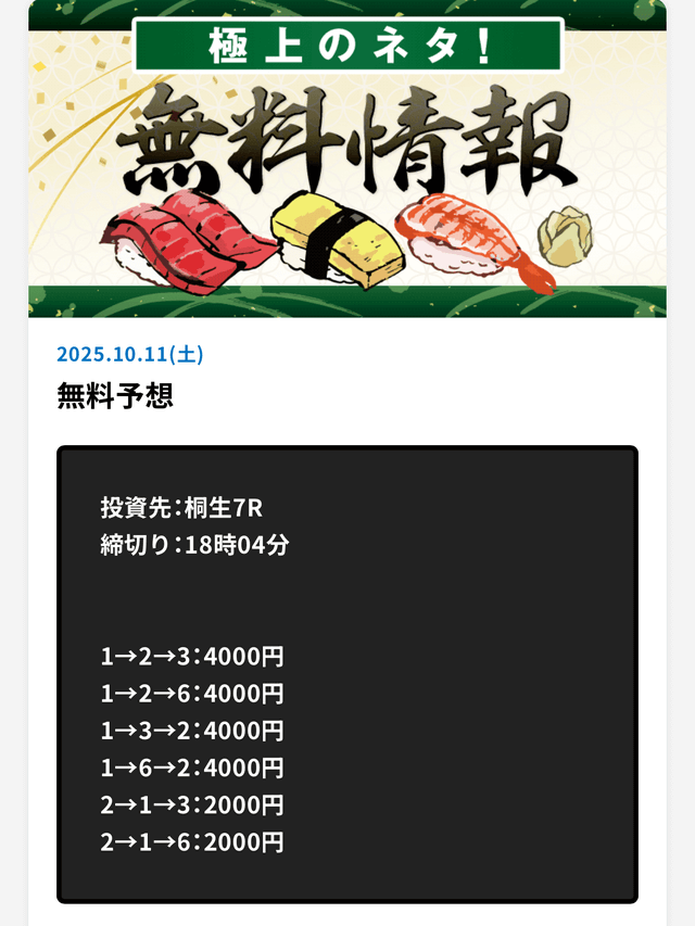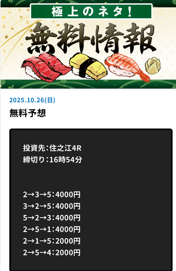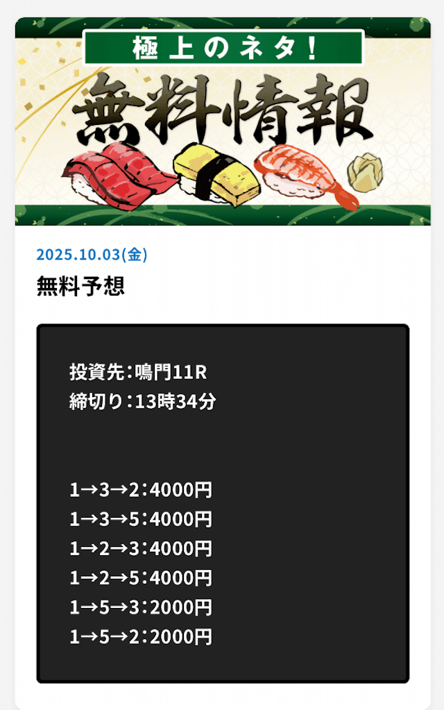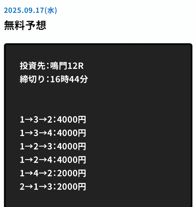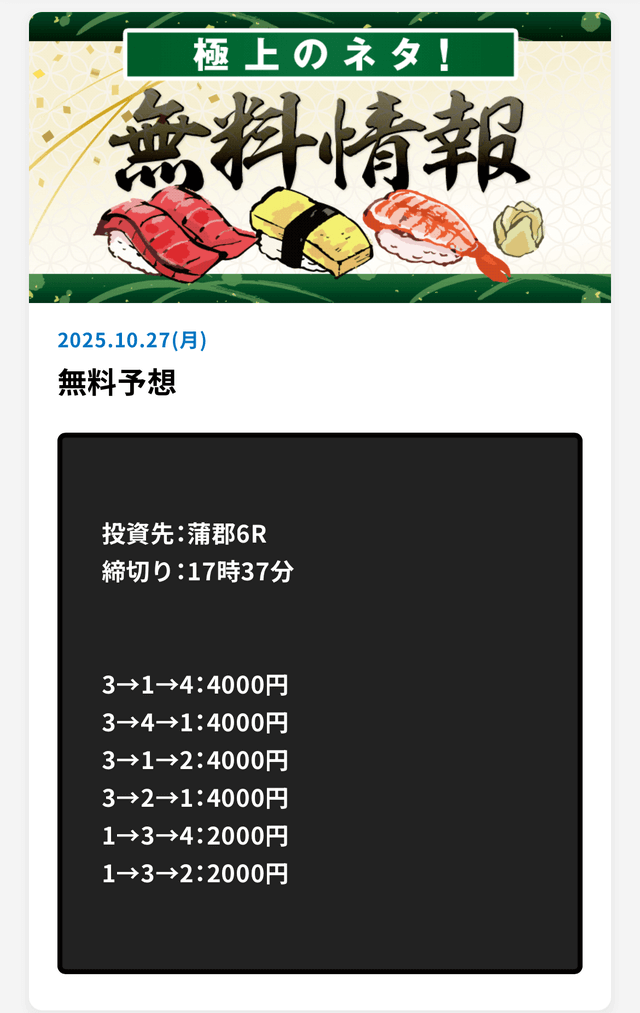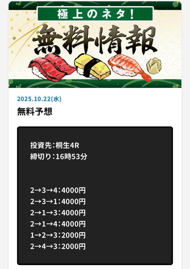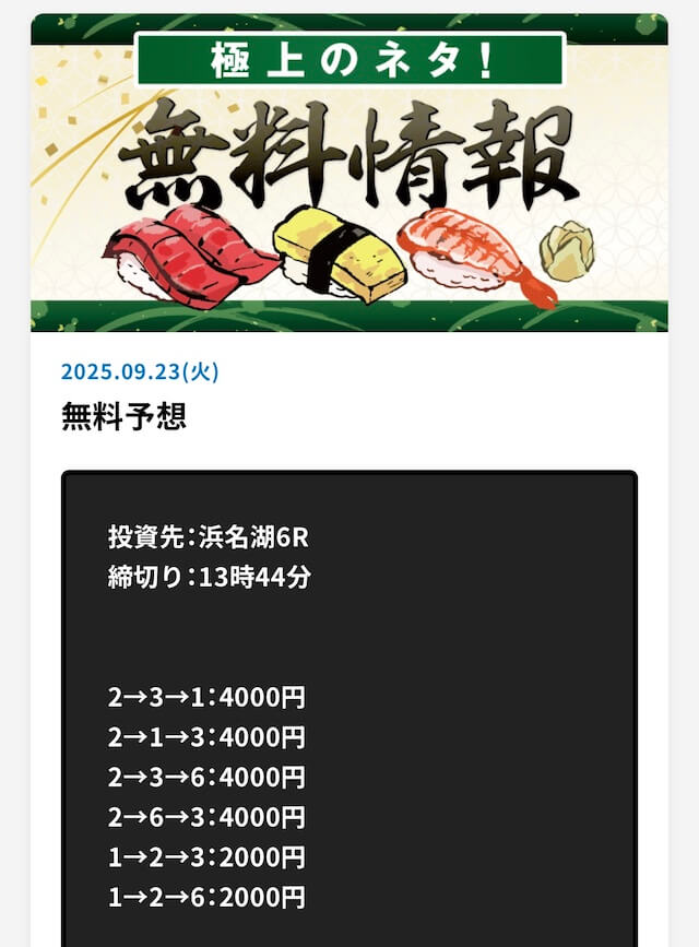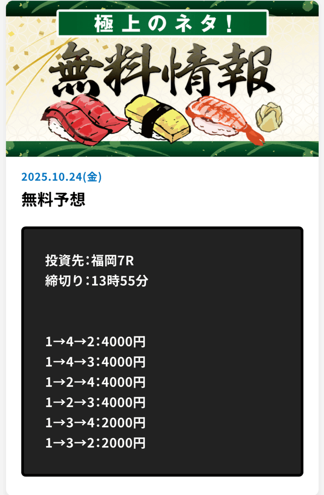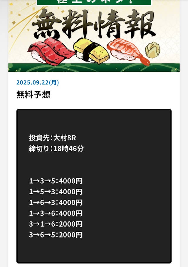 - 言うほど無料予想の的中率は高いか?普通に外れる日もあるし、タイミング次第だと思うけど、長期的に参加するべきだと思います。投稿日:2025/09/23