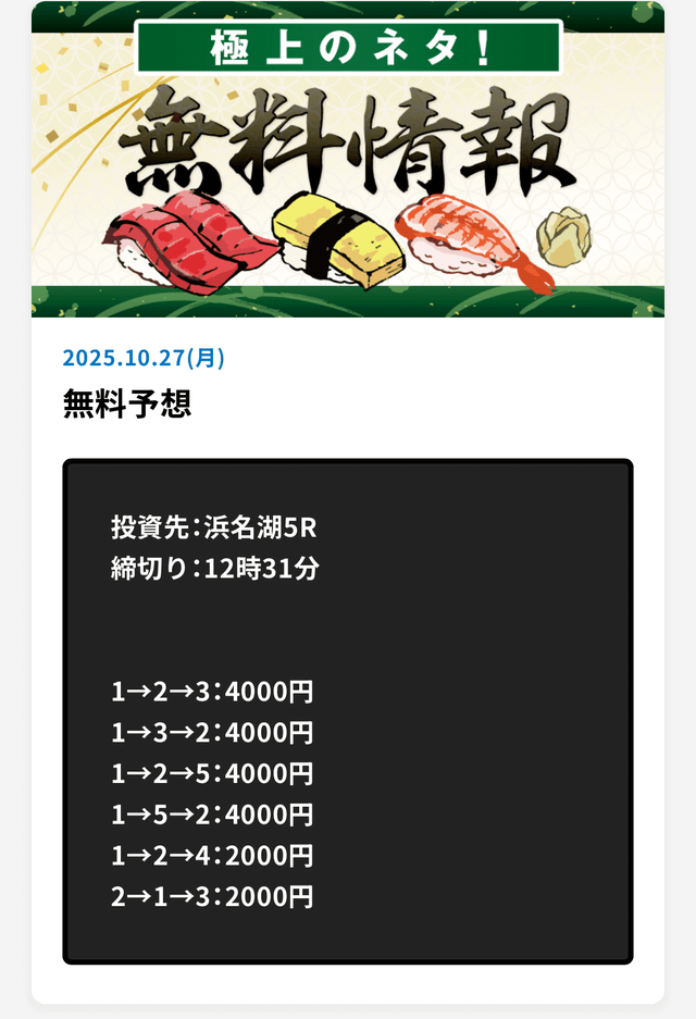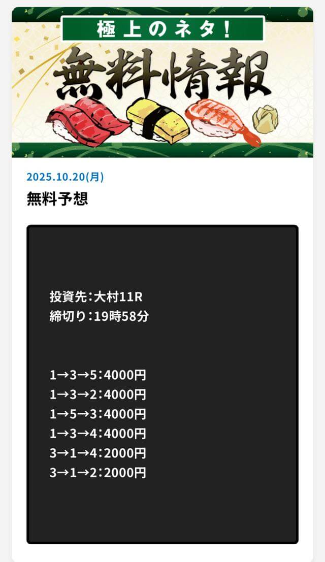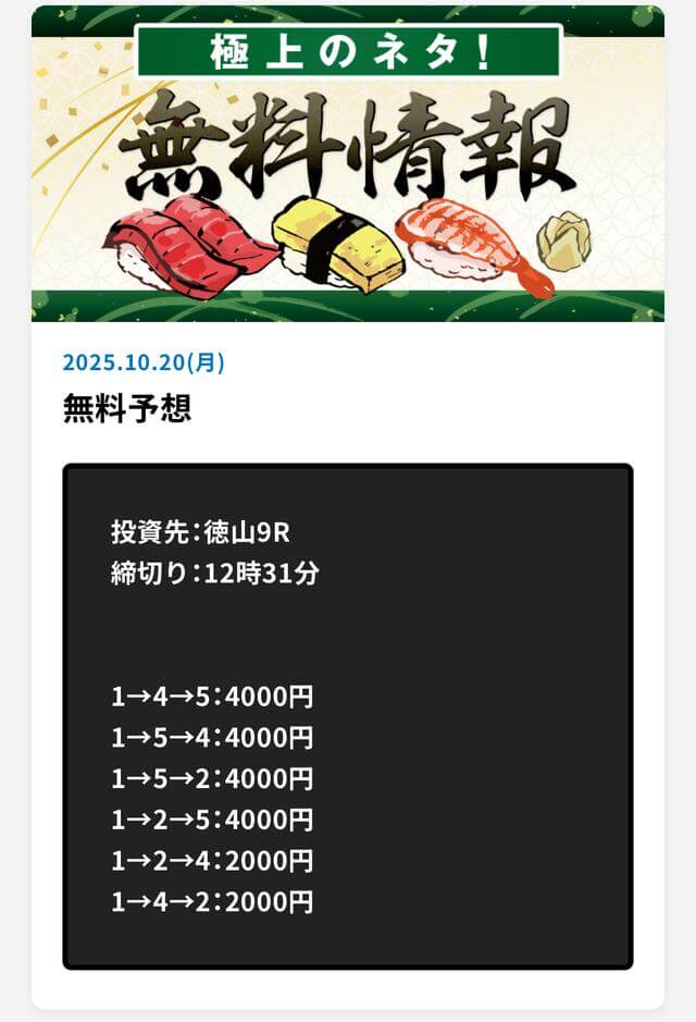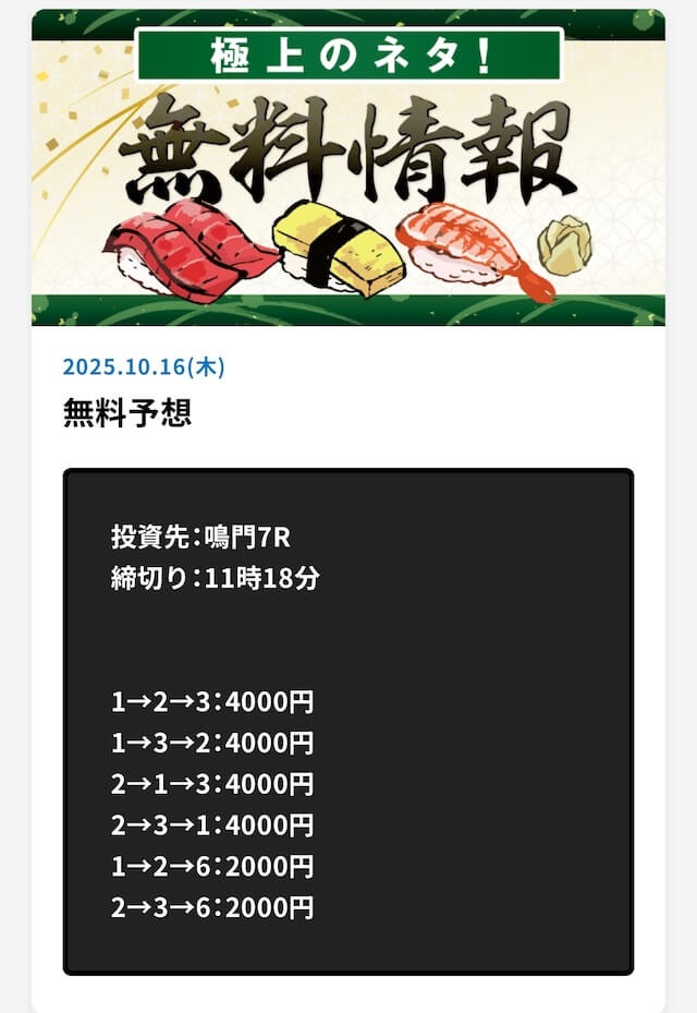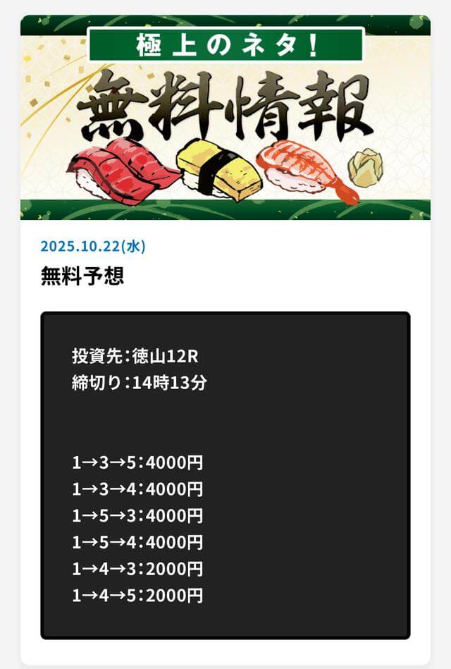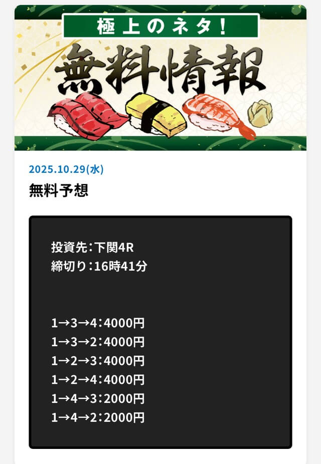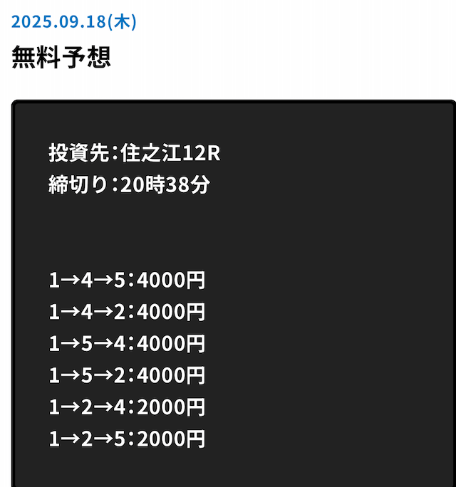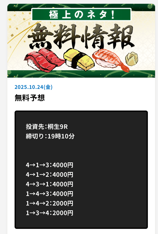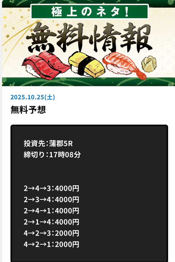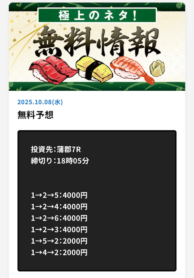 - 言うほど無料予想の的中率は高いか?普通に外れる日もあるし、タイミング次第だと思うけど、長期的に参加するべきだと思います。投稿日:2025/09/23