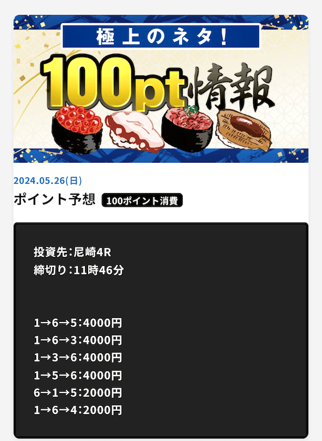 | 2024/5/26 ポイント情報 情報料金+舟券代 10,000円+20,000円 |