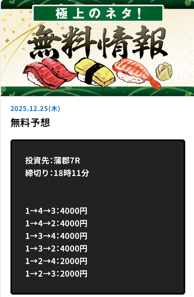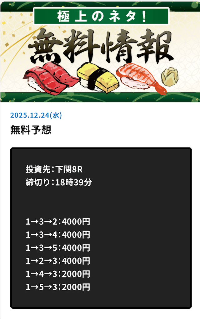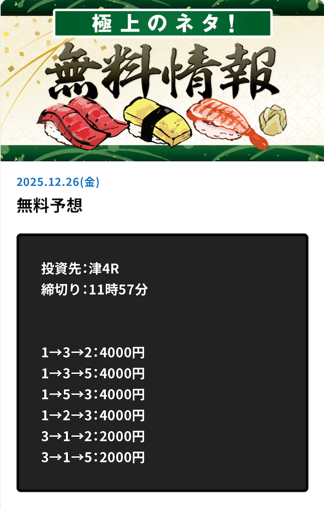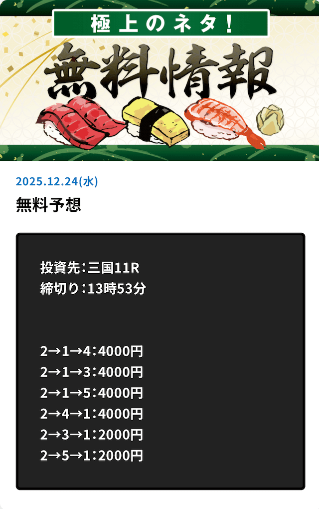 匿名短期間で大きく稼げるのが魅力だね。運営期間も長いし、それでいて無料予想がコンスタントに当たる。予想精度の高さは間違いないかな。投稿日:2025/12/12