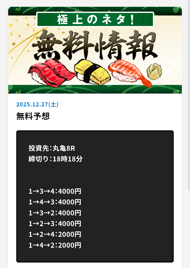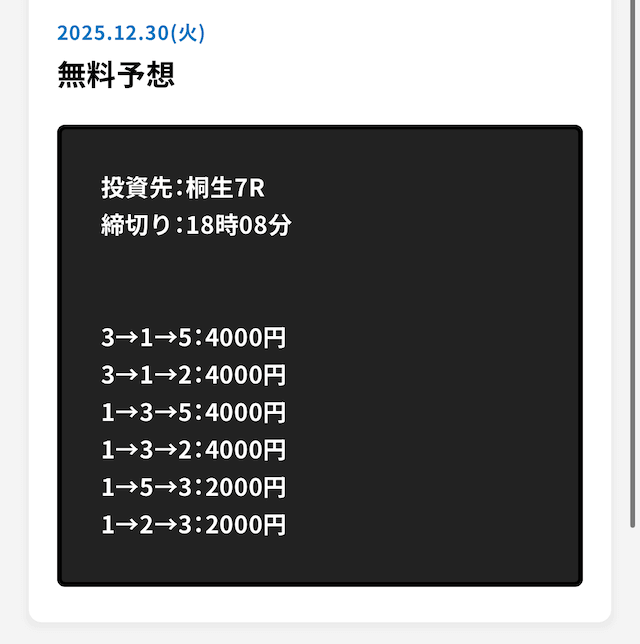 無料予想愛用者的中率だけでなく回収率も高い。少額で参加しても十分に利益が残るのはありがたいです。投稿日:2025/09/27