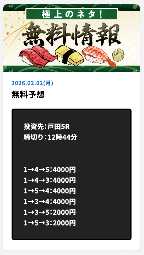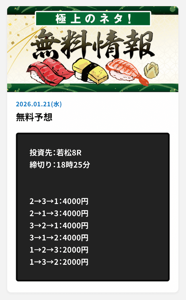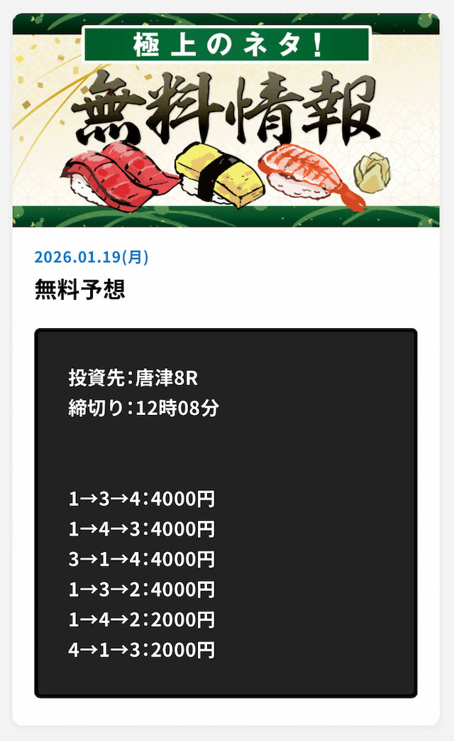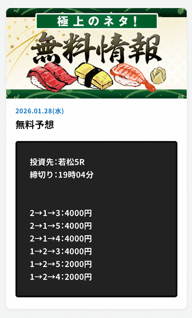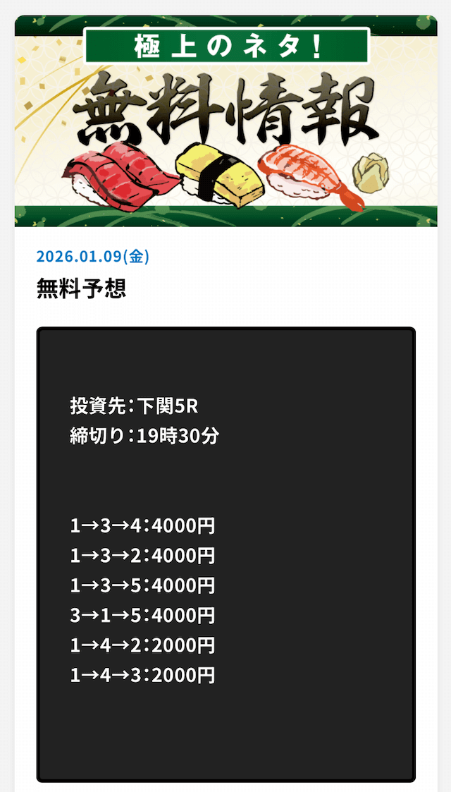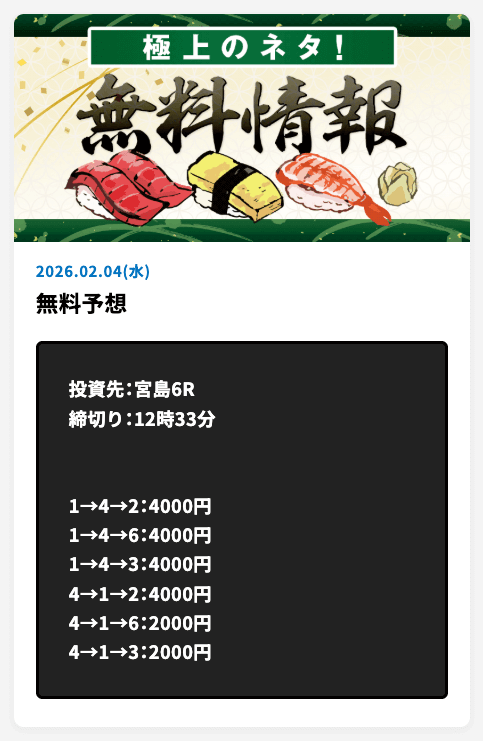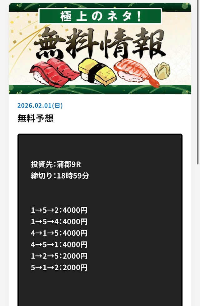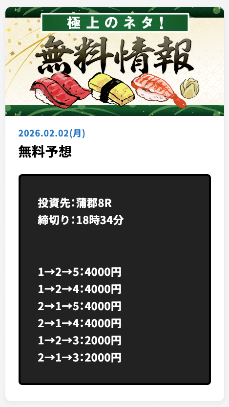 - 2026/02/04的中 無料予想で32,000円獲得2026/02/02的中 無料予想で32,800円獲得2026/02/01的中 無料予想で70,000円獲得2026/01/30的中 無料予想で137,600円獲得2026/01/28的中 無料予想で30,400円獲得2026/01/26的中 無料予想で78,000円獲得2026/01/24的中 無料予想で24,400円獲得2026/01/22的中 無料予想で88,800円獲得2026/01/19的中 無料予想で24,200円獲得2026/01/19的中 無料予想で39,600円獲得
