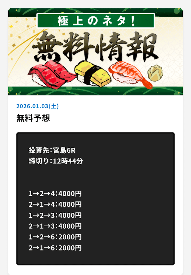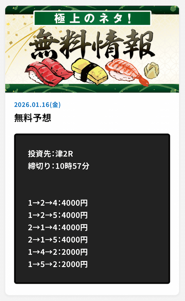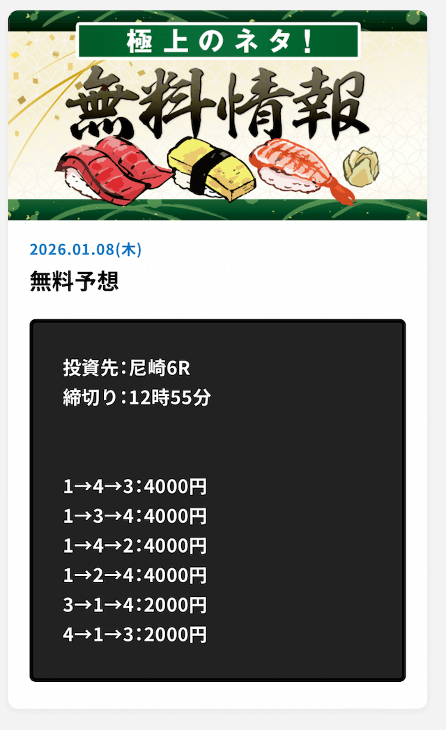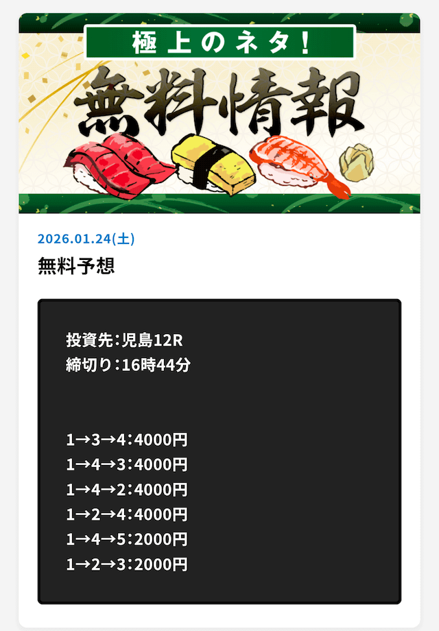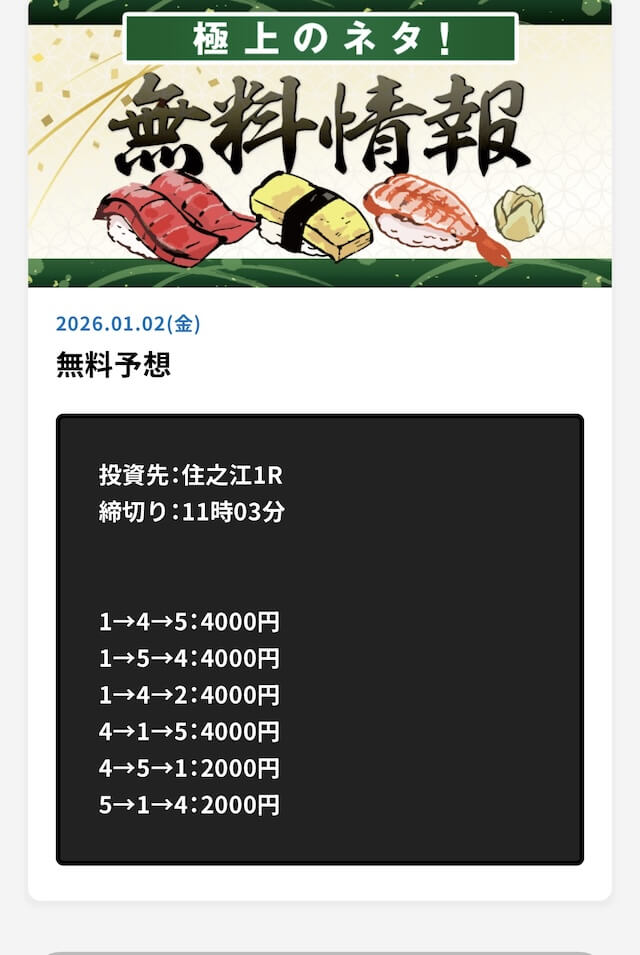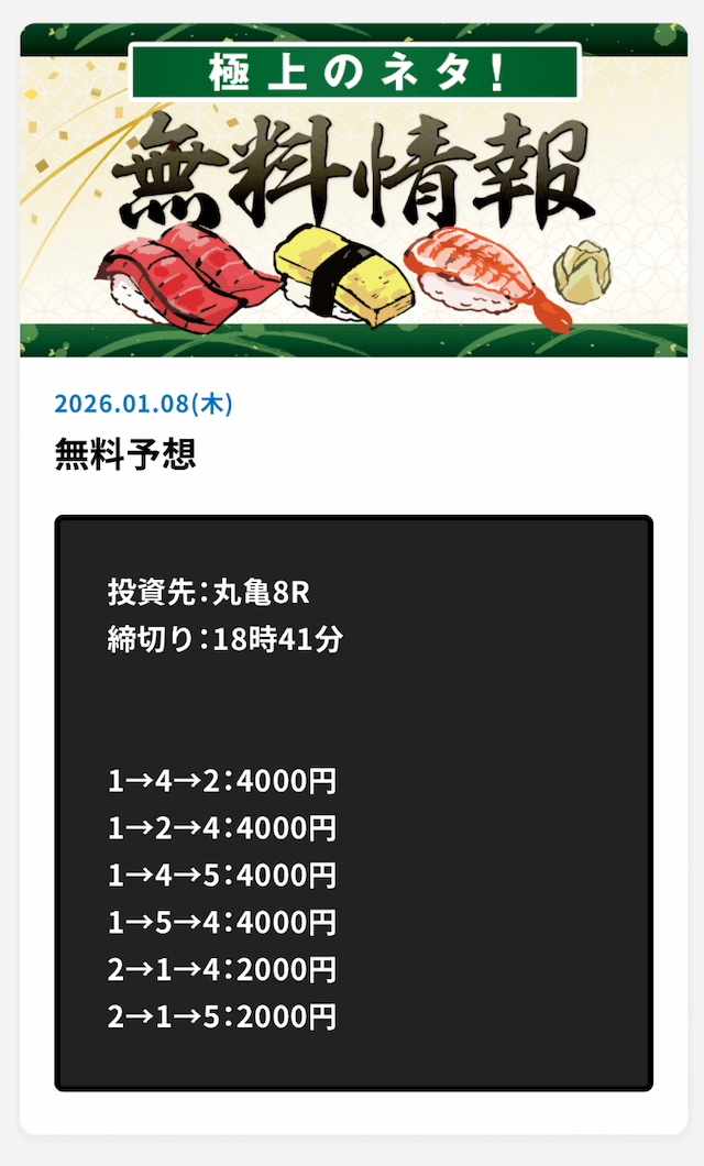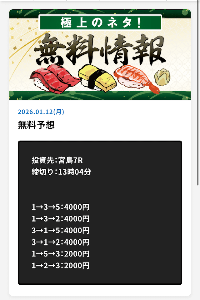 - 2026/02/04的中 無料予想で32,000円獲得2026/02/02的中 無料予想で32,800円獲得2026/02/01的中 無料予想で70,000円獲得2026/01/30的中 無料予想で137,600円獲得2026/01/28的中 無料予想で30,400円獲得2026/01/26的中 無料予想で78,000円獲得2026/01/24的中 無料予想で24,400円獲得2026/01/22的中 無料予想で88,800円獲得2026/01/19的中 無料予想で24,200円獲得2026/01/19的中 無料予想で39,600円獲得