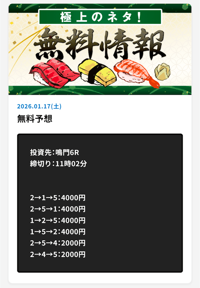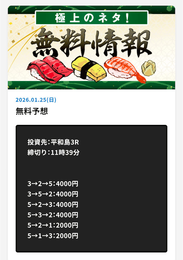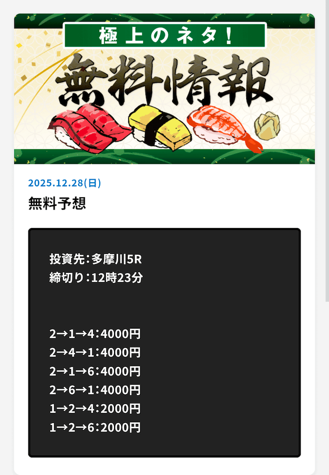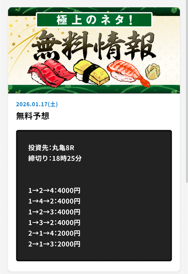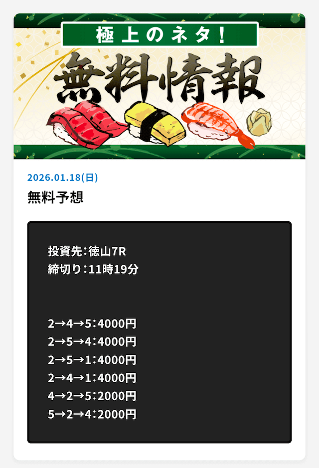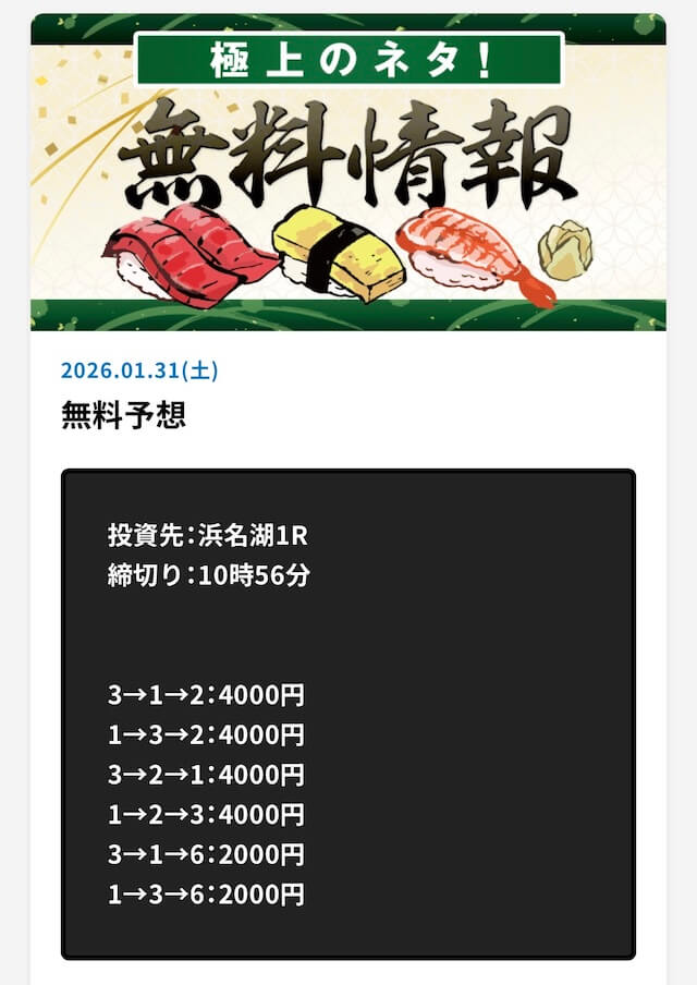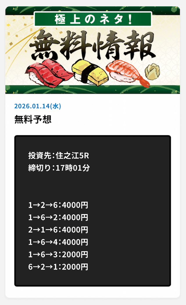 - 2026/02/04的中 無料予想で32,000円獲得2026/02/02的中 無料予想で32,800円獲得2026/02/01的中 無料予想で70,000円獲得2026/01/30的中 無料予想で137,600円獲得2026/01/28的中 無料予想で30,400円獲得2026/01/26的中 無料予想で78,000円獲得2026/01/24的中 無料予想で24,400円獲得2026/01/22的中 無料予想で88,800円獲得2026/01/19的中 無料予想で24,200円獲得2026/01/19的中 無料予想で39,600円獲得