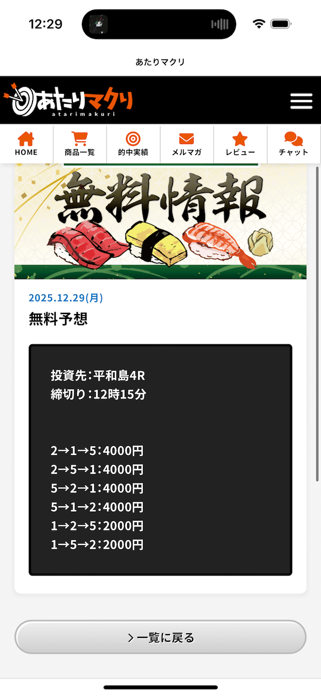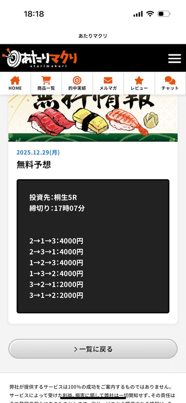 匿名他の競艇予想サイトは、的中結果しか出さないのが大半だけど、あたりマクリはその日に提供した予想の結果は包み隠さずに公開するんだよね。隠さないところが何だか好印象だし、実際にどのプランが当たりまくっているのかが分かる。投稿日:2025/09/29