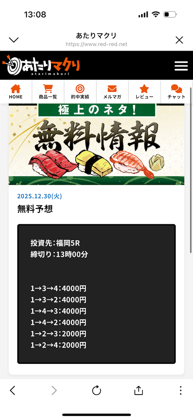 匿名あたりマクリの地味に凄い点がサイトの更新が早いことですね。直近の結果を確認してから参加できるのが嬉しい。戦略を立てやすいです。的中結果・予想提供・レビュー機能、メルマガの全てで更新が早くて助かっています。投稿日:2025/08/30