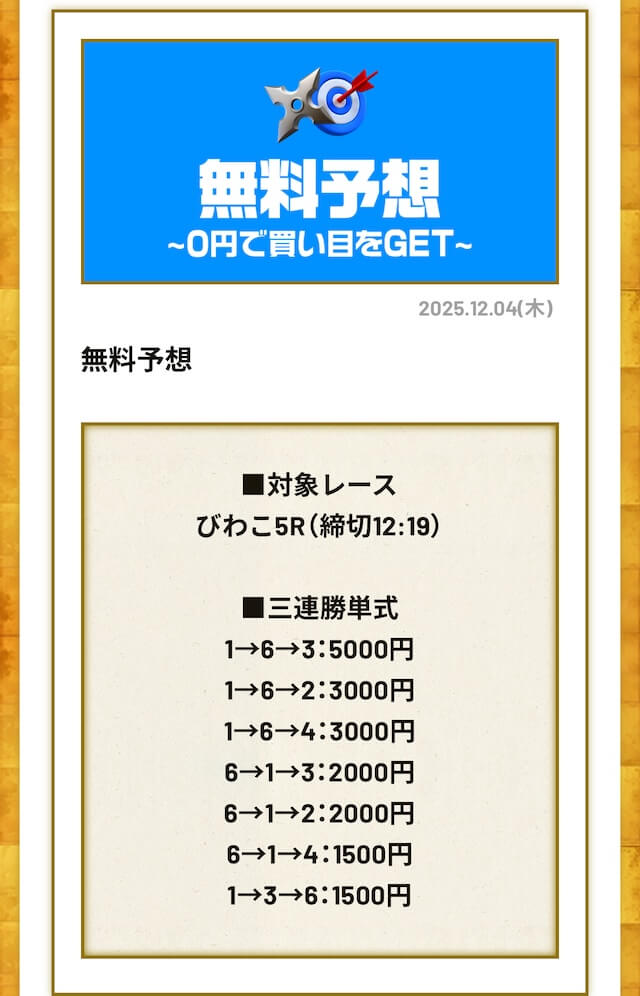 - 友人に勧められて登録したが、すぐに無料予想で的中。そのまま有料プランに進んで、数日で資金が倍近くになった。今後も継続的に使い続けてみようと思います〜!投稿日:2025/07/02