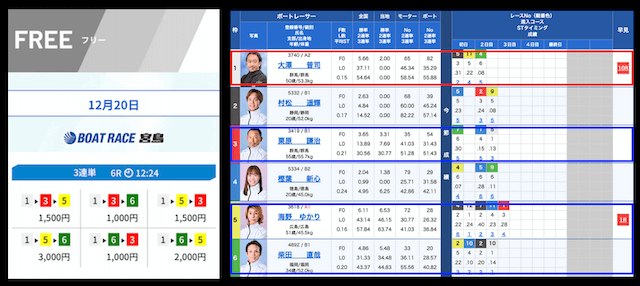 例えば画像にある番組のときは、階級と枠番を踏まえて、まず⑤⑥号艇を買い目から外します。