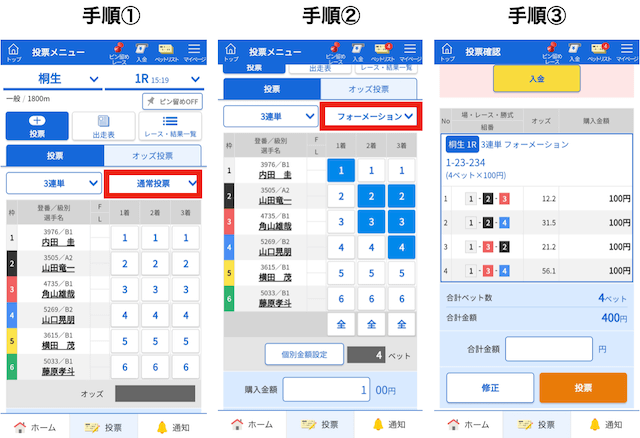 ネット投票では、複雑なフォーメーション買いもわずか数分で完了します。