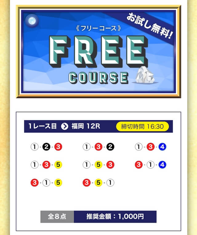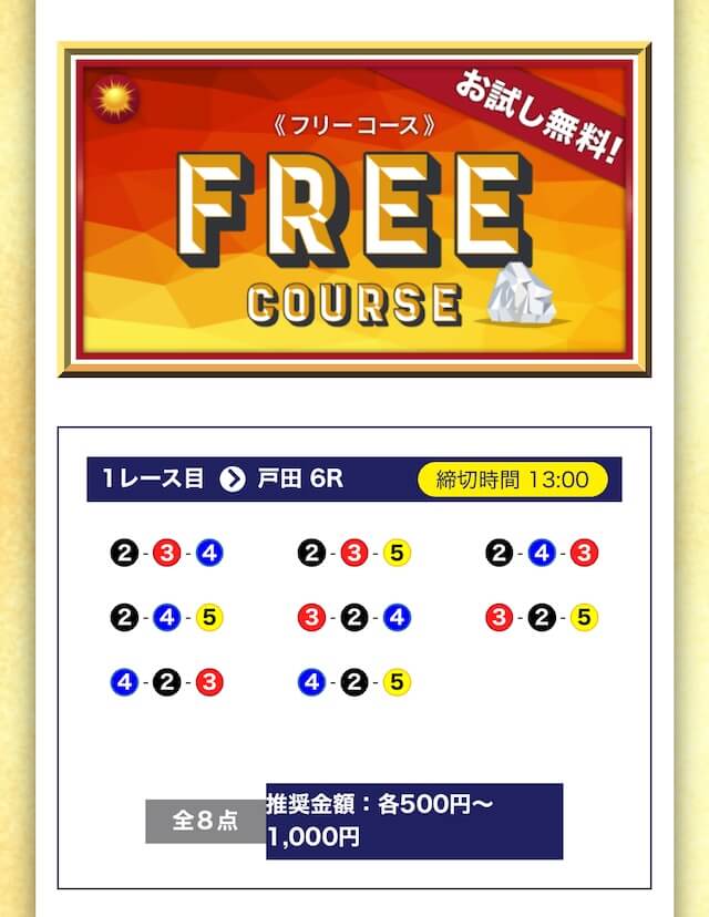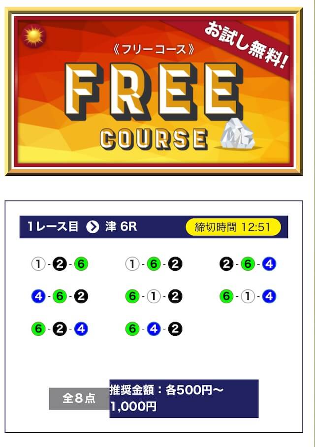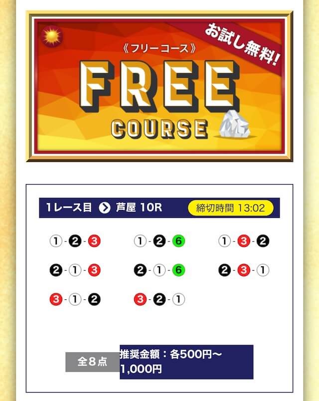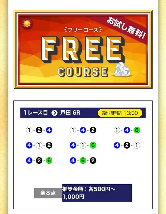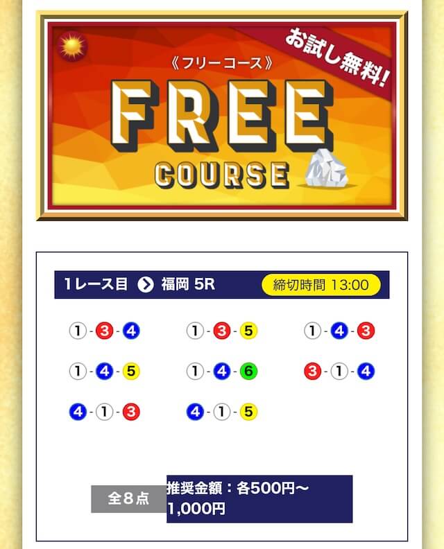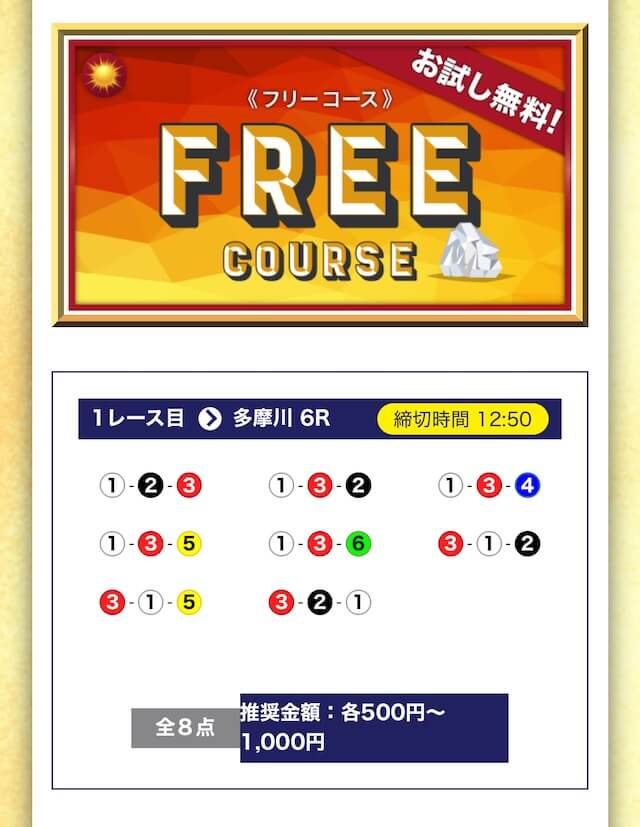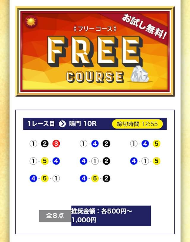 - 無料でもしっかり当ててくれるから、最初から「ここは他と違う」と思えた。有料予想も一番安いプランは2万円だし、自然と進める作りがうまい。投稿日:2025/04/22