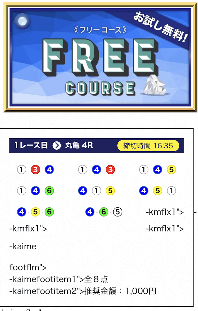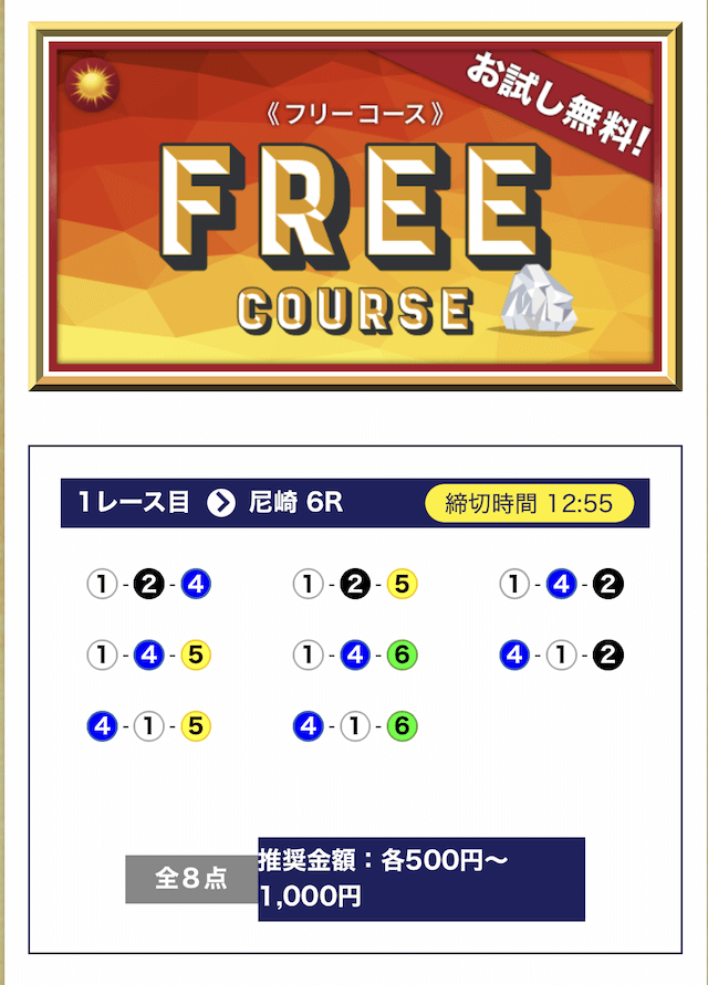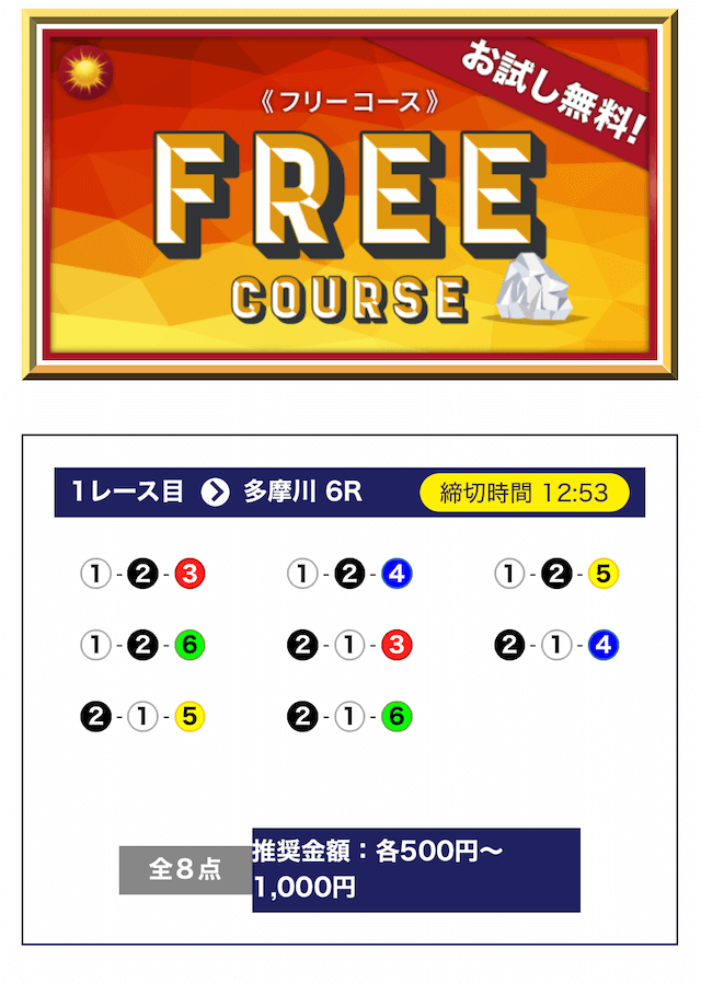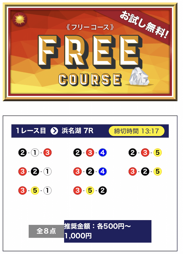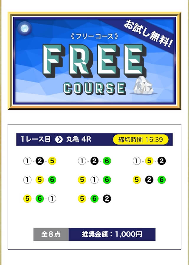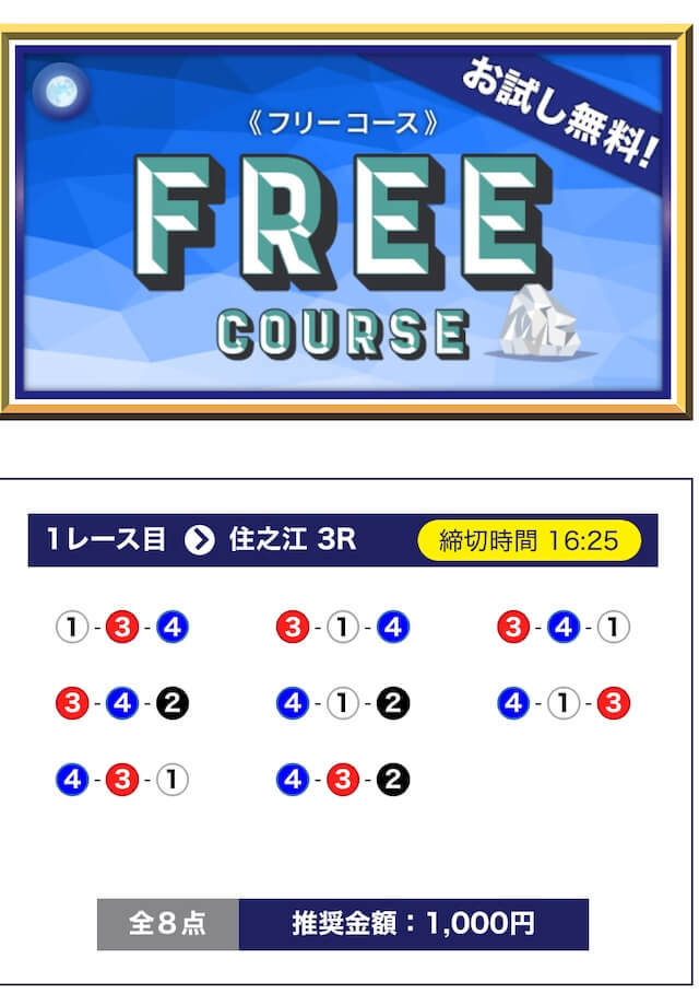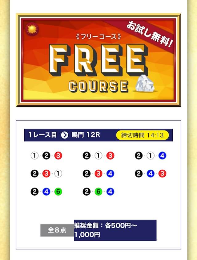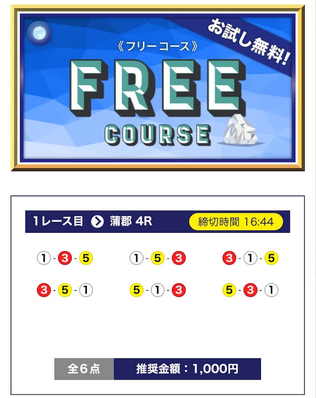 - 期間限定や初回特典が無いので、初めて競艇予想サイトを利用する方にとっては最初に試すハードルが少し高く感じると思う。投稿日:2025/07/08