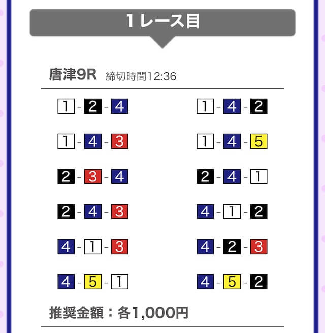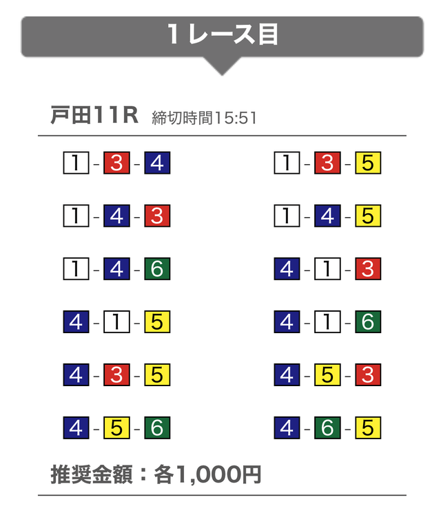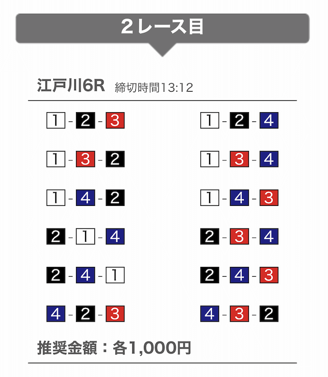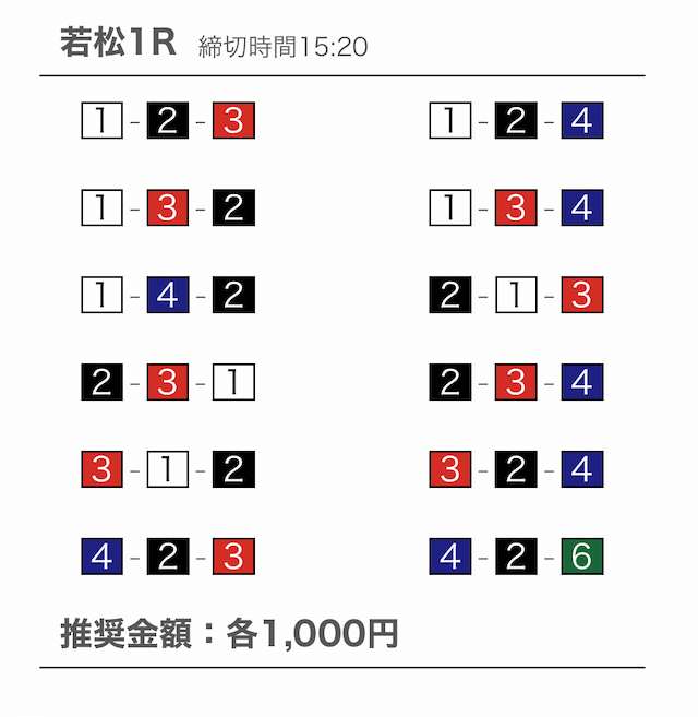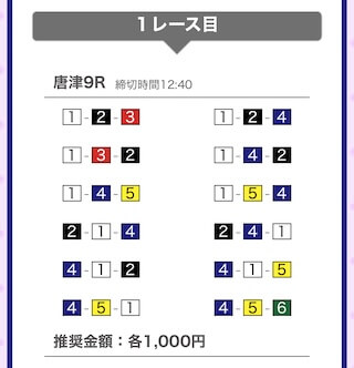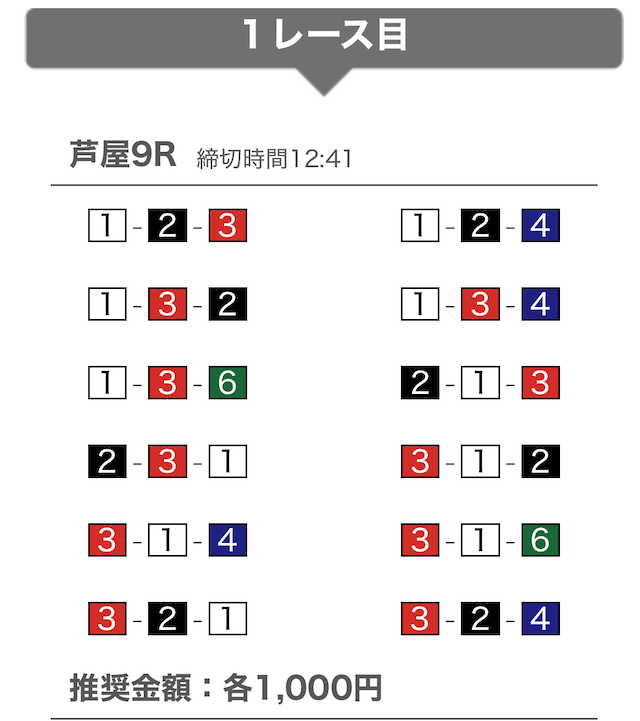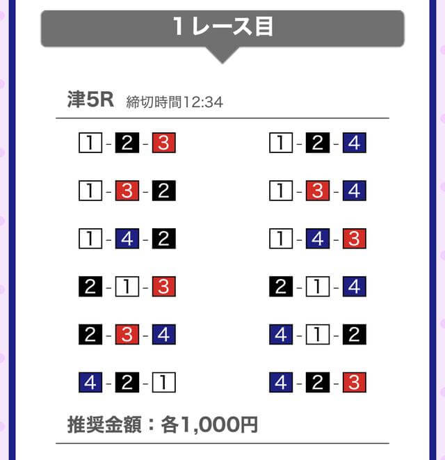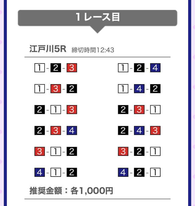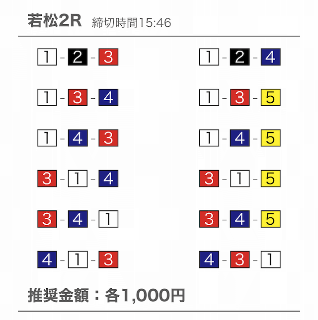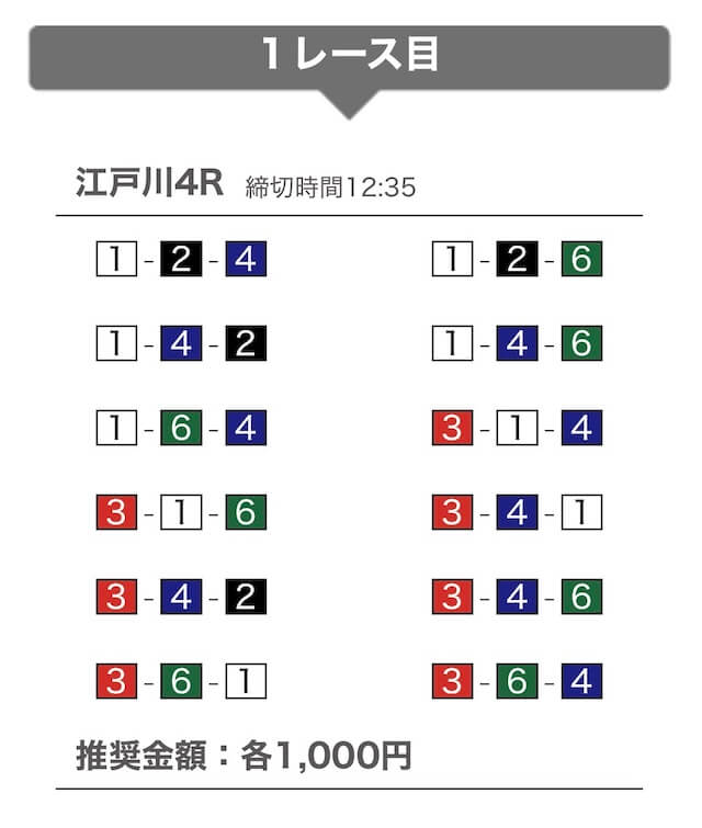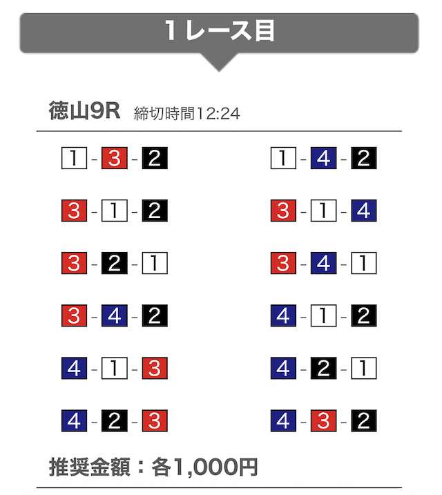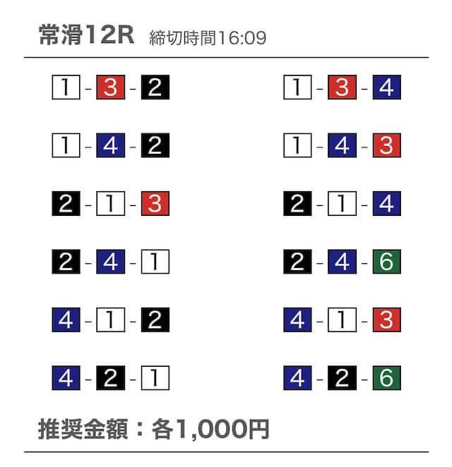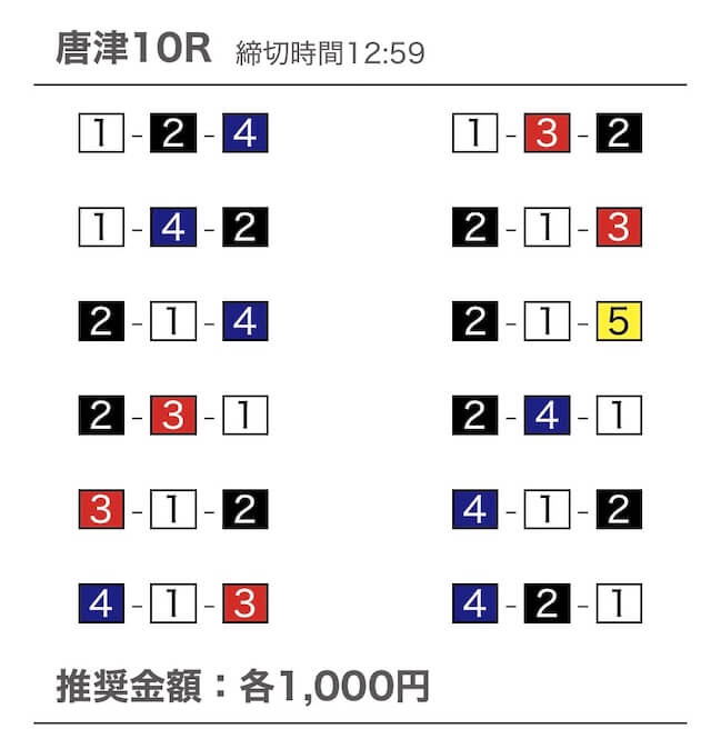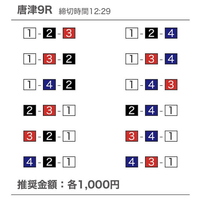 買い目は「①-②③④-②③④・②-①-③④」の組み合わせ。
