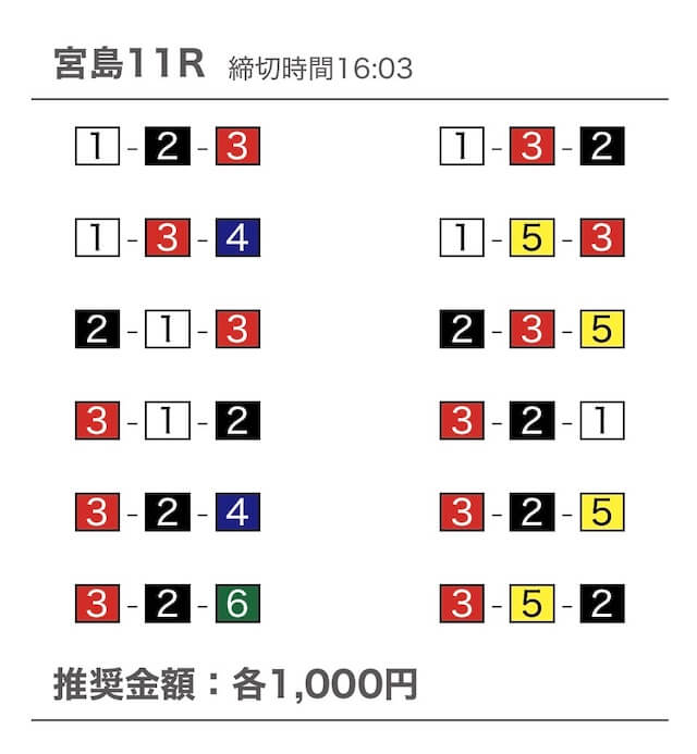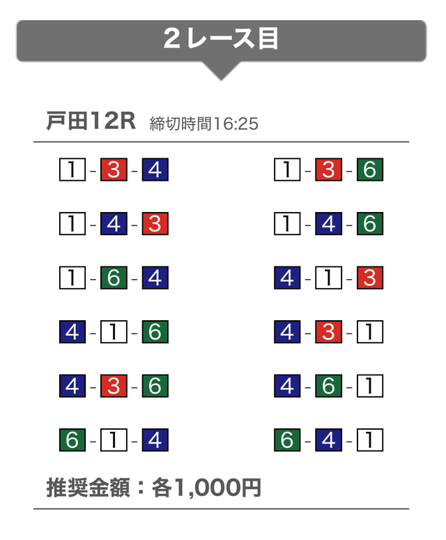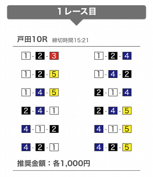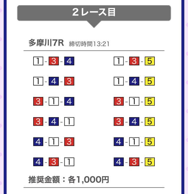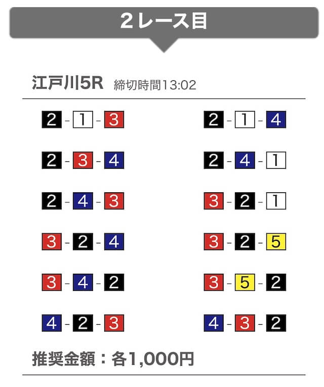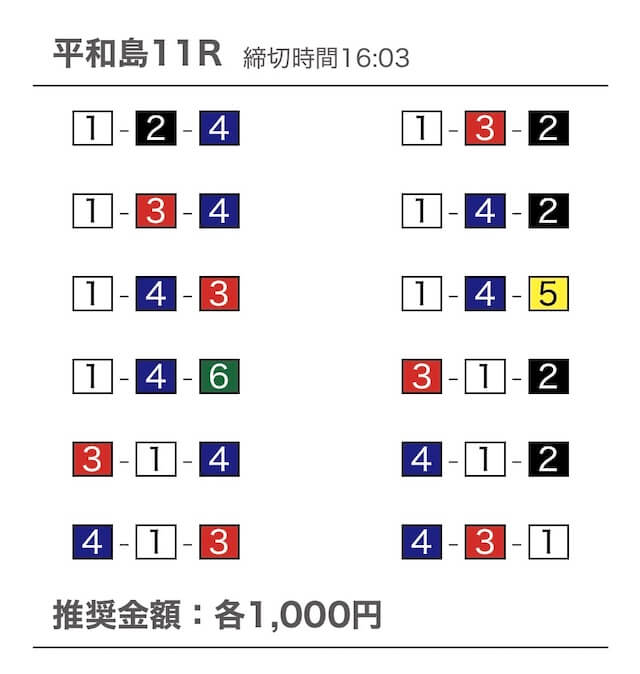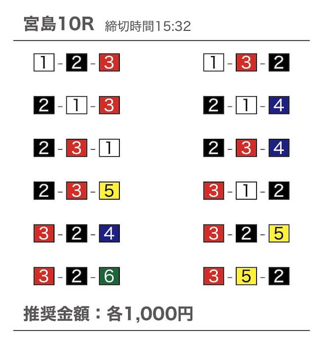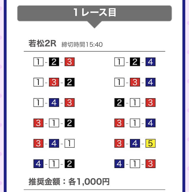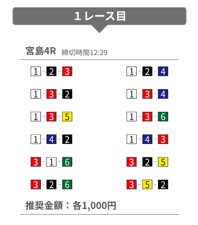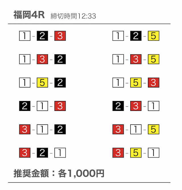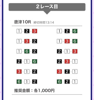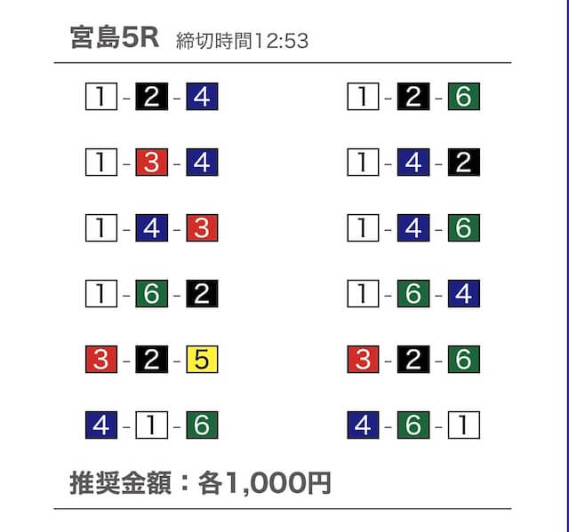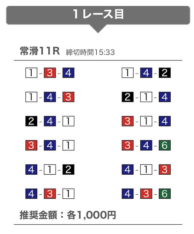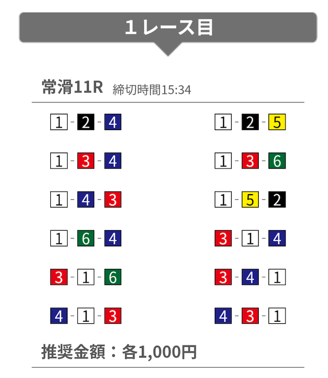 買い目は「①-②③④-②③④・②-①-③④」の組み合わせ。