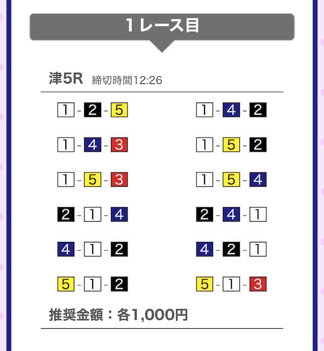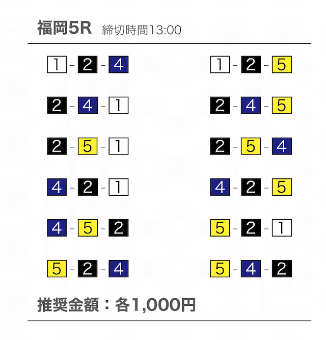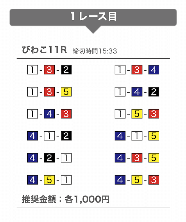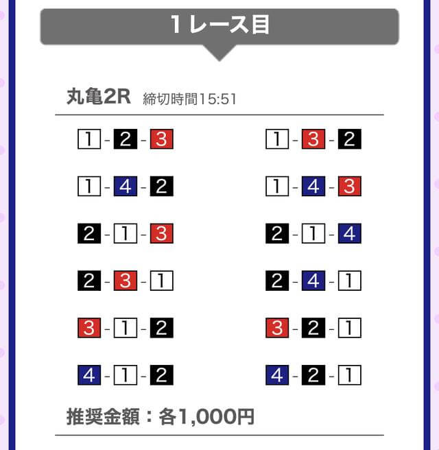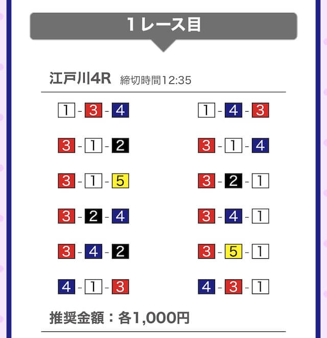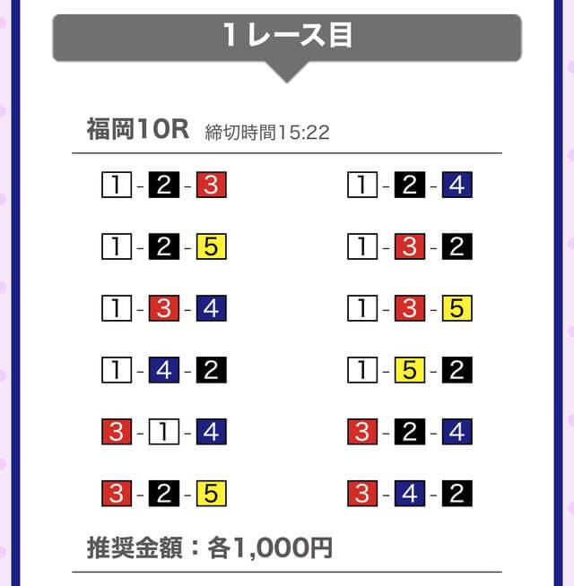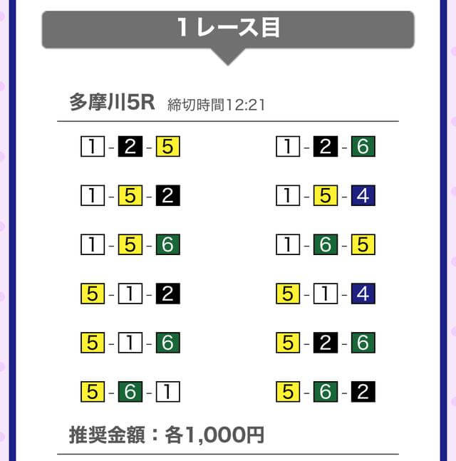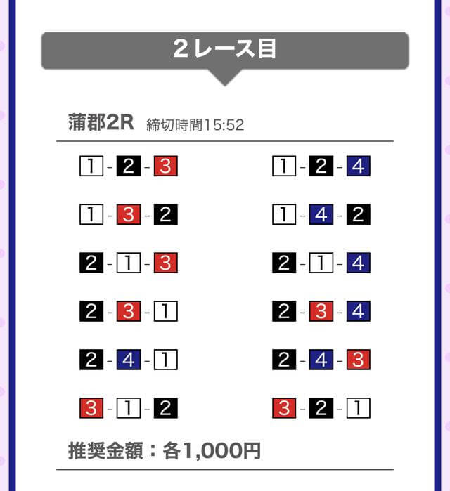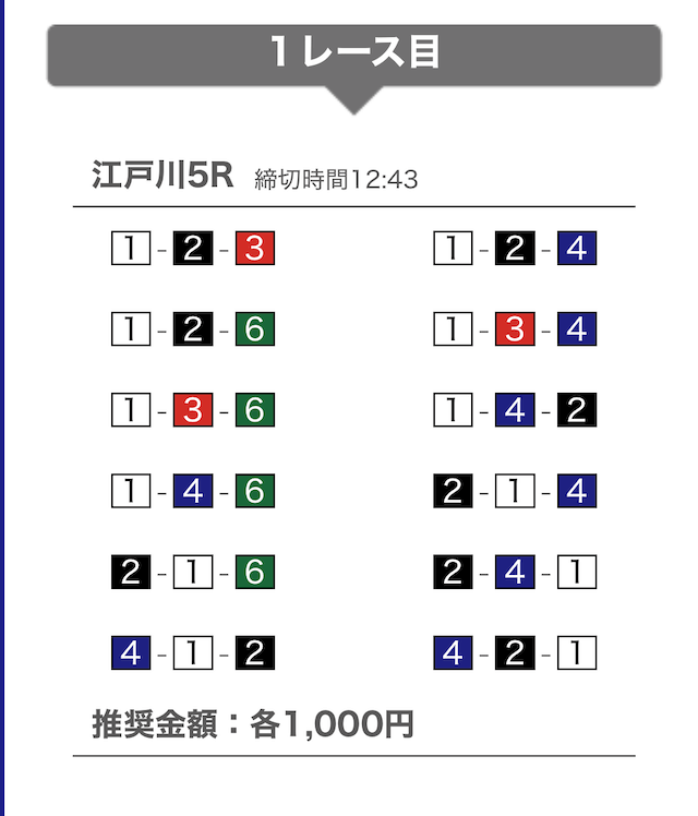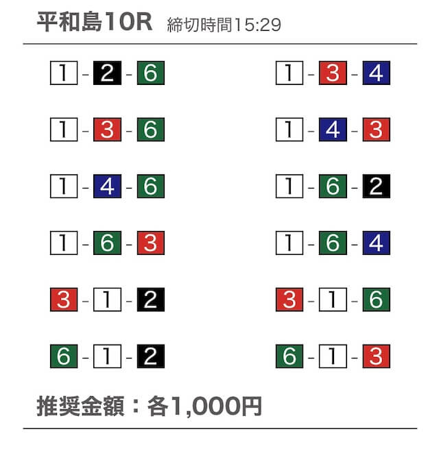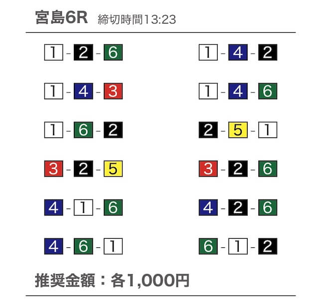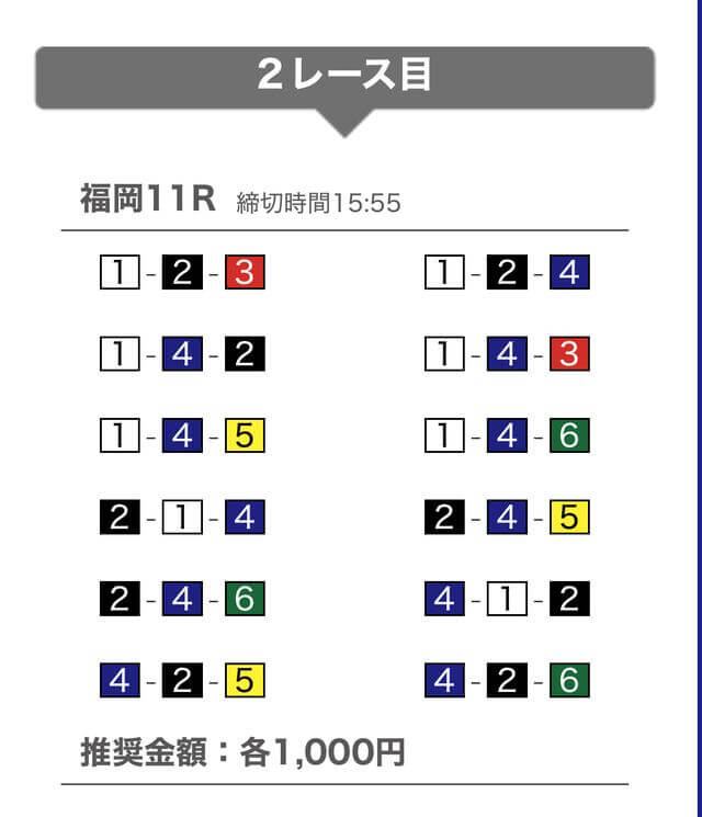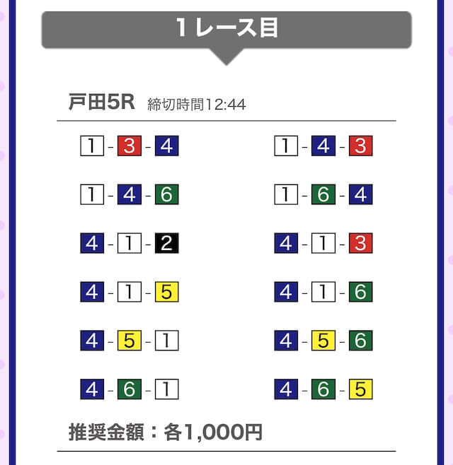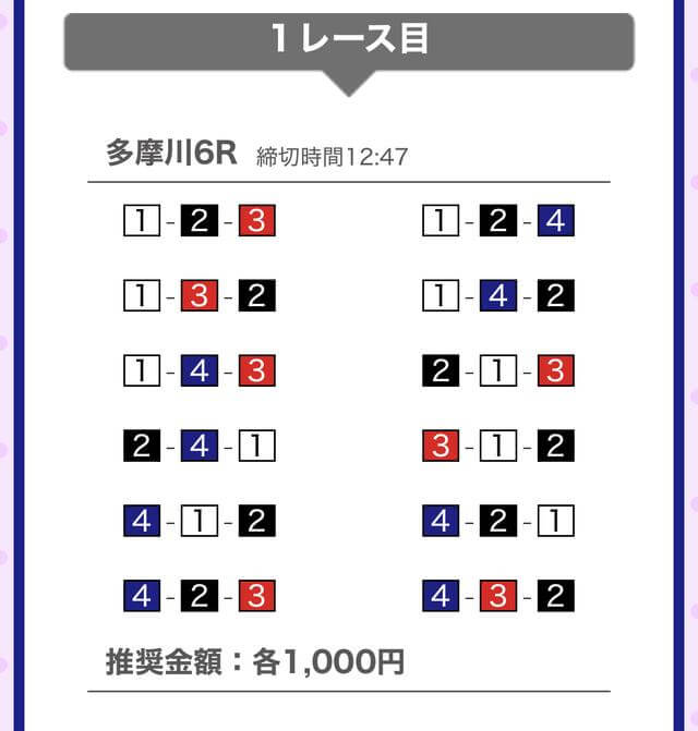 買い目は「①-②③④-②③④・②-①-③④」の組み合わせ。