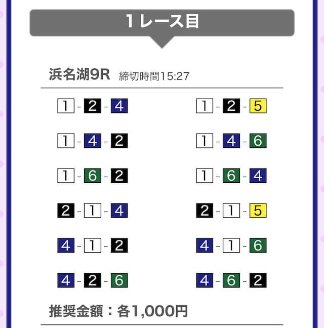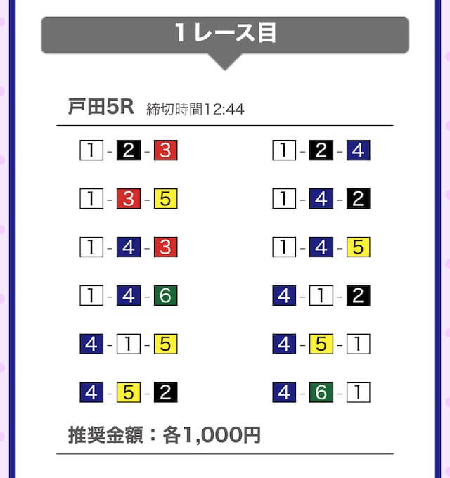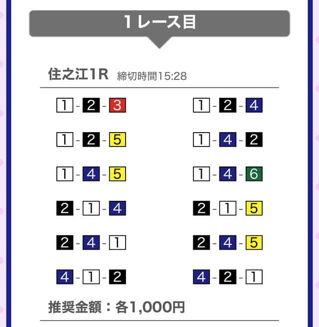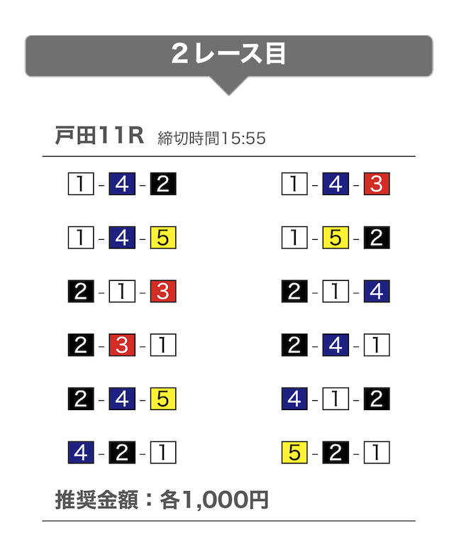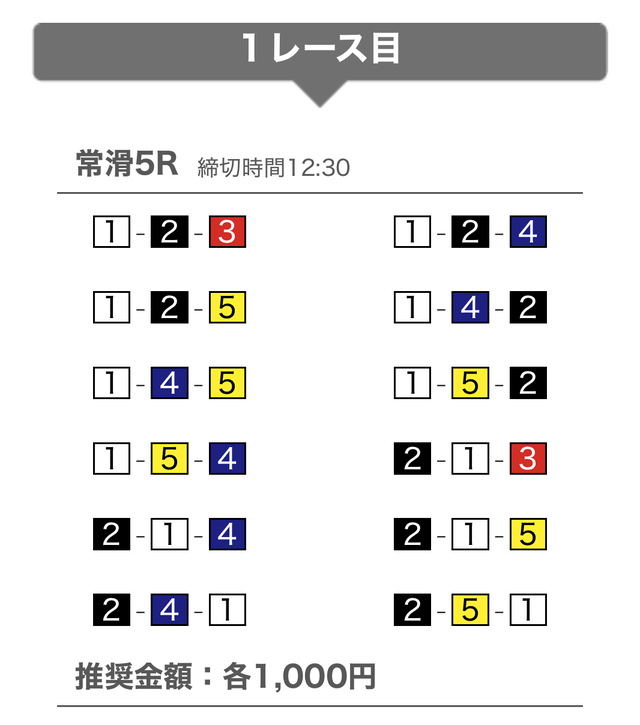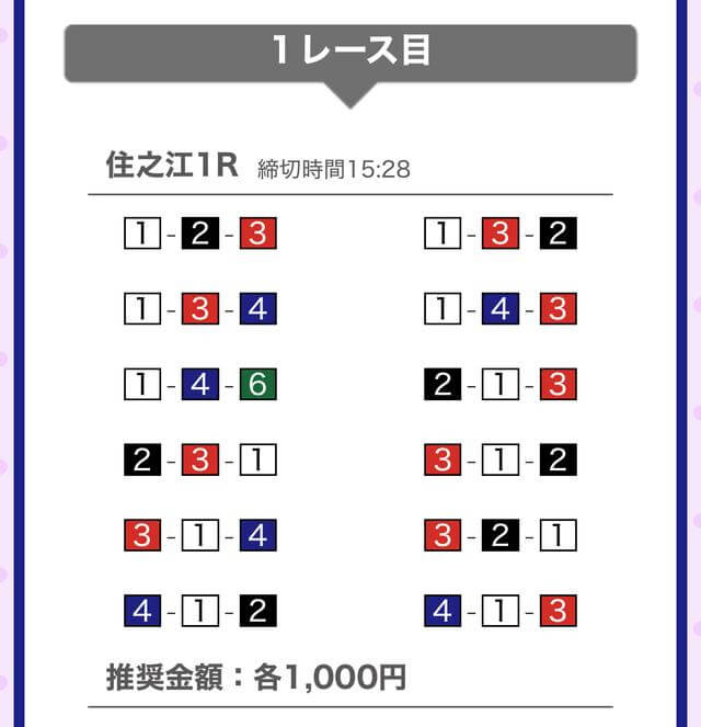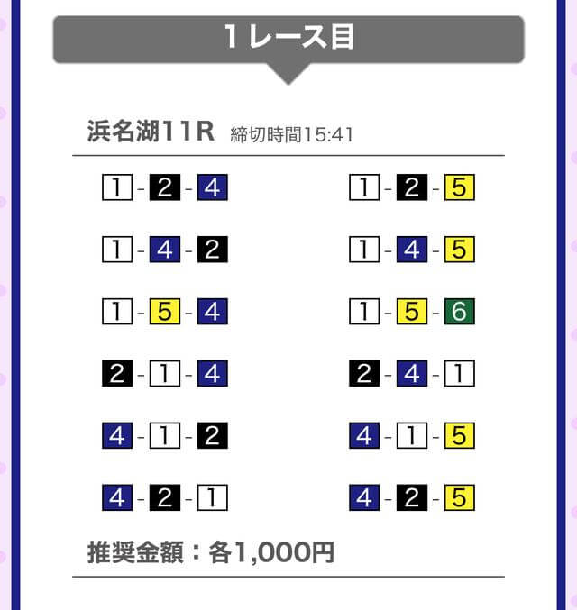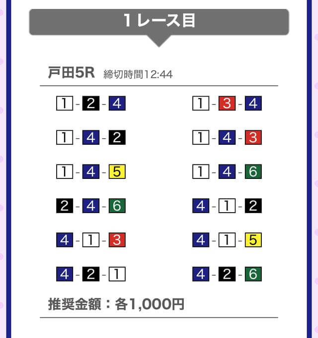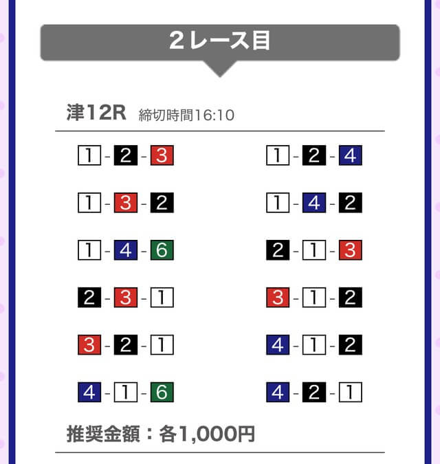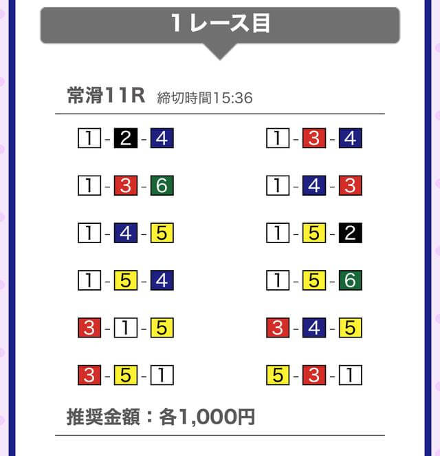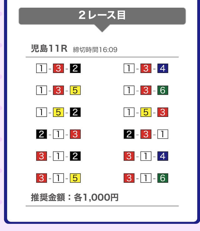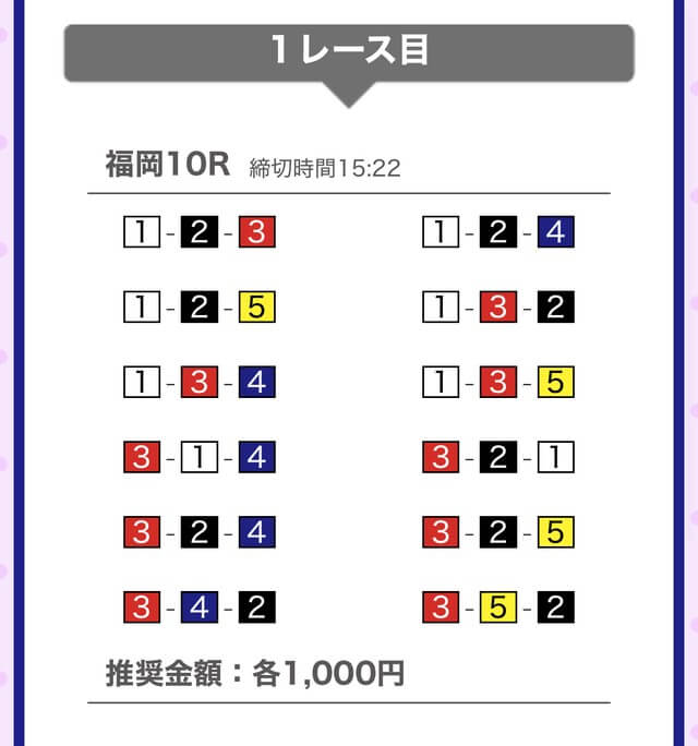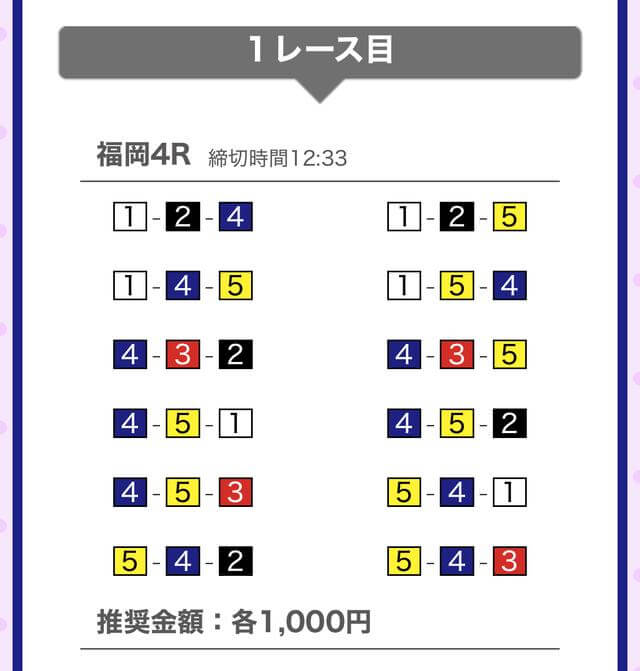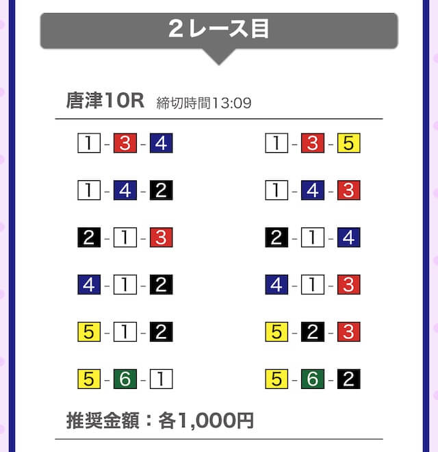 買い目は「①-②③④-②③④・②-①-③④」の組み合わせ。