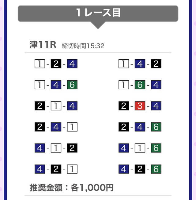 ピンキーウーマン高オッズのレースの3連単ここまで当ててくるサイトは見たことない! 売り切れ早いから、参加枠とか気にしなきゃいけないのはネックだけどw投稿日:2024/01/14
