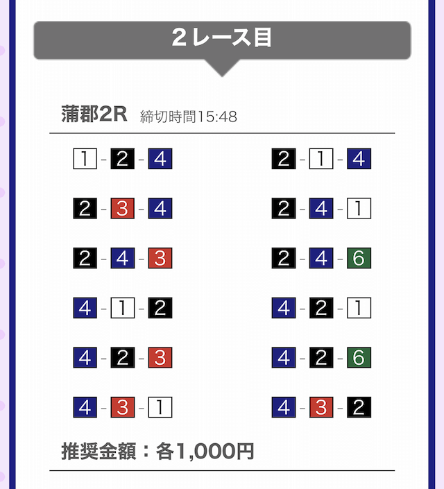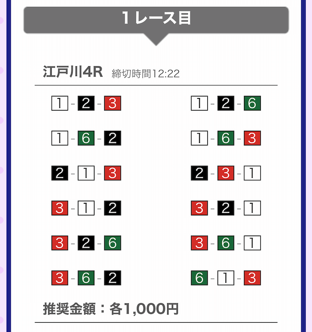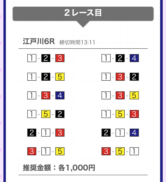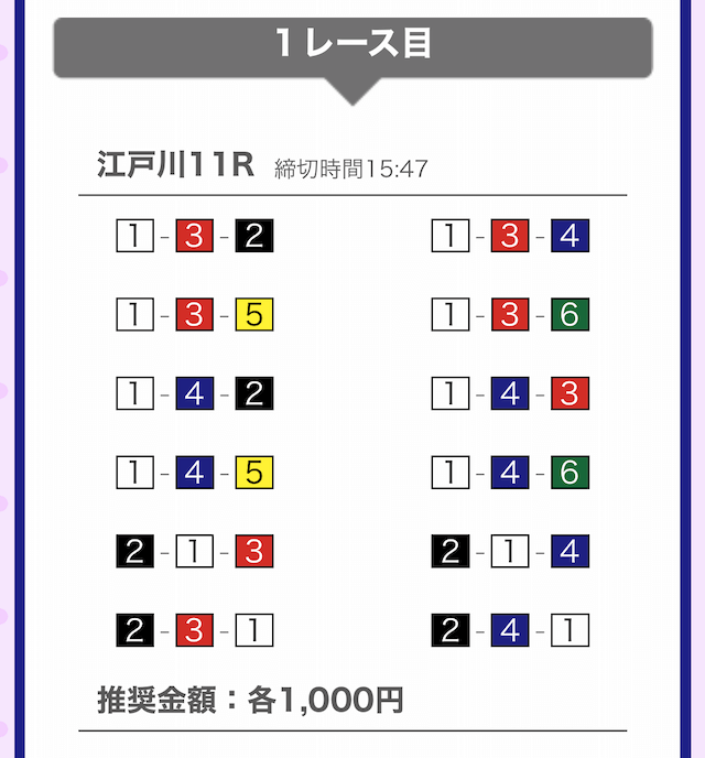 つまり、無料予想は江戸川8Rにて①-②-④に1,000円を賭けていることになります。