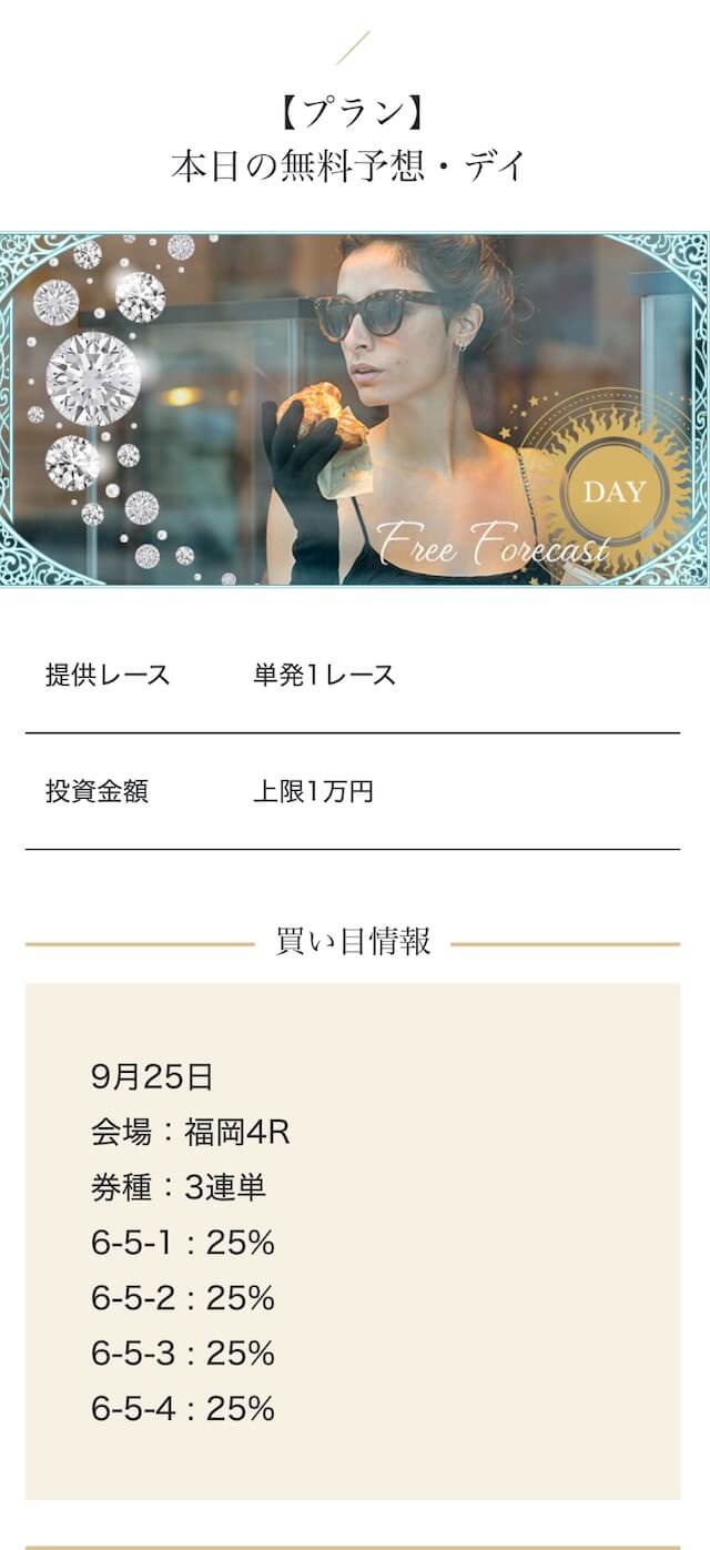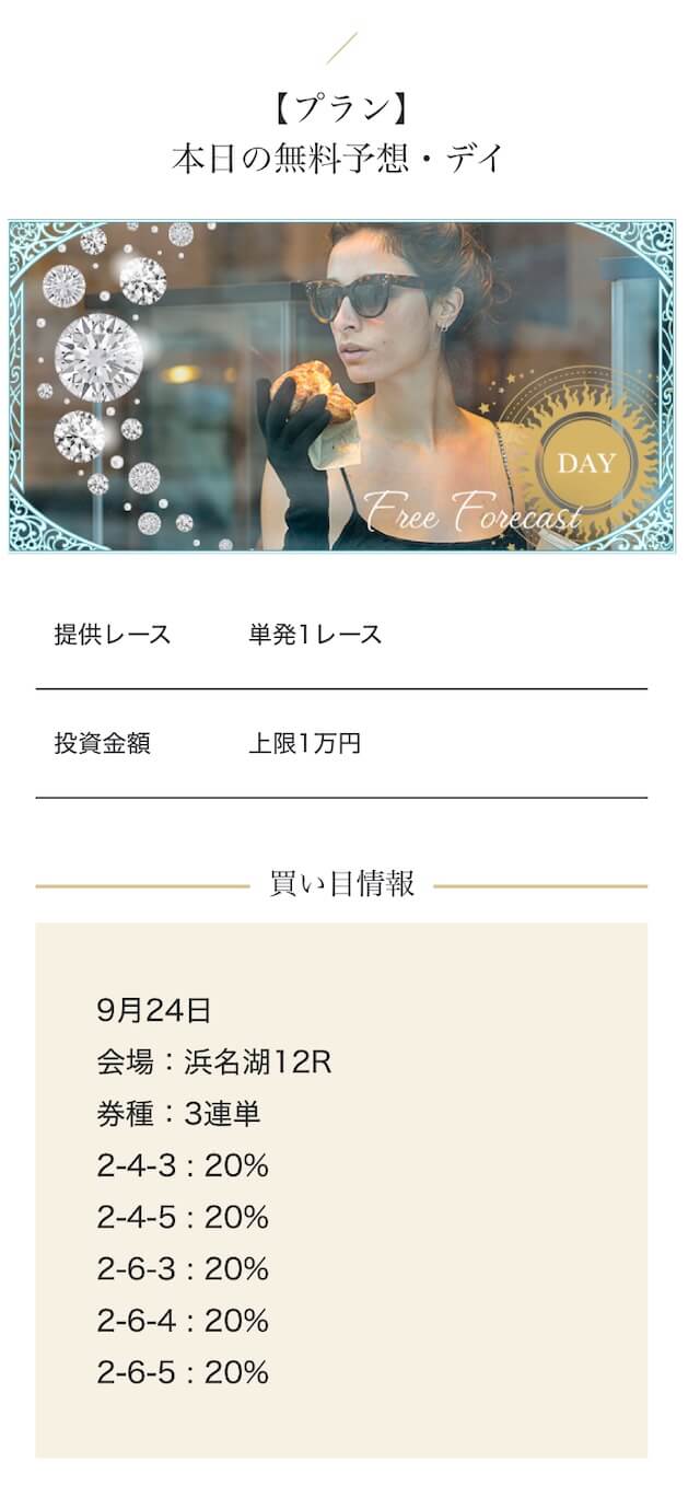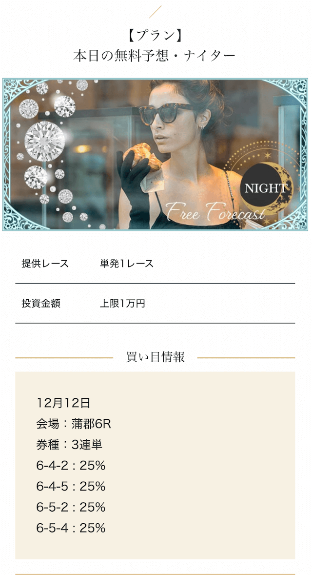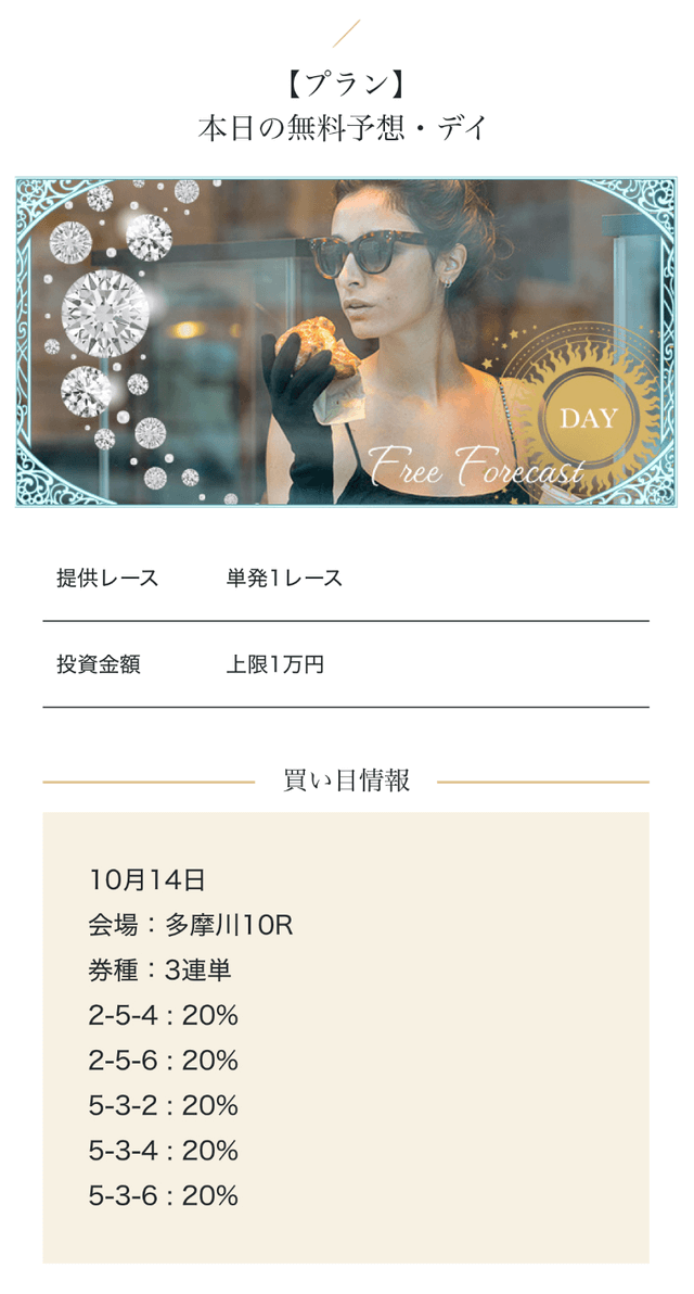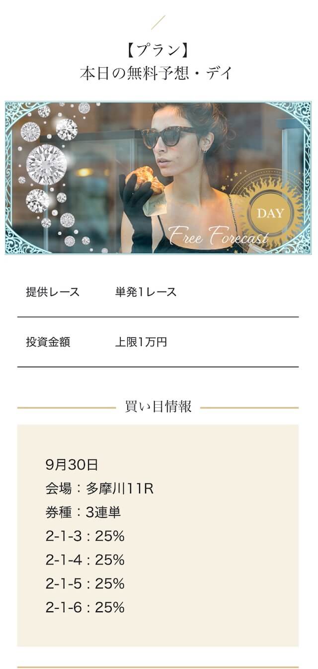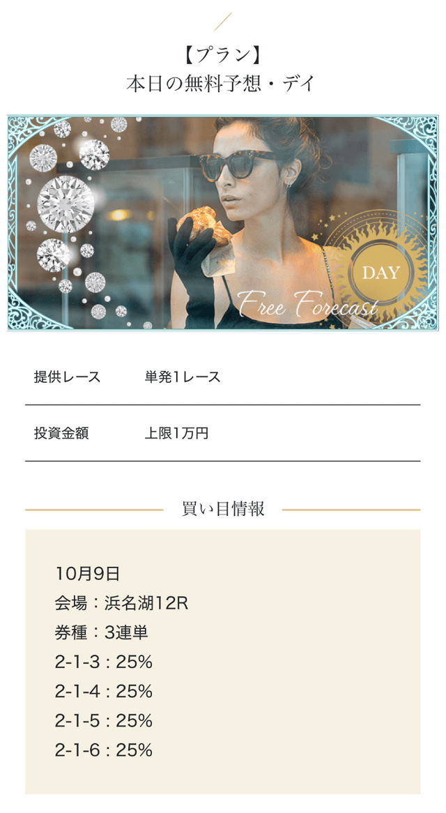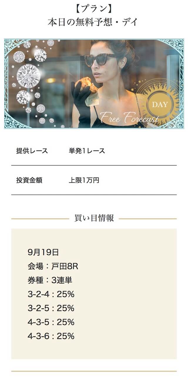 - 2025/09/10的中 無料予想で224,400円獲得2025/08/22的中 無料予想で57,050円獲得2025/06/18的中 無料予想で83,250円獲得2025/04/06的中 無料予想で59,200円獲得2025/03/05的中 無料予想で39,600円獲得2025/02/12的中 無料予想で30,750円獲得2025/01/21的中 無料予想で784,250円獲得2025/01/17的中 無料予想で129,250円獲得2025/01/10的中 無料予想で61,500円獲得2024/12/30的中 無料予想で254,600円獲得