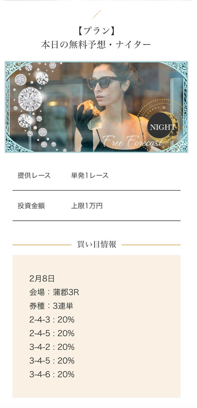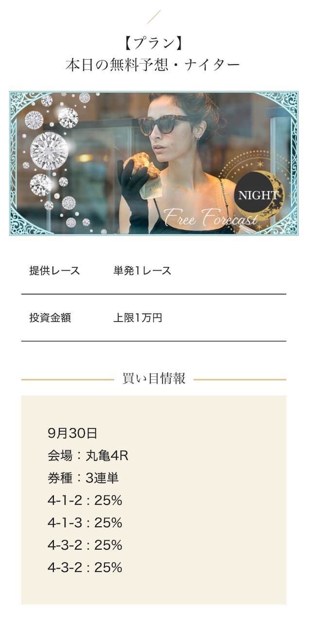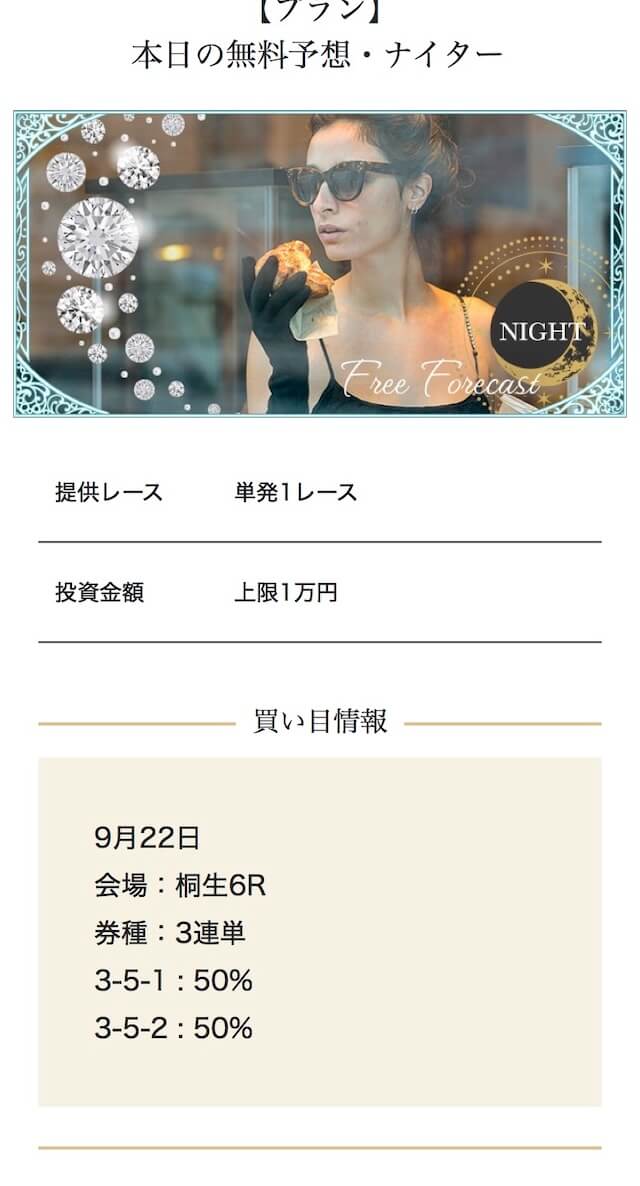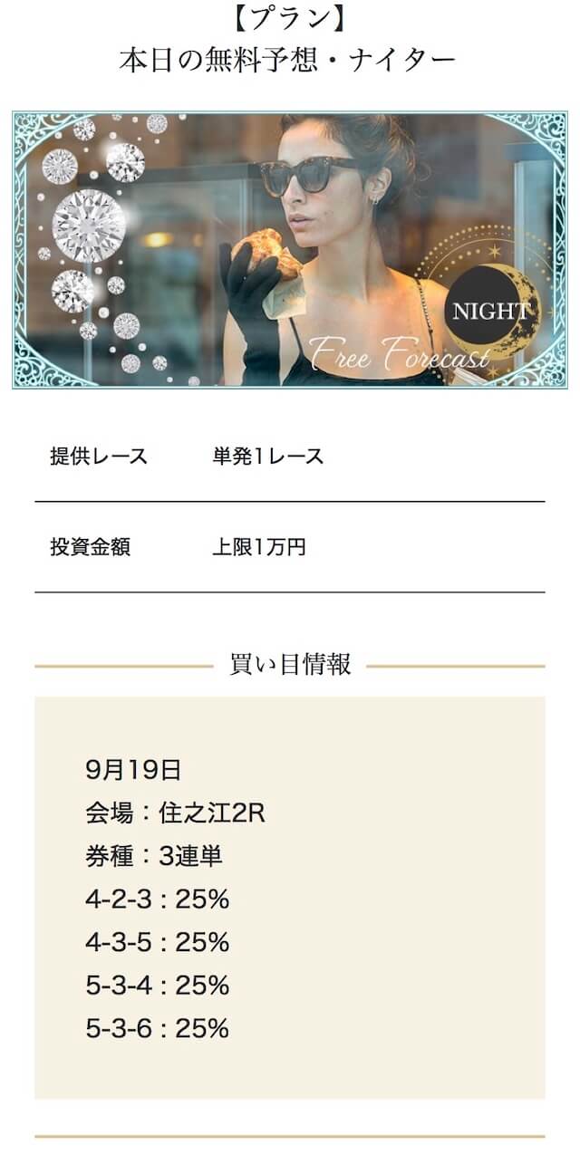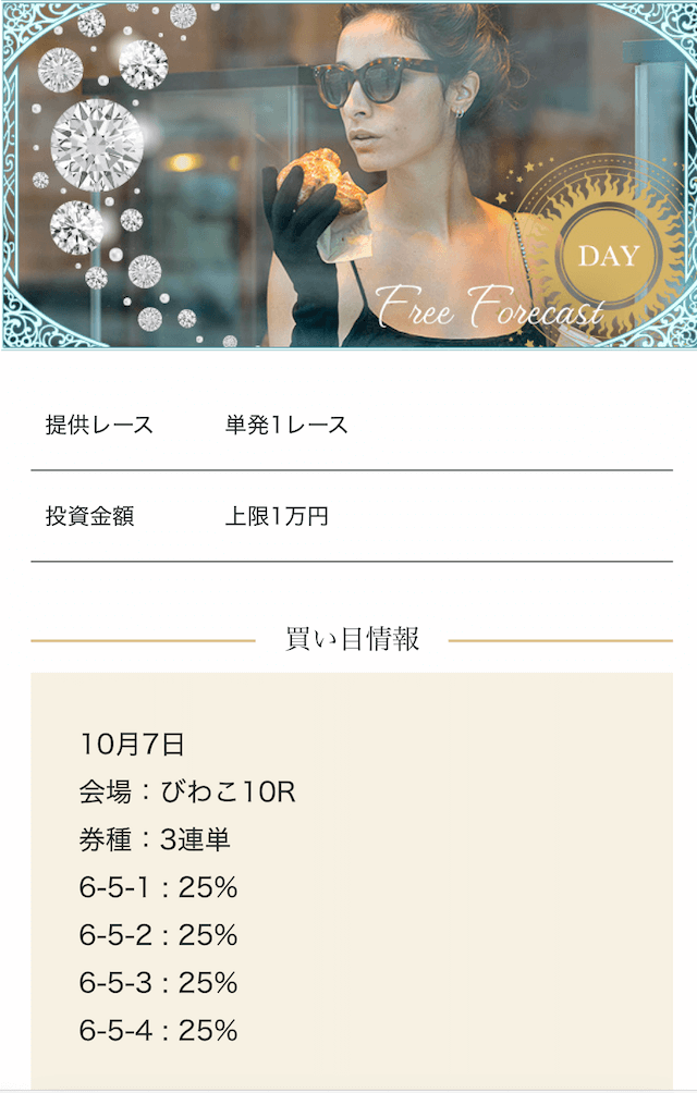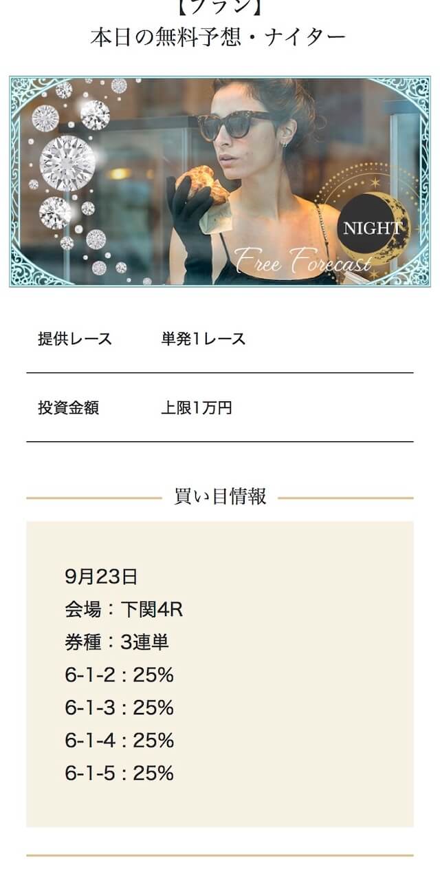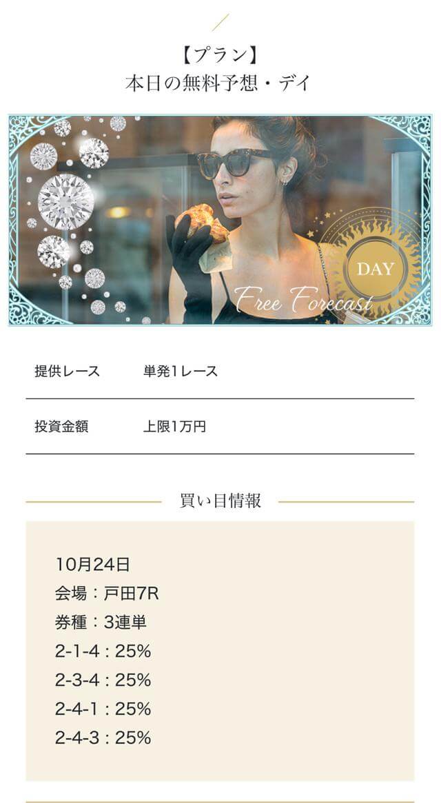 - 2025/09/10的中 無料予想で224,400円獲得2025/08/22的中 無料予想で57,050円獲得2025/06/18的中 無料予想で83,250円獲得2025/04/06的中 無料予想で59,200円獲得2025/03/05的中 無料予想で39,600円獲得2025/02/12的中 無料予想で30,750円獲得2025/01/21的中 無料予想で784,250円獲得2025/01/17的中 無料予想で129,250円獲得2025/01/10的中 無料予想で61,500円獲得2024/12/30的中 無料予想で254,600円獲得