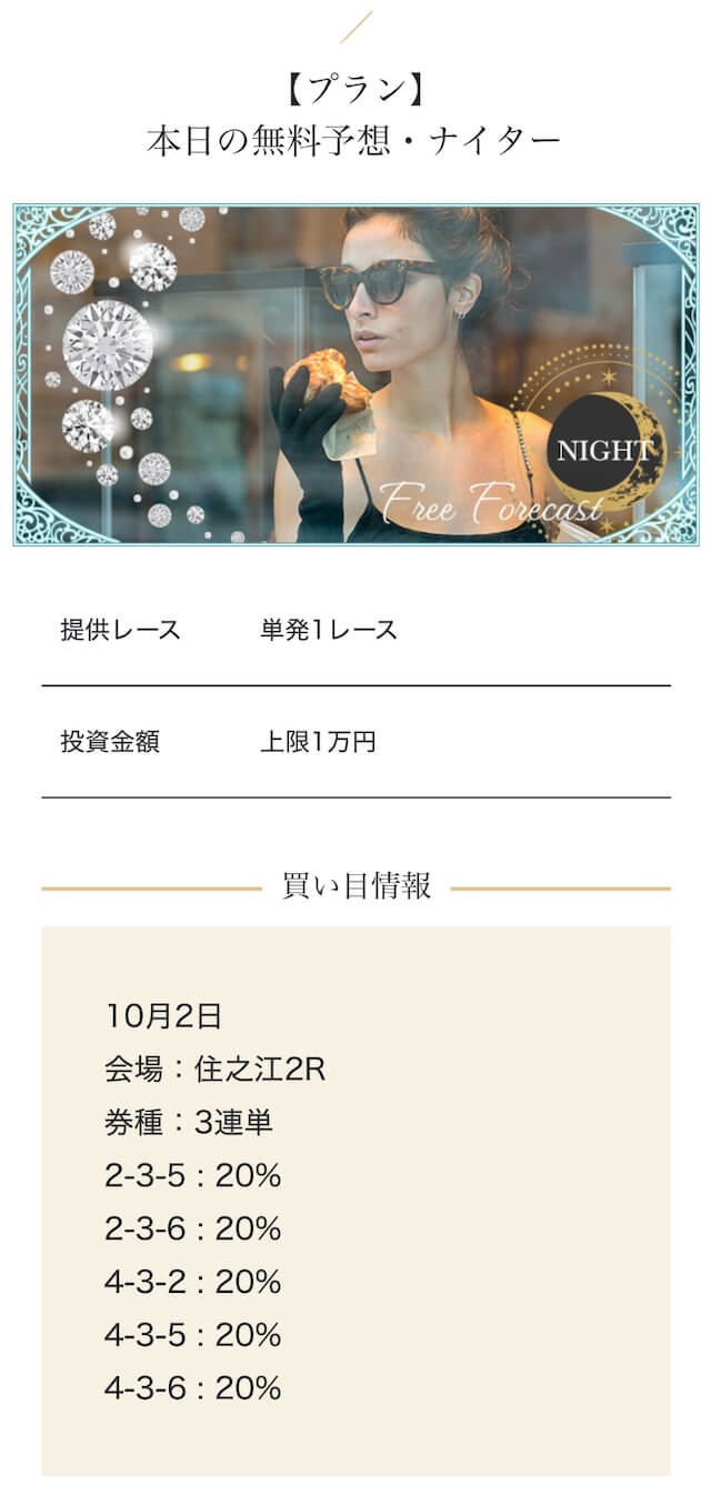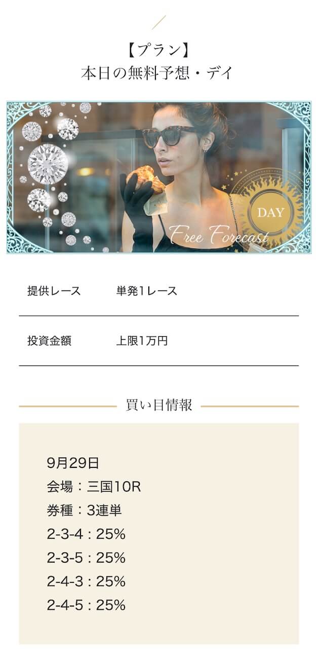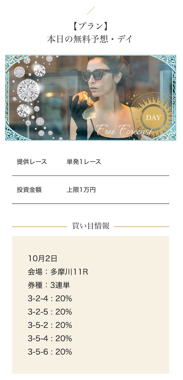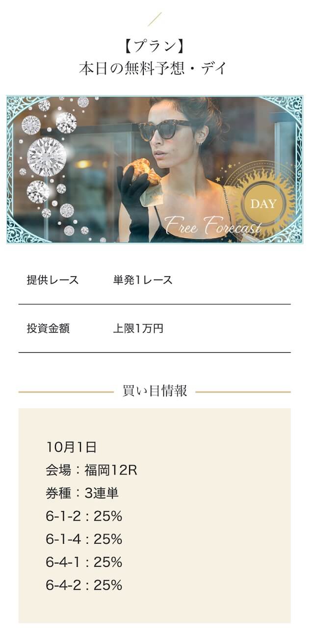 - 高額プランを試したが、思ったほどの爆発力は感じなかった。期待が大きすぎたかもしれない・・・。結果的にプラったから良いけど、1レースで負けた時はハラハラしましたよ・・・。投稿日:2025/10/02