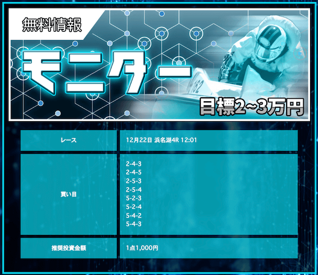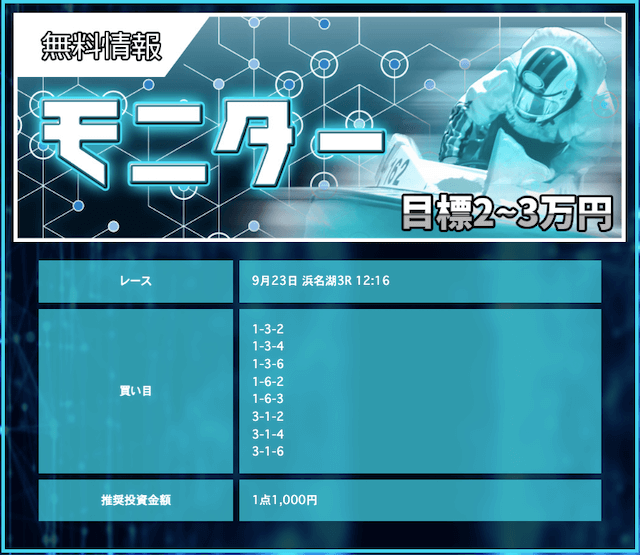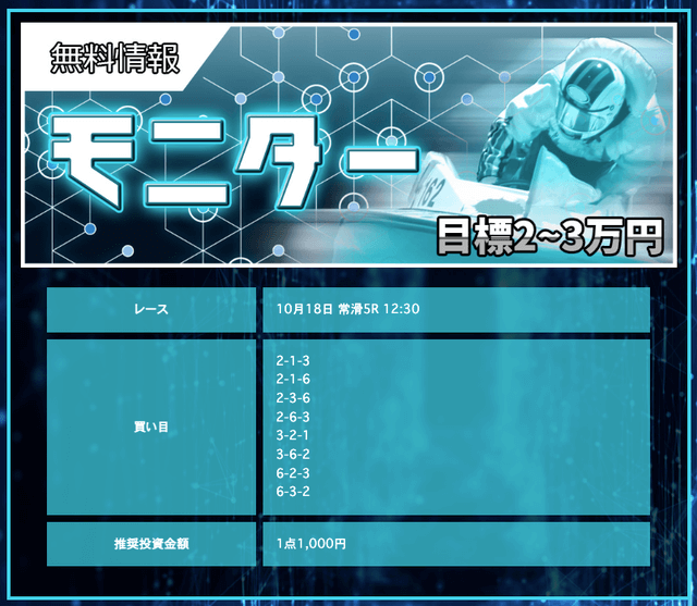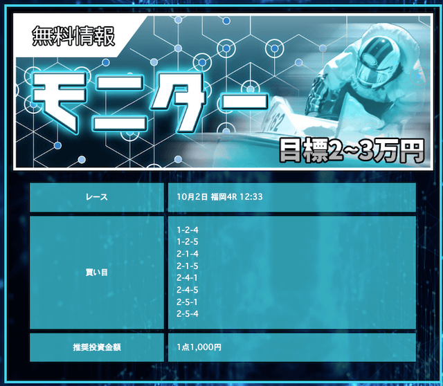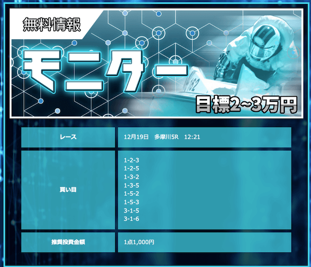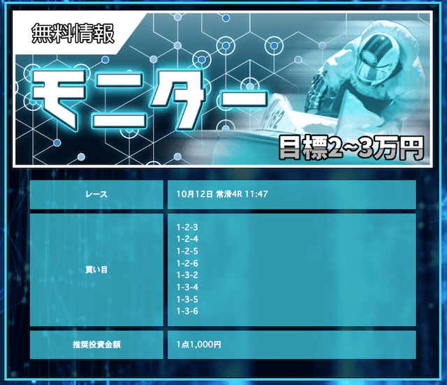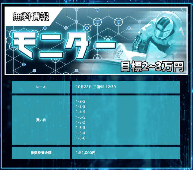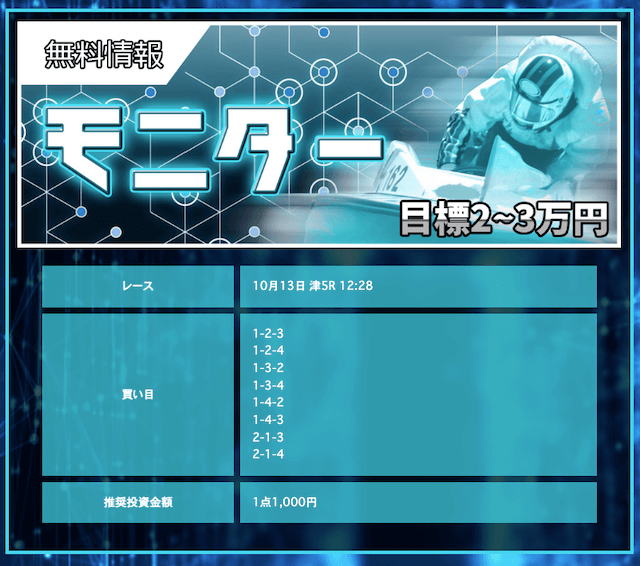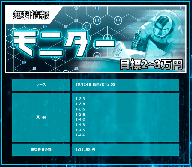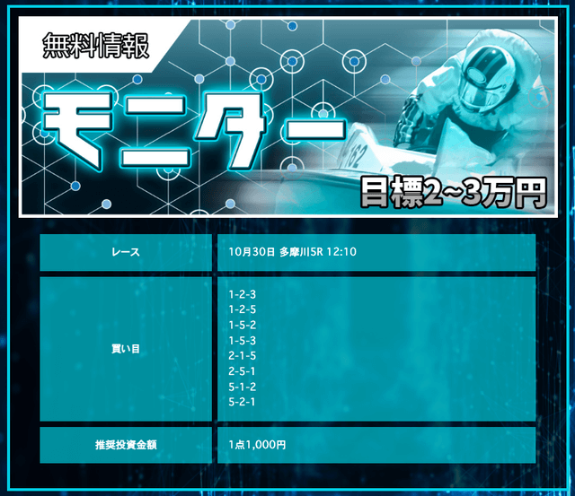 競艇戦線が参加したところ3戦負け無し!情報料金は4万円と、無料予想に1週間ほど参加すれば稼げる金額です。つまり手持ちが少なくても来週中には50万円以上を狙えるということ。リスクを抑えて大勝ちできるプランなので大注目です!