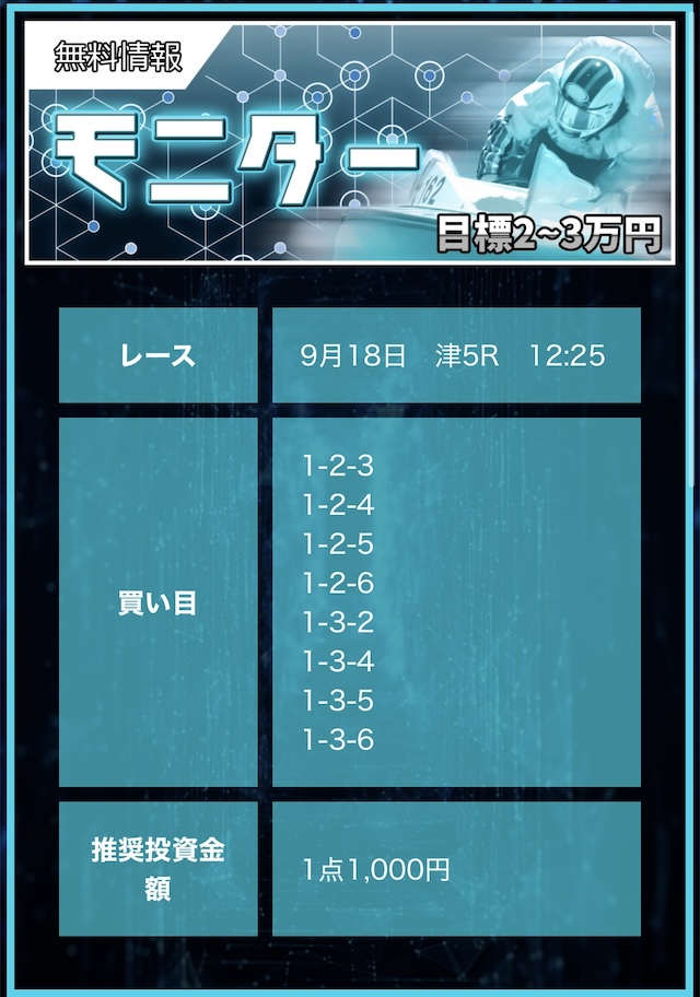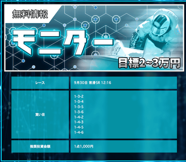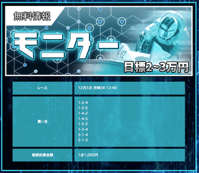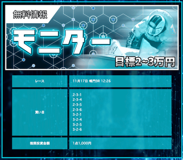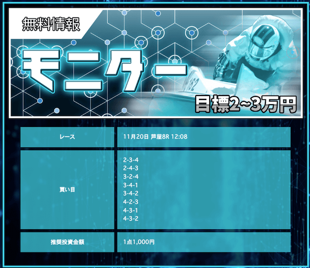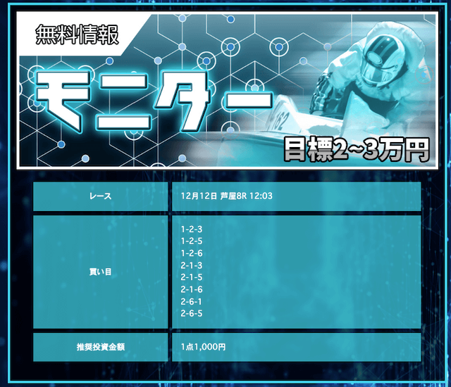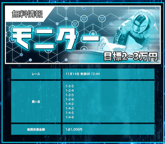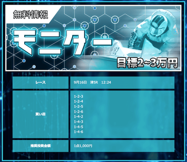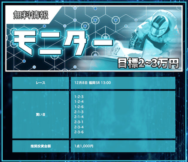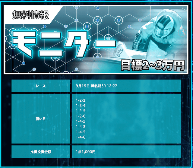 競艇戦線が参加したところ3戦負け無し!情報料金は4万円と、無料予想に1週間ほど参加すれば稼げる金額です。つまり手持ちが少なくても来週中には50万円以上を狙えるということ。リスクを抑えて大勝ちできるプランなので大注目です!