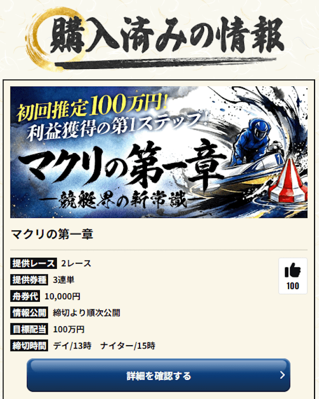 軍資金が貯まれば、次のステップとして有料予想の「マクリの第一章」に参加しましょう。検証時には3回の参加ですべてコロガシに成功し、480万円以上の利益を獲得しました。最も投資効率が良く、最初の有料予想として最適です。