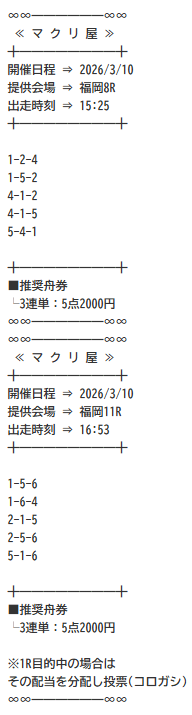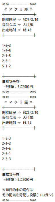 | 2026/03/09 | 戸田10R [📷] | ○ | 83,600円 |
