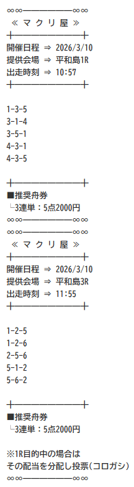 匿名3/10の無料予想、平和島7Rで5号艇が絡む展開を見事に的中。11万円以上の払い戻し!三連複で万舟ってなかなかお目にかかれないけど、マクリ屋なら日常茶飯事なのかもしれない。投稿日:2026/03/12
