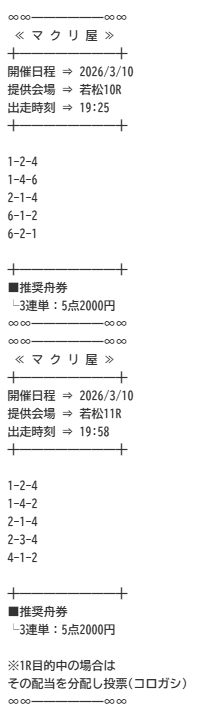 匿名無料予想が1会場の全レース提供されるので、自分の都合の良い時間に勝負できるのが嬉しい。私は全部は買わず、展示を見てから良さそうなレースだけチョイスしてますが、それでも回収率1000%超えてます。投稿日:2026/03/13