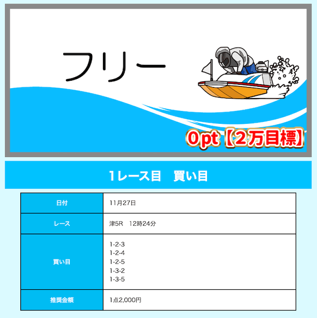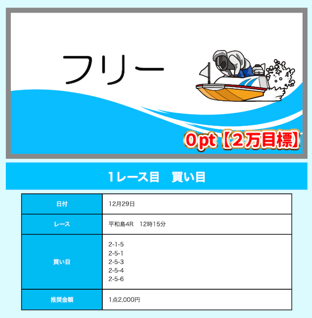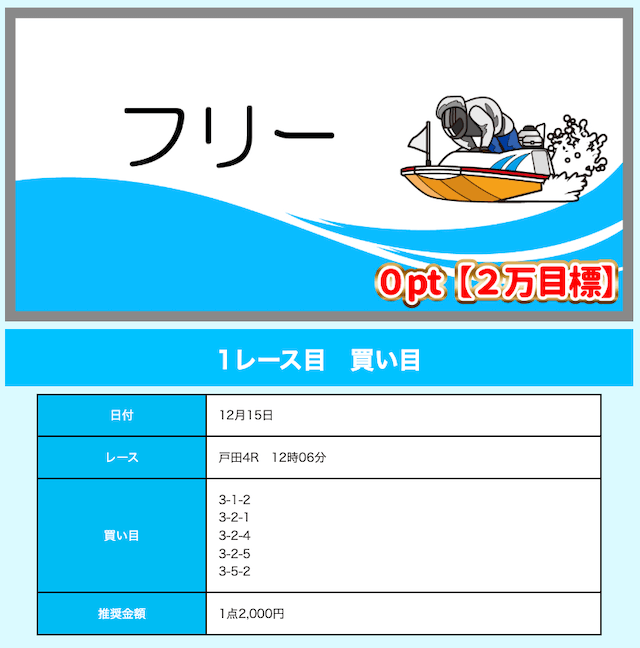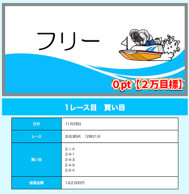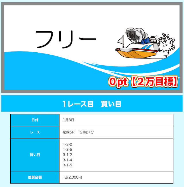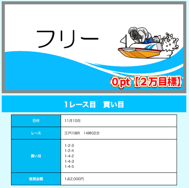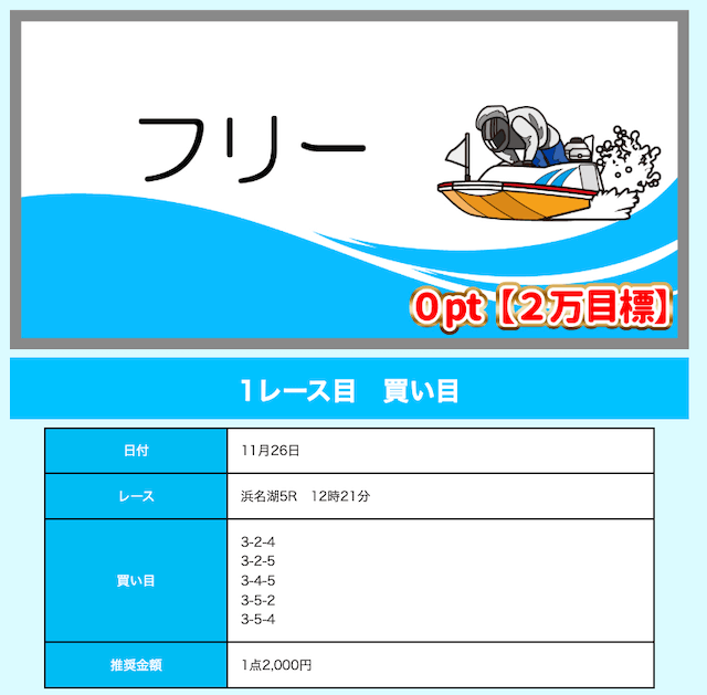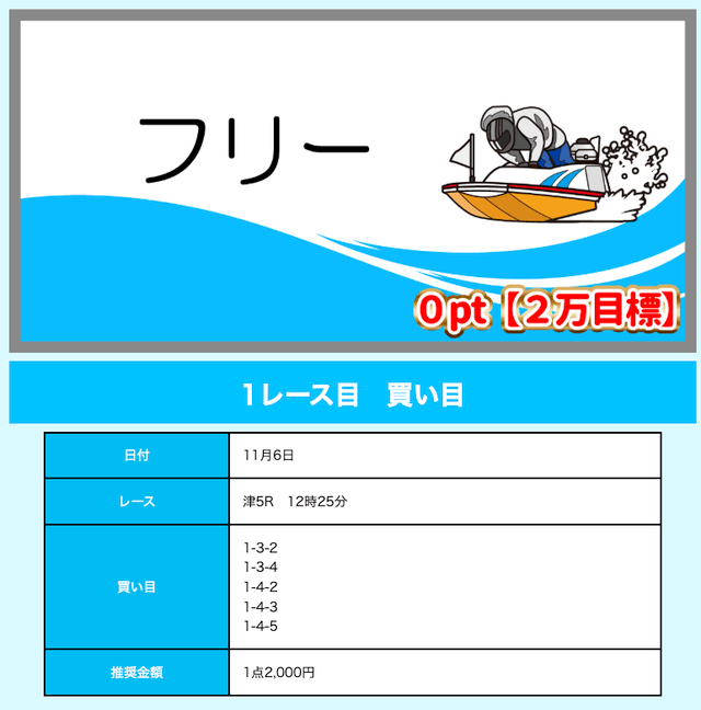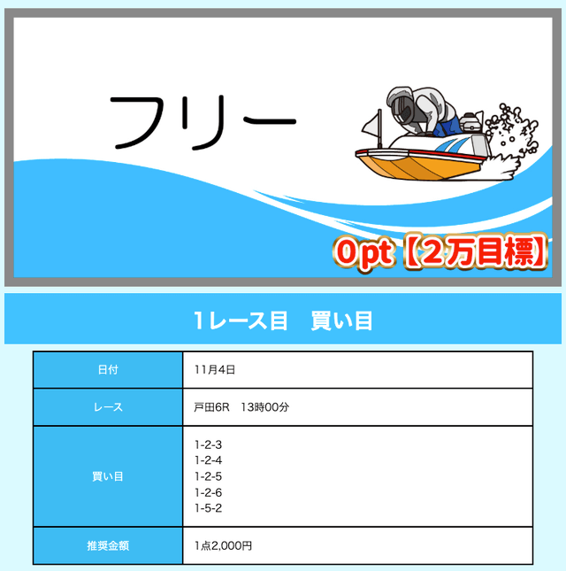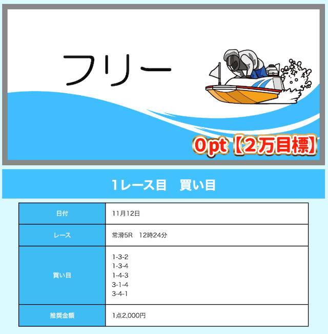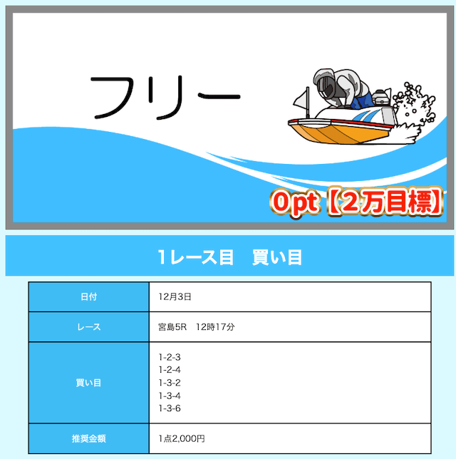 - 舟券代が1万円固定と比較的安め(有料予想)