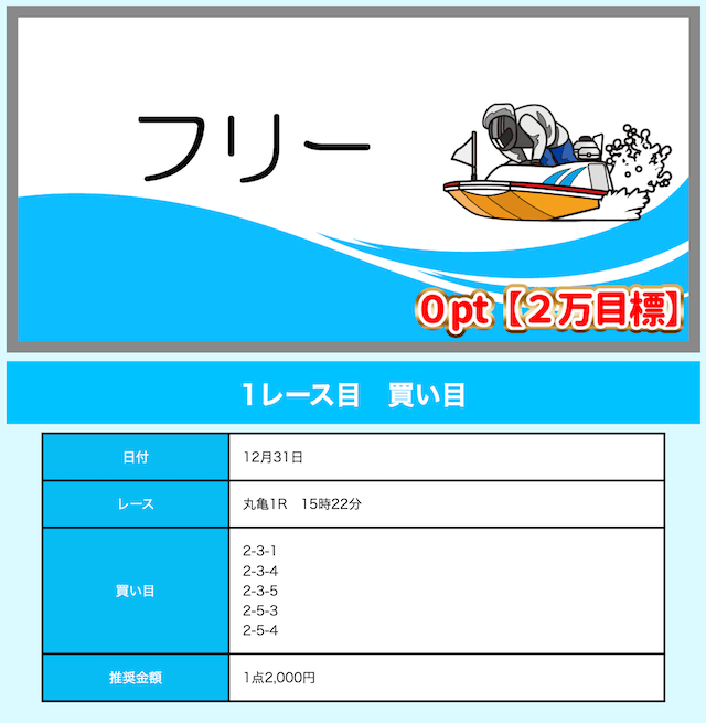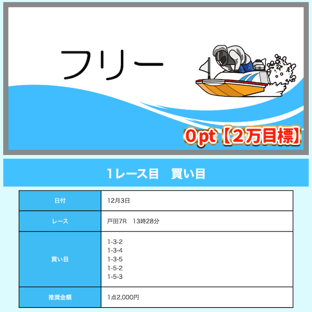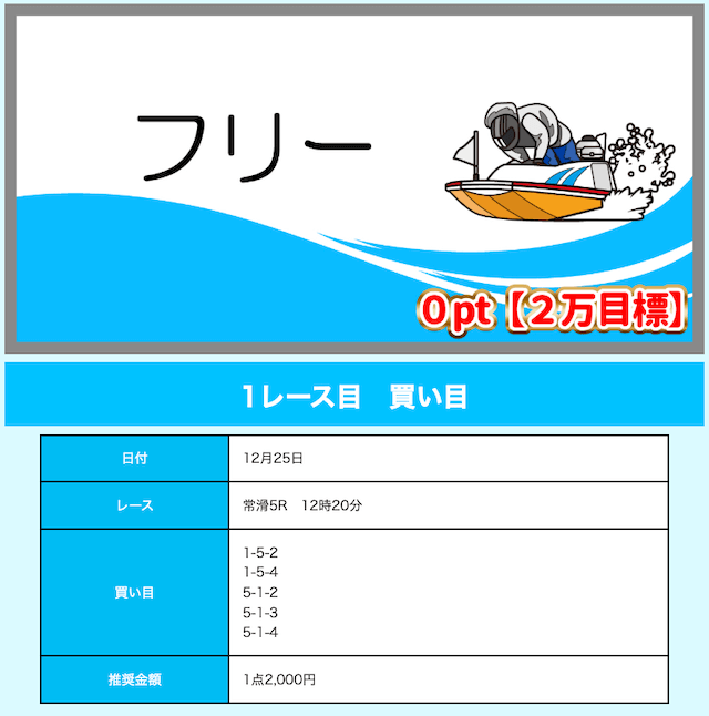 - 推奨舟券代:10,000円(1点2,000円)