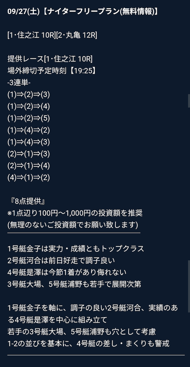 最初は裏があるんじゃないかと疑ってましたけど、今は安心して使ってます。 特に週末は3戦2勝くらいのペースで来てるので、下手な有料より使えます。投稿日:2025/08/02