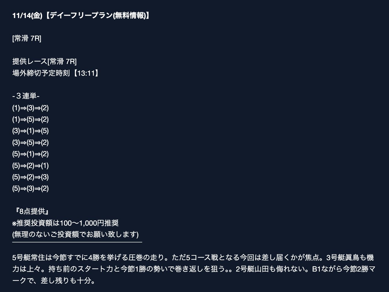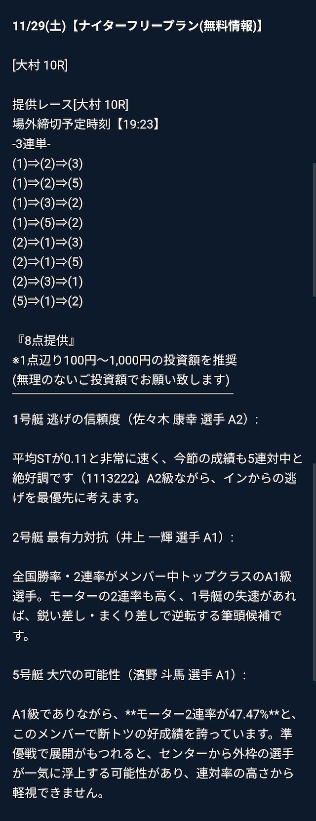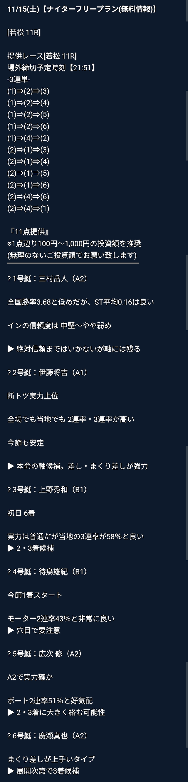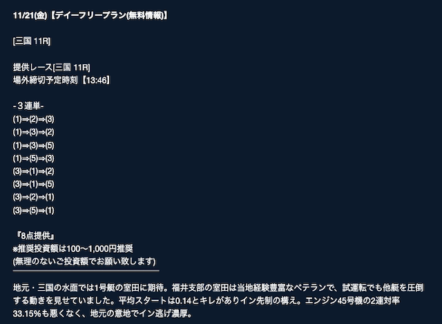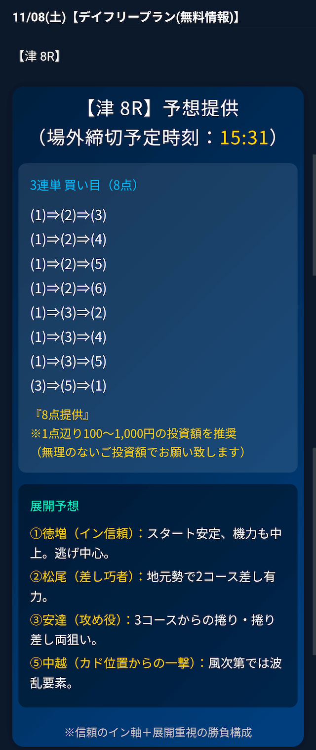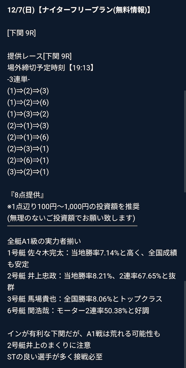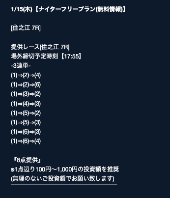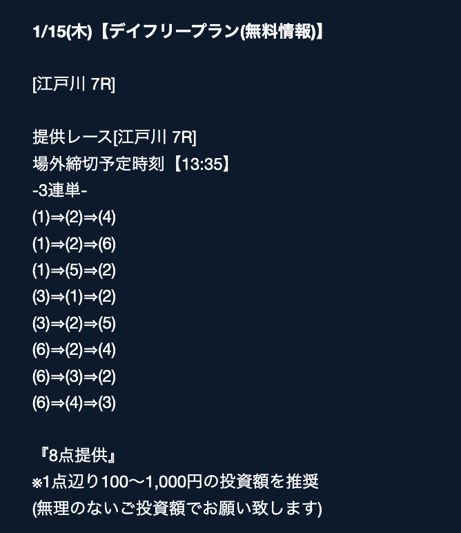 匿名最初は裏があるんじゃないかと疑ってましたけど、今は安心して使ってます。 特に週末は3戦2勝くらいのペースで来てるので、下手な有料より使えます。投稿日:2025/08/02