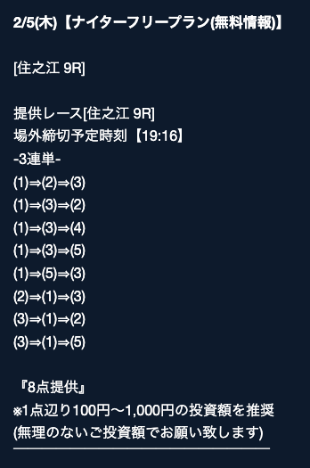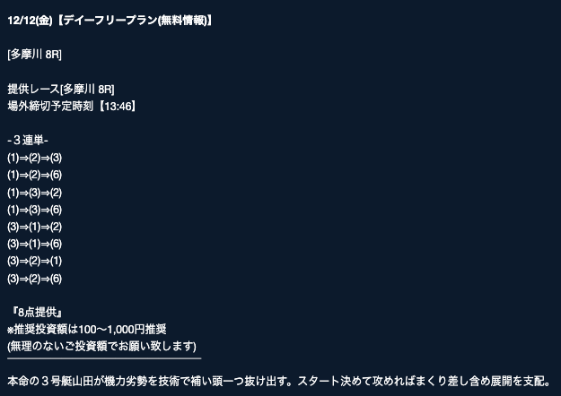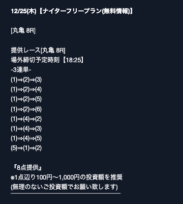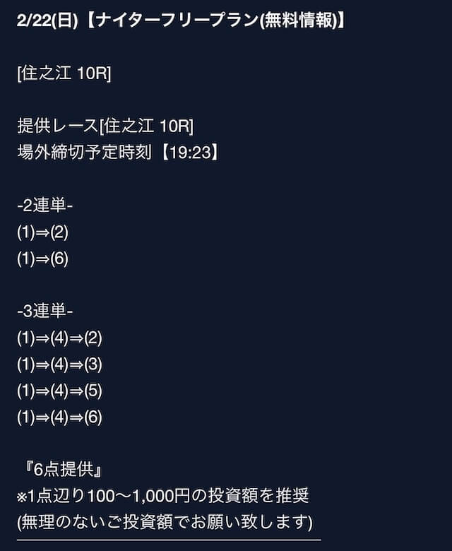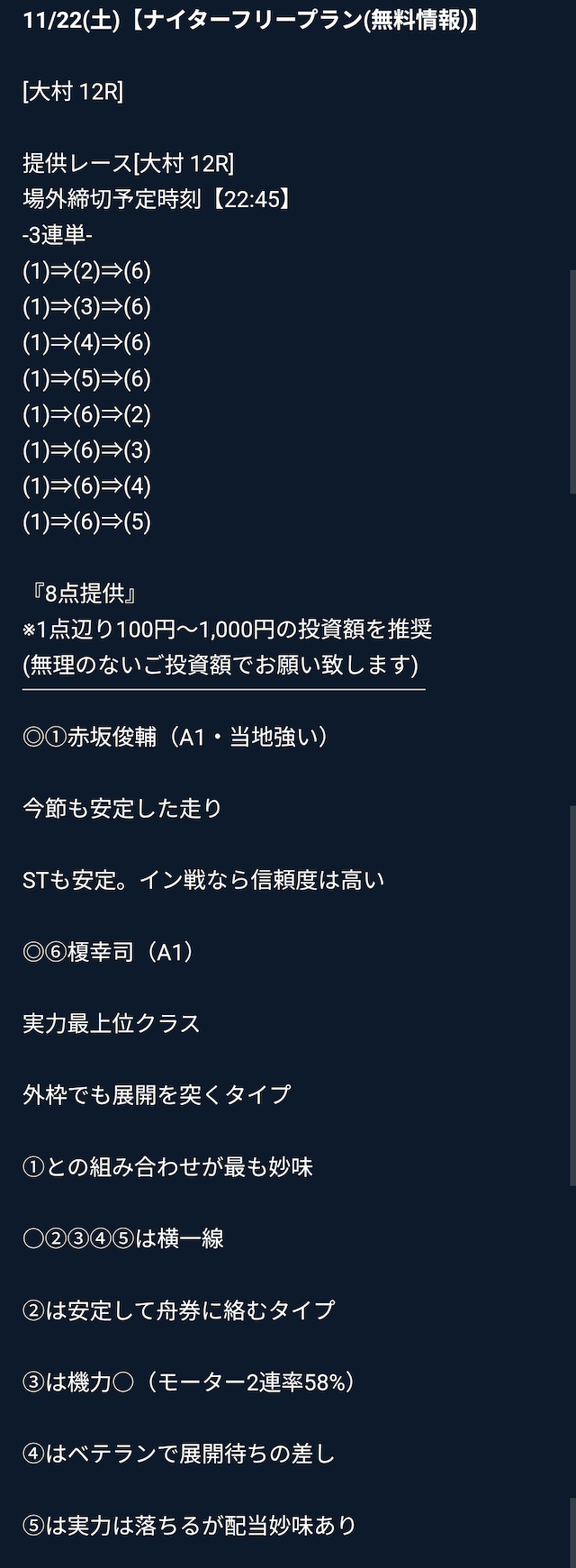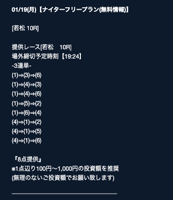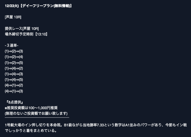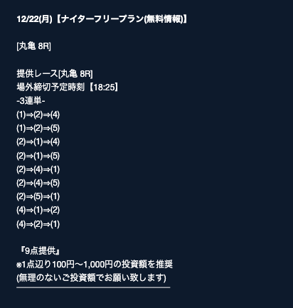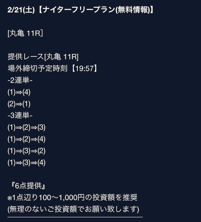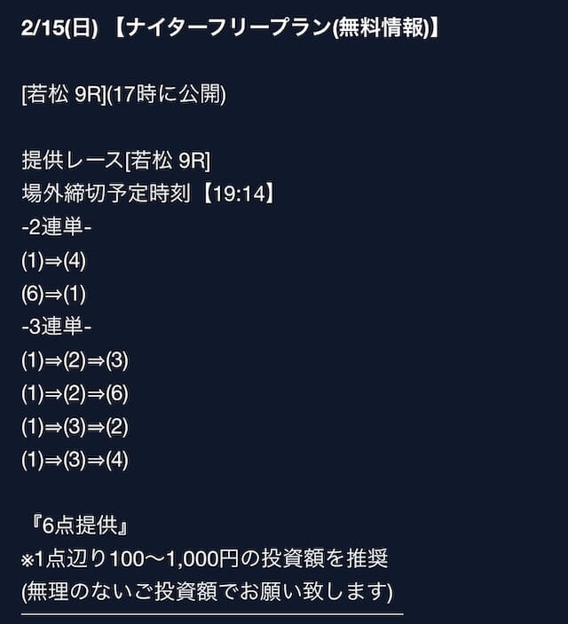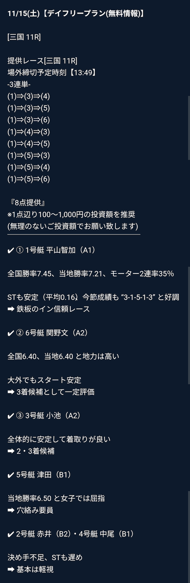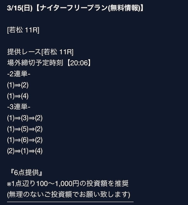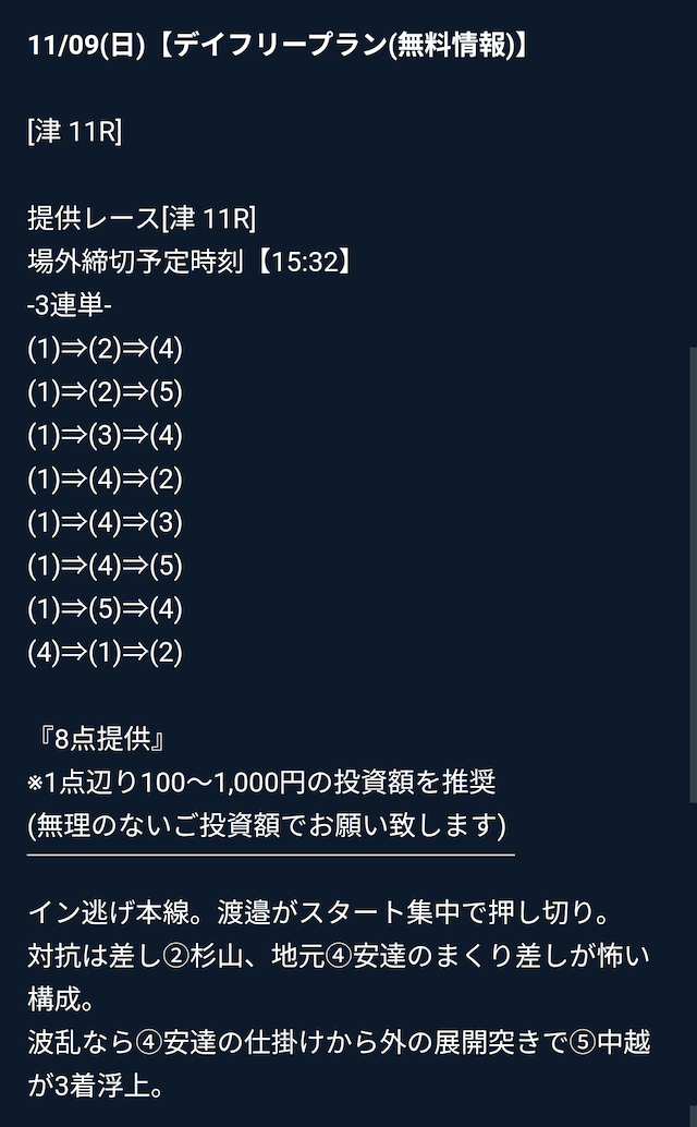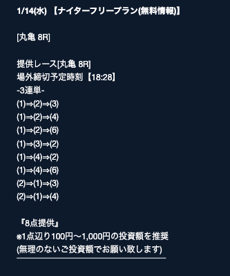 匿名最初は裏があるんじゃないかと疑ってましたけど、今は安心して使ってます。 特に週末は3戦2勝くらいのペースで来てるので、下手な有料より使えます。投稿日:2025/08/02
