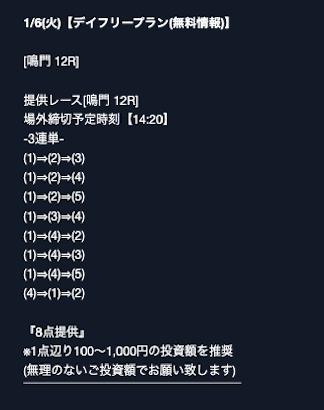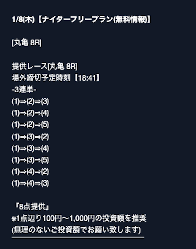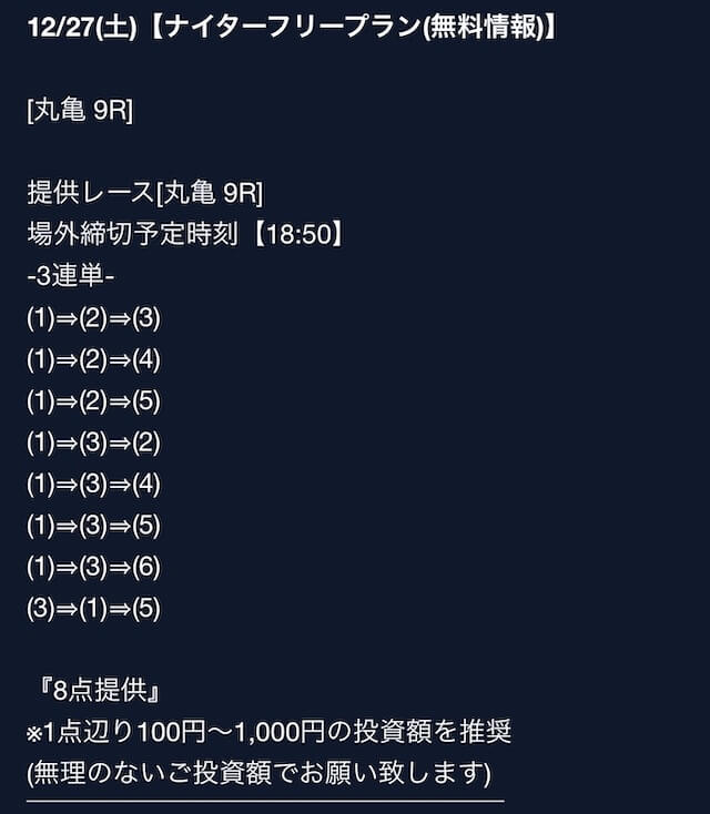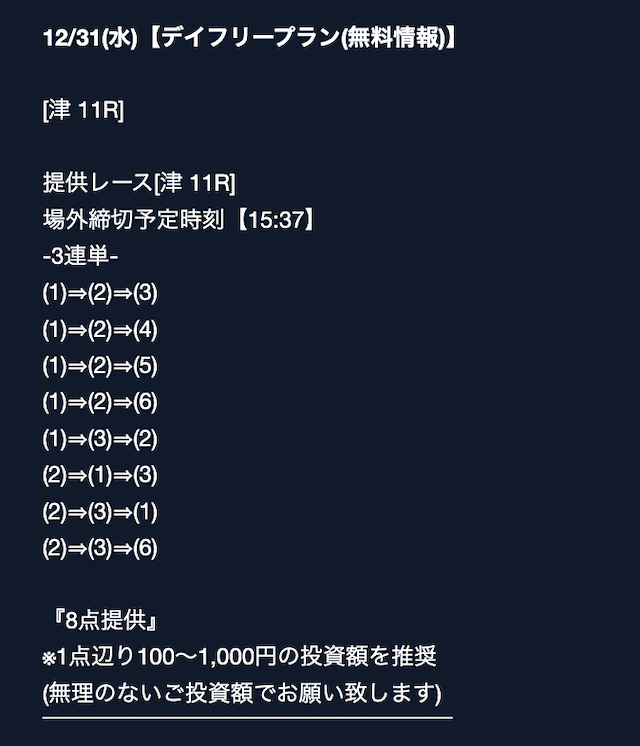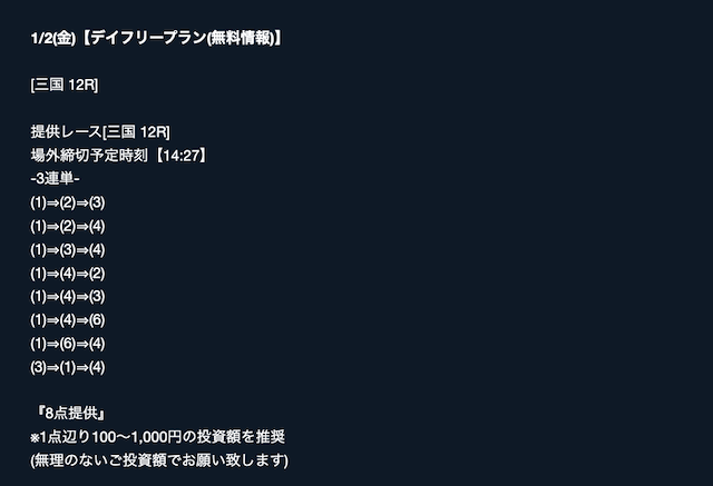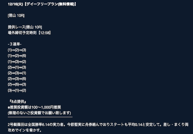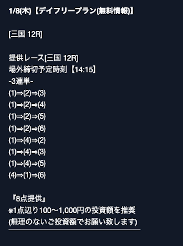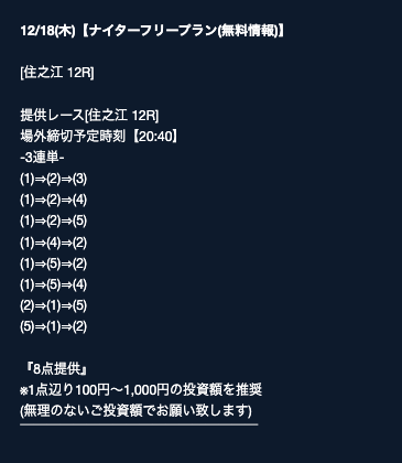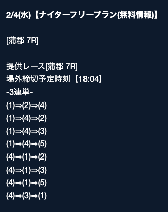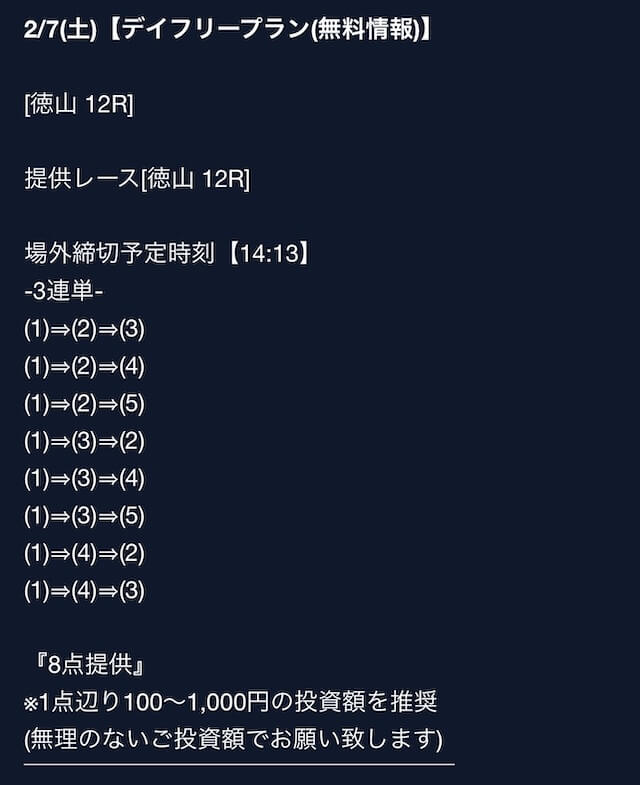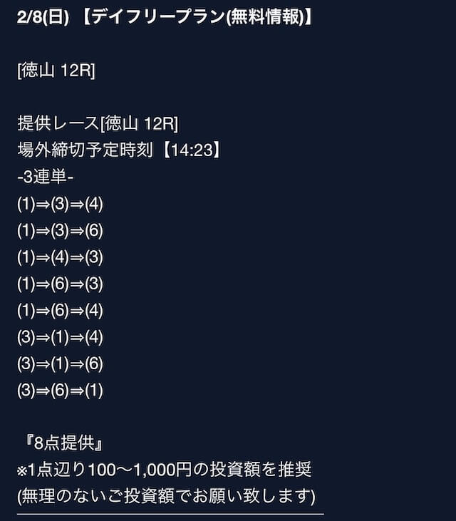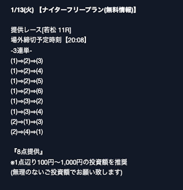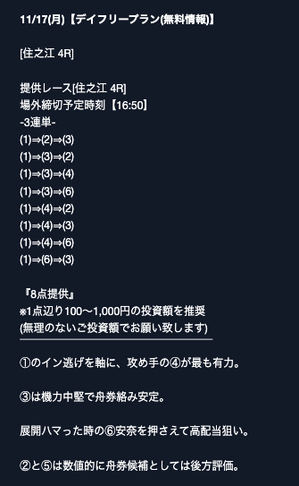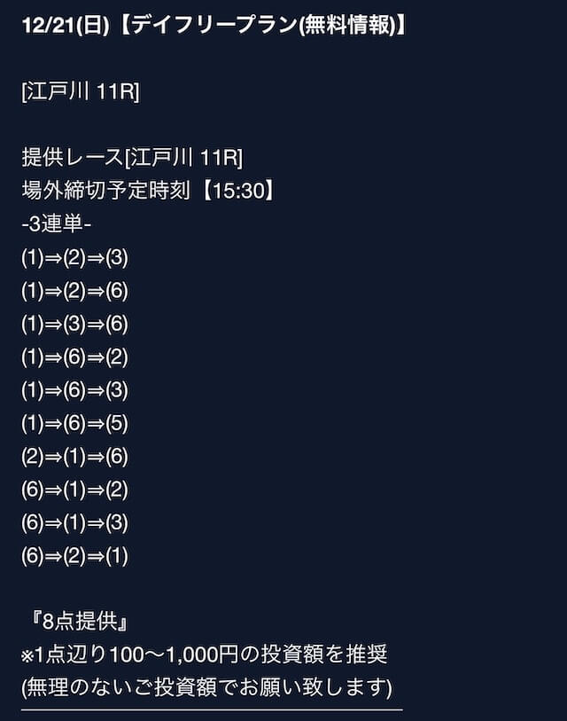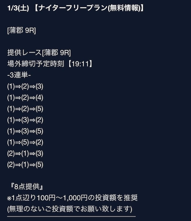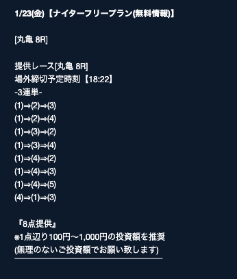 匿名最初は裏があるんじゃないかと疑ってましたけど、今は安心して使ってます。 特に週末は3戦2勝くらいのペースで来てるので、下手な有料より使えます。投稿日:2025/08/02