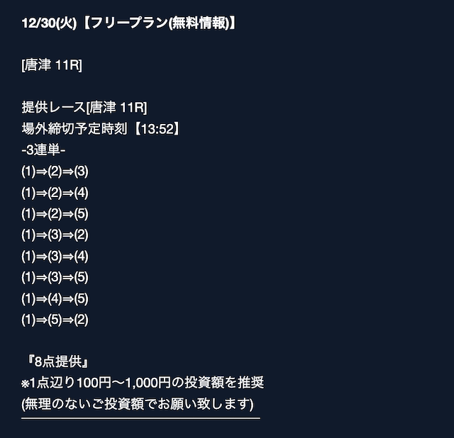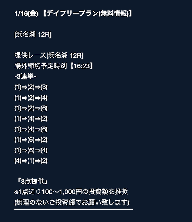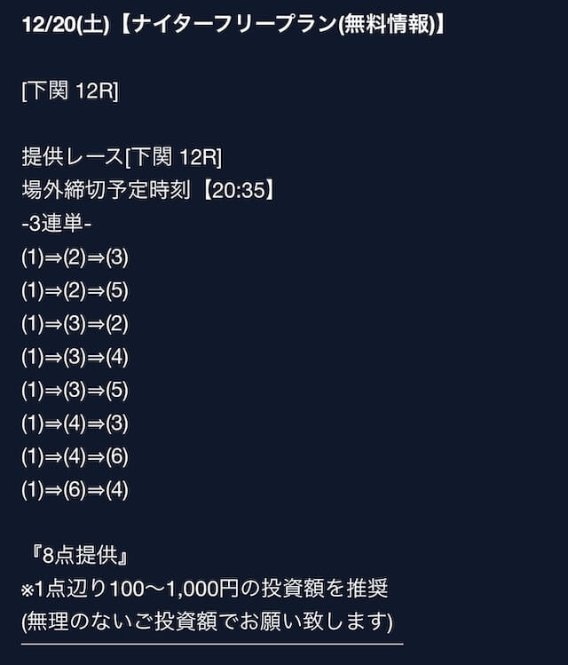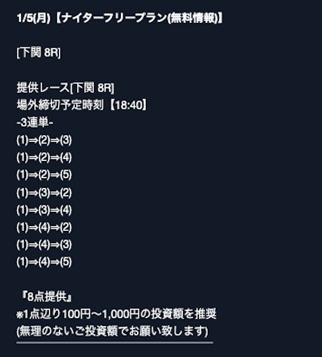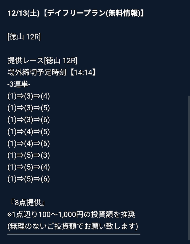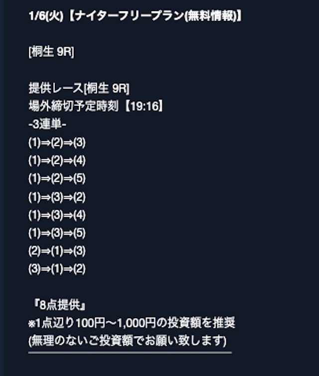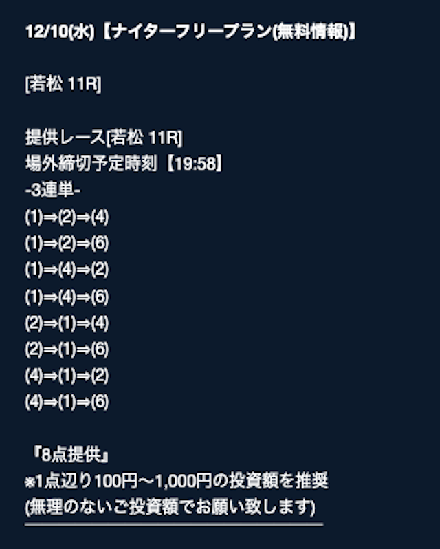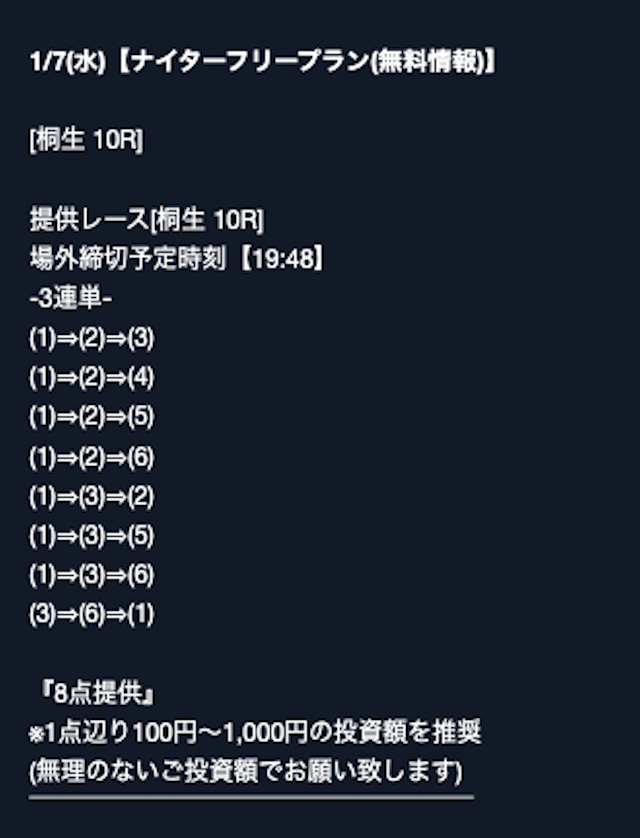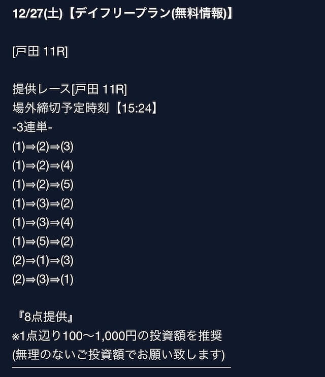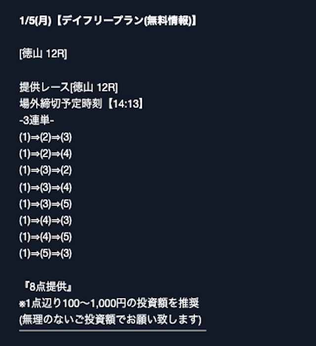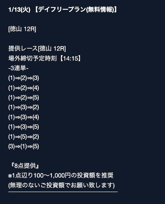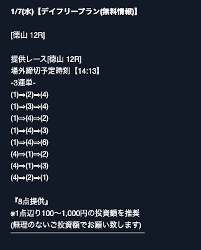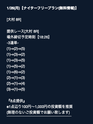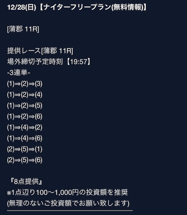 匿名最初は裏があるんじゃないかと疑ってましたけど、今は安心して使ってます。 特に週末は3戦2勝くらいのペースで来てるので、下手な有料より使えます。投稿日:2025/08/02